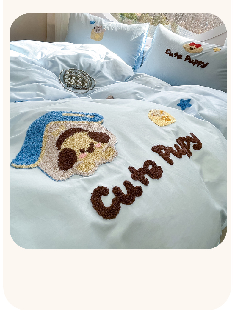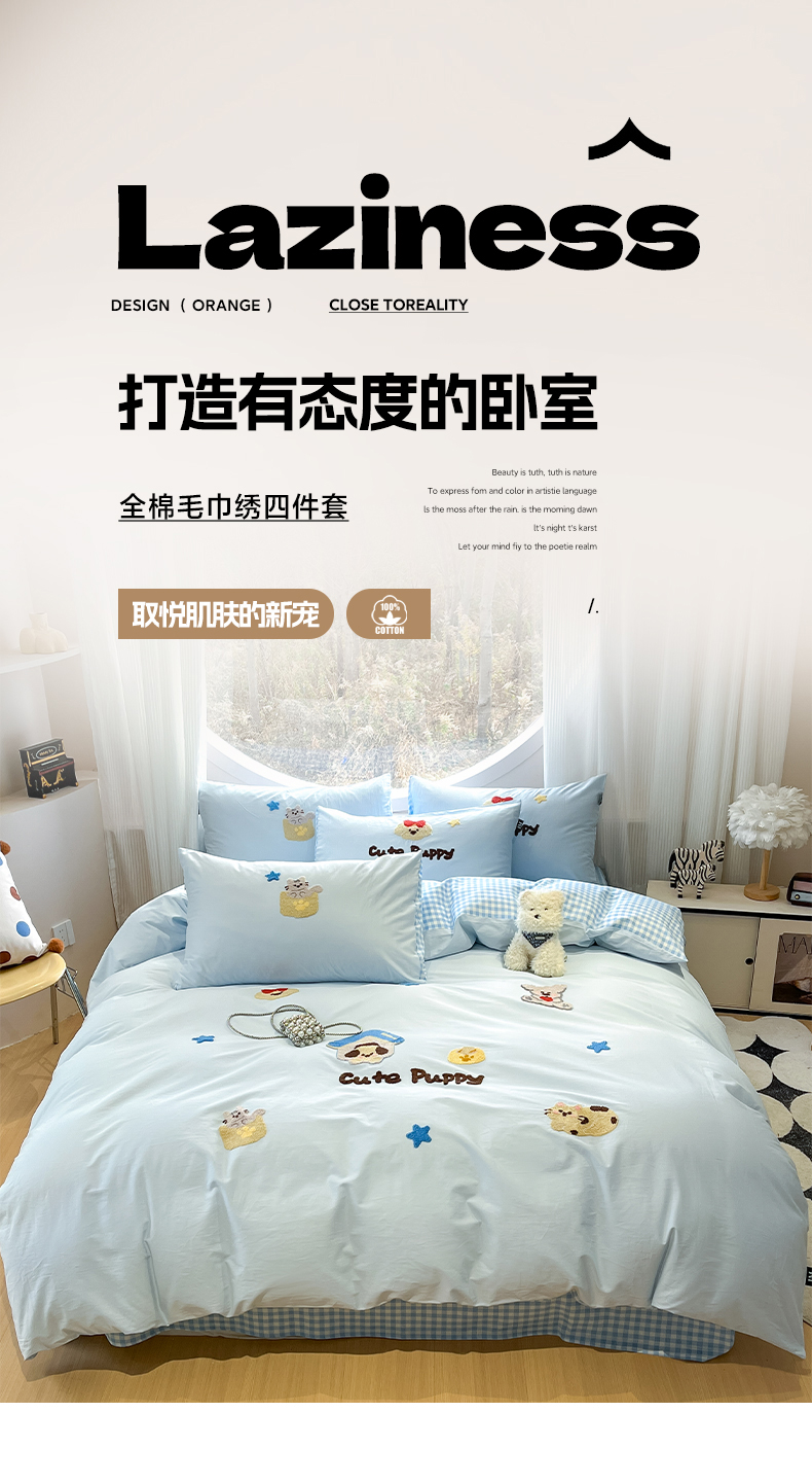乐美家纺 2026新款春夏软萌全棉毛巾绣系列四件套 房子小狗狗