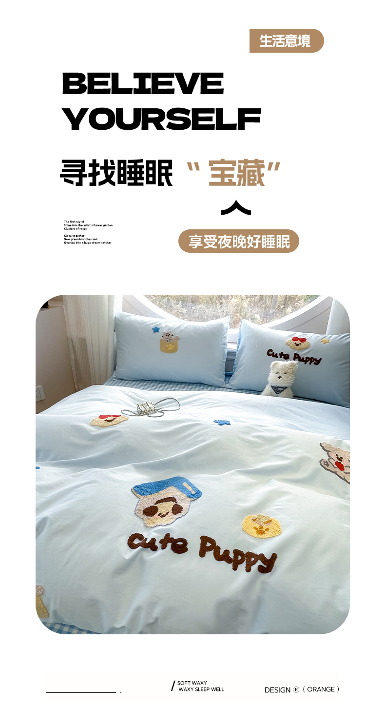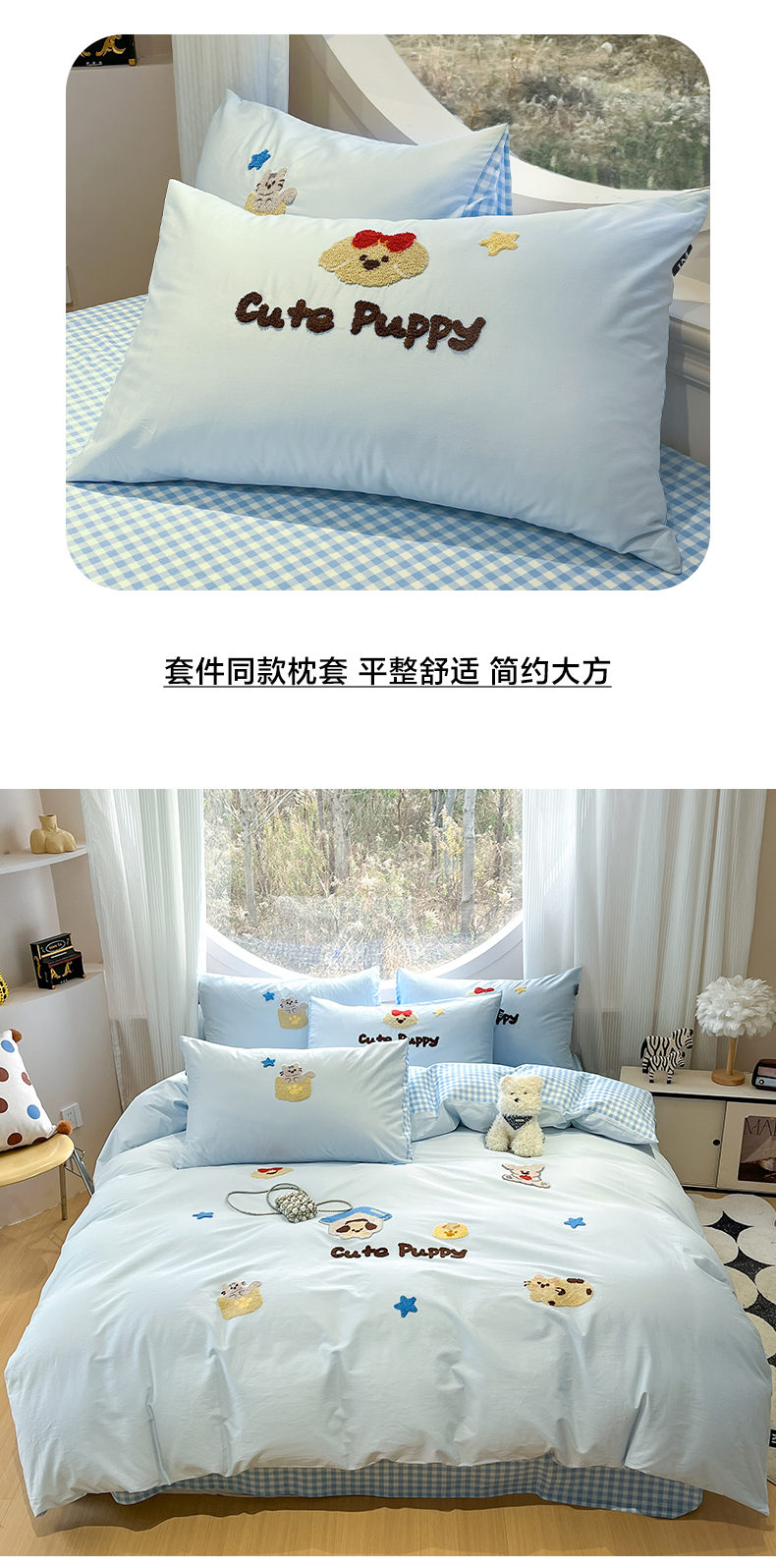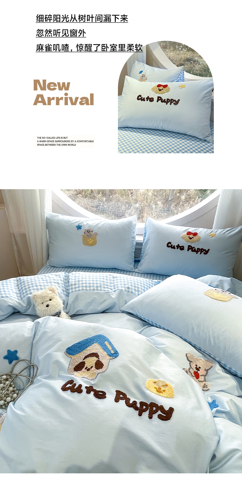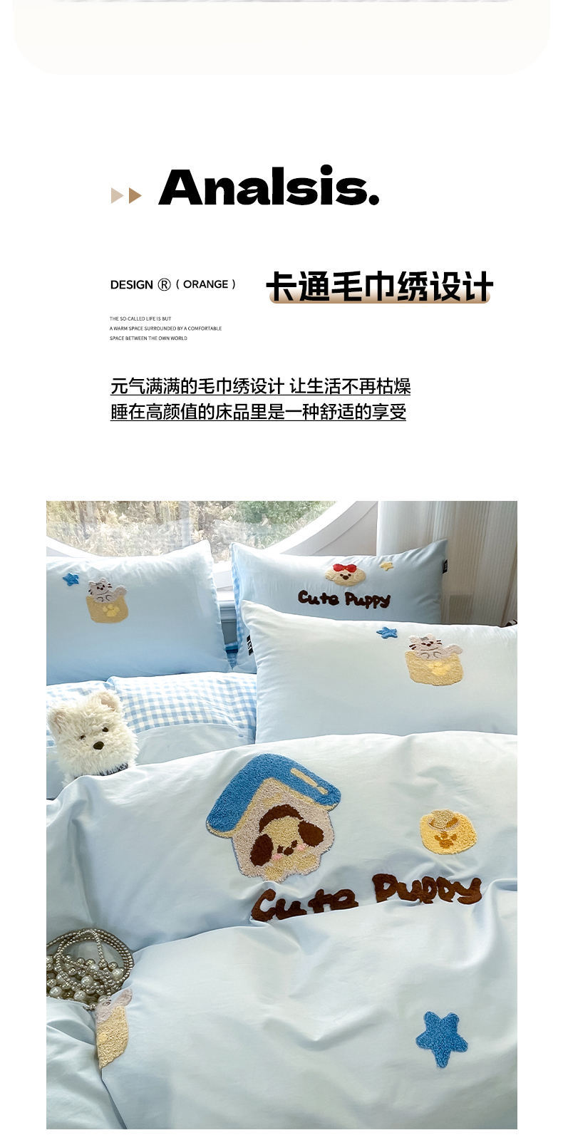 商品名称:乐美家纺 2026新款春夏软萌全棉毛巾绣系列四件套 房子小狗狗