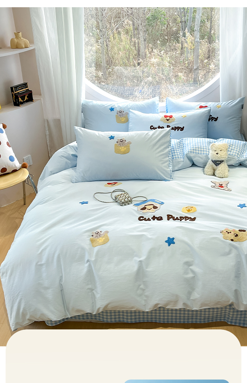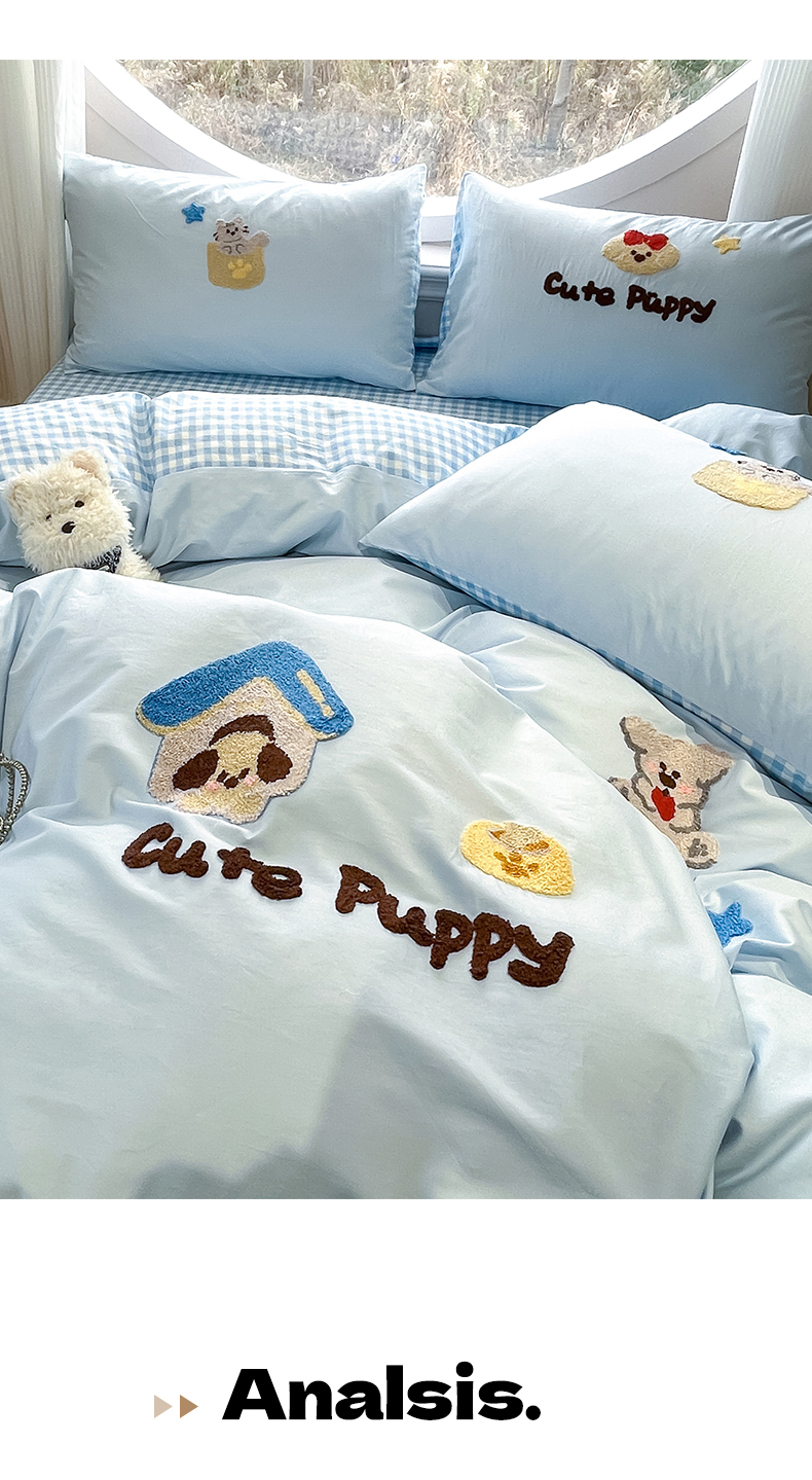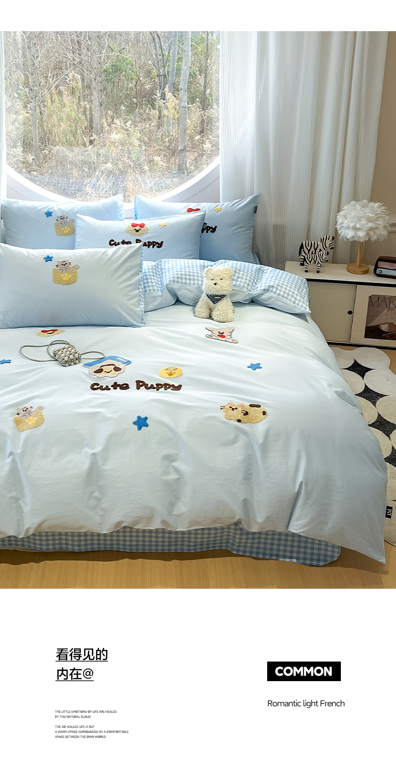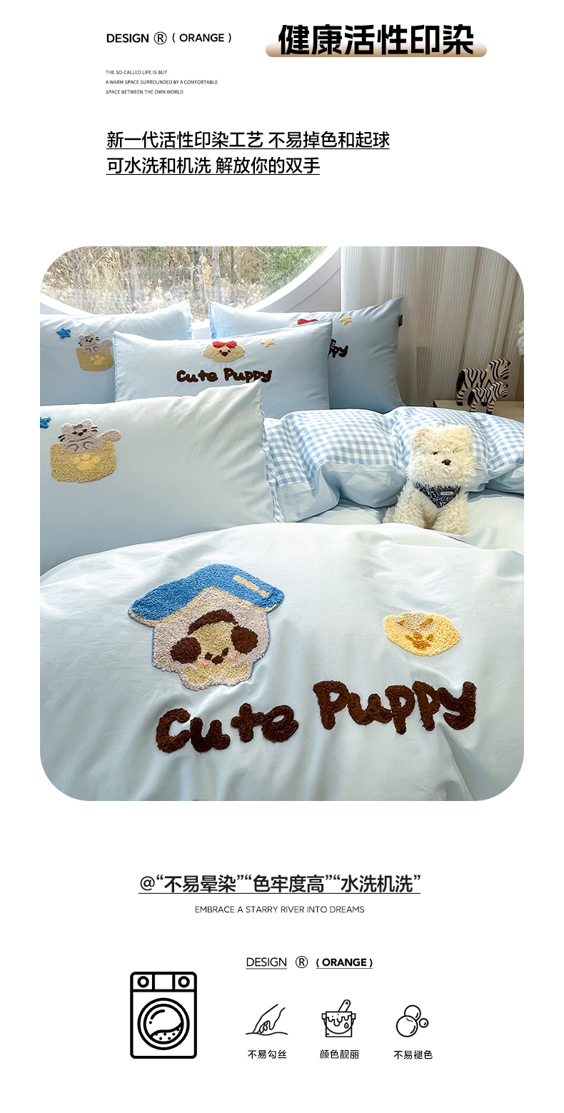 商品名称:乐美家纺 2026新款春夏软萌全棉毛巾绣系列四件套 房子小狗狗