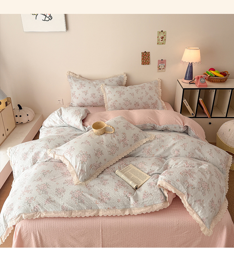 商品名称:吾欢心 2026春夏新款韩版纯棉花边泡芙双层纱四件套 费尔岛小兔