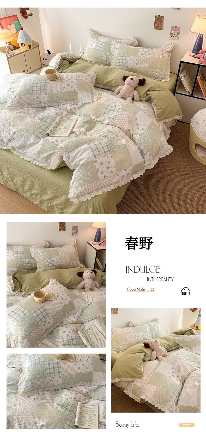 (总)吾欢心 2025新款小香风可可小姐系列花边四件套,可可奶茶绿,可可奶昔粉,可可柠檬黄,可可温柔紫,可可樱桃粉
