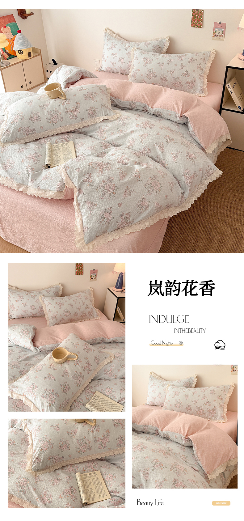 商品名称:吾欢心 2026春夏新款韩版纯棉花边泡芙双层纱四件套 茱莉叶