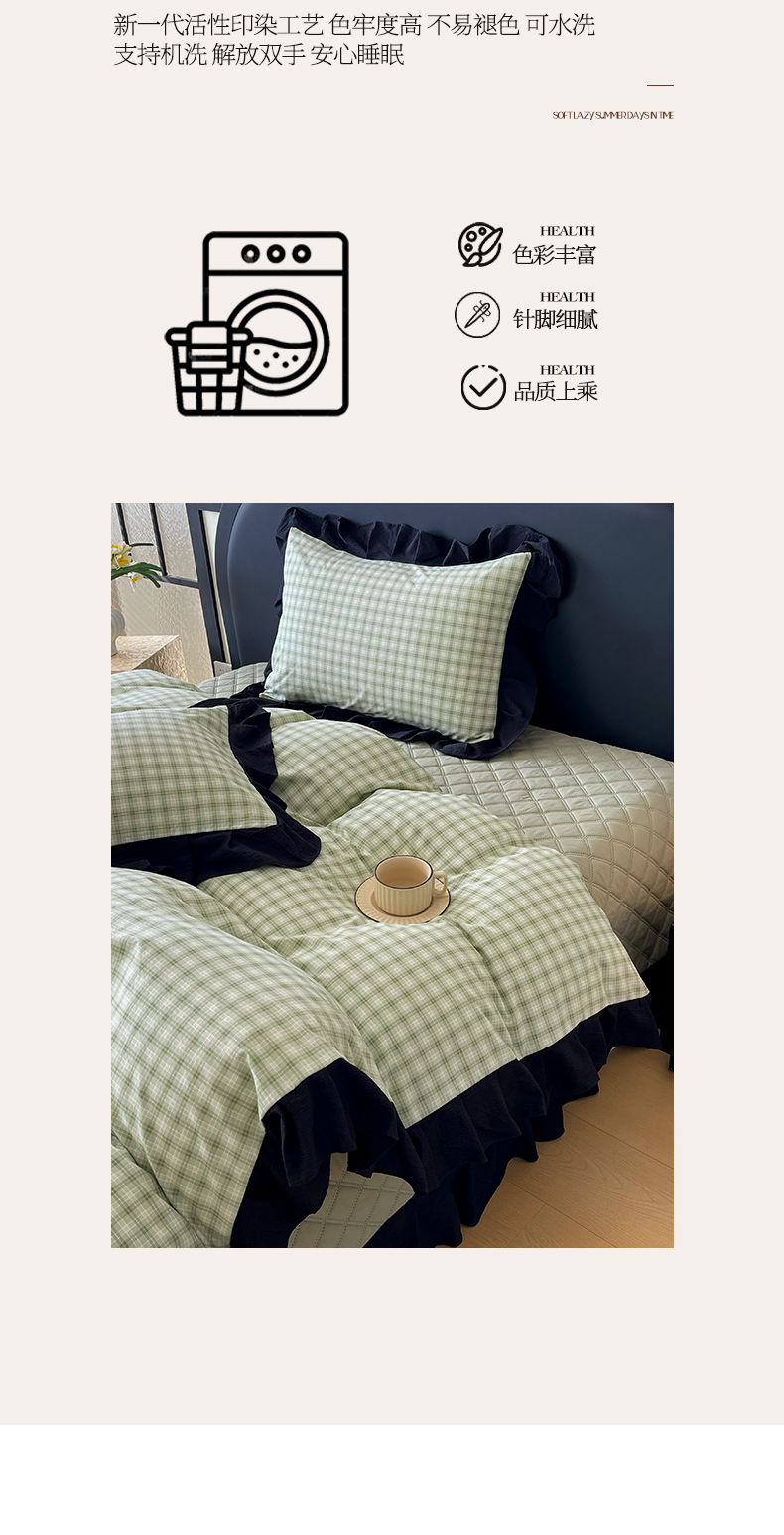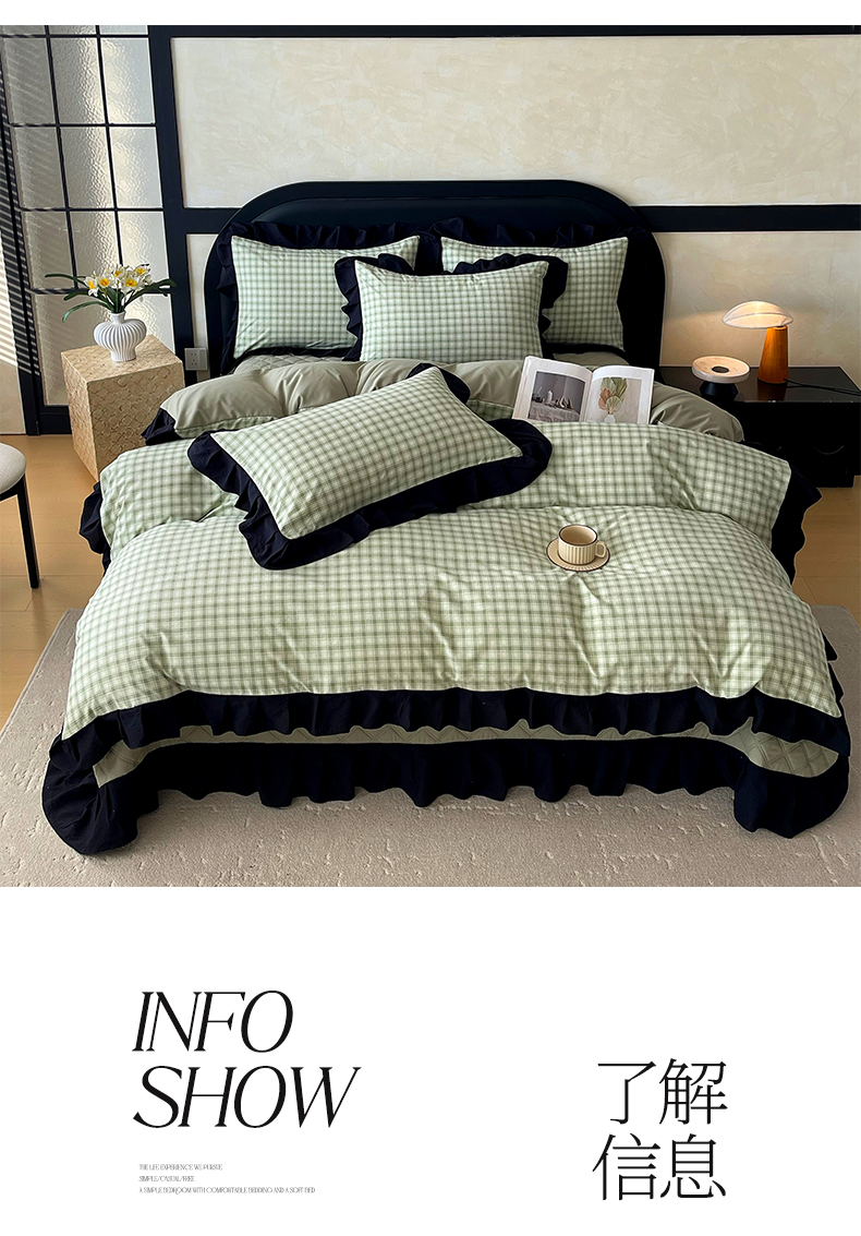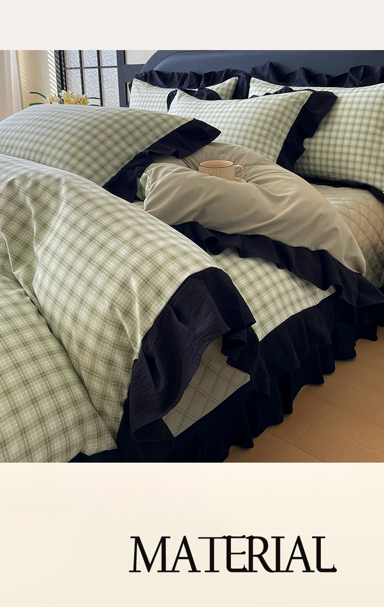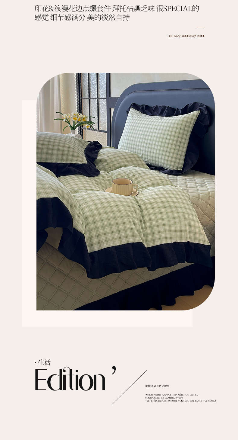 商品名称:锦彩家居 2026新款花边格子复古风夹棉床盖四件套-西西里岛系列 西西里岛-藤绿