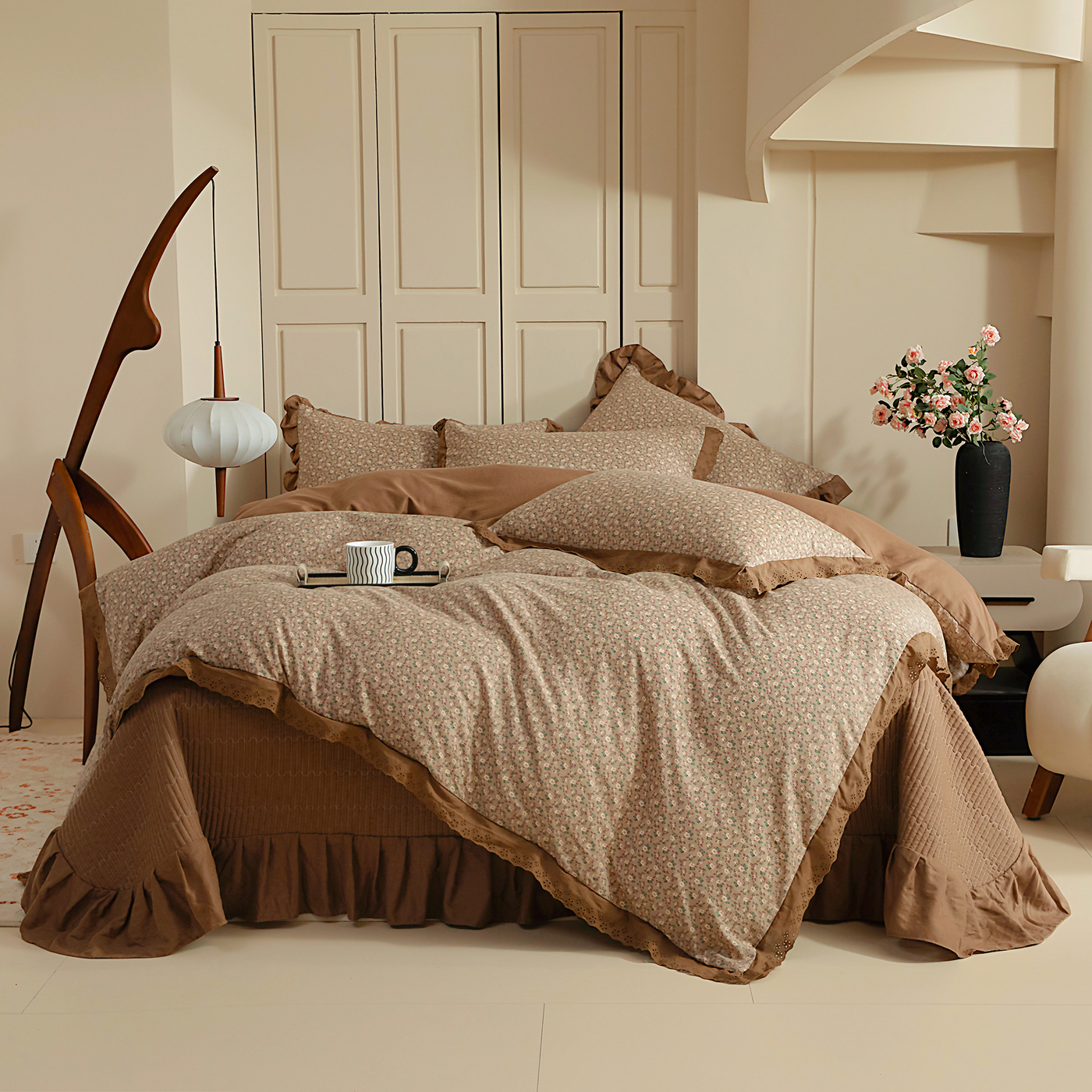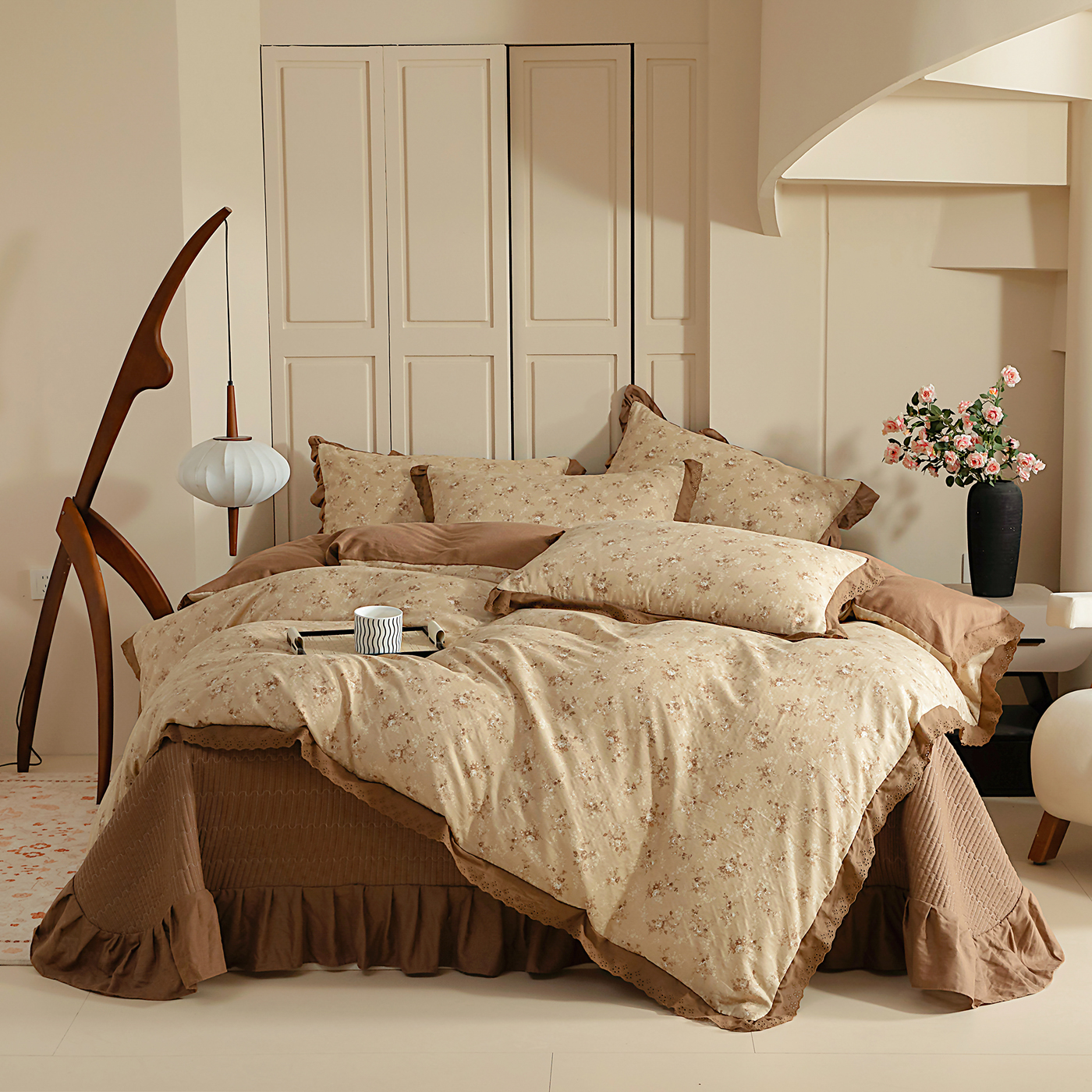 (总)情煊家纺 2026新款全棉双层纱单品床盖,焦糖,奶油黄,深咖,仙霞,胭脂红