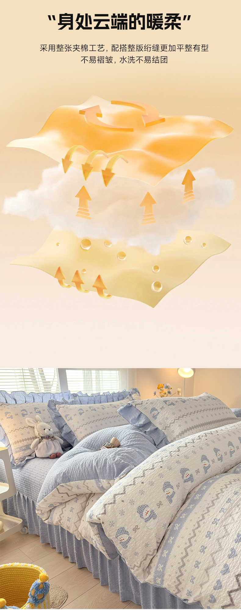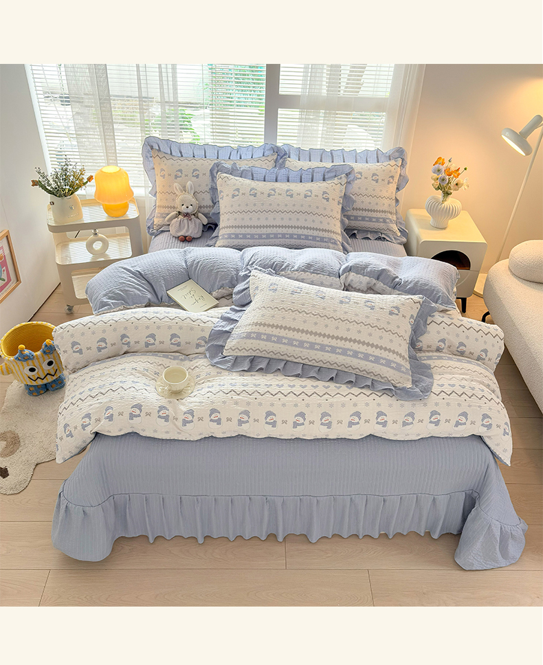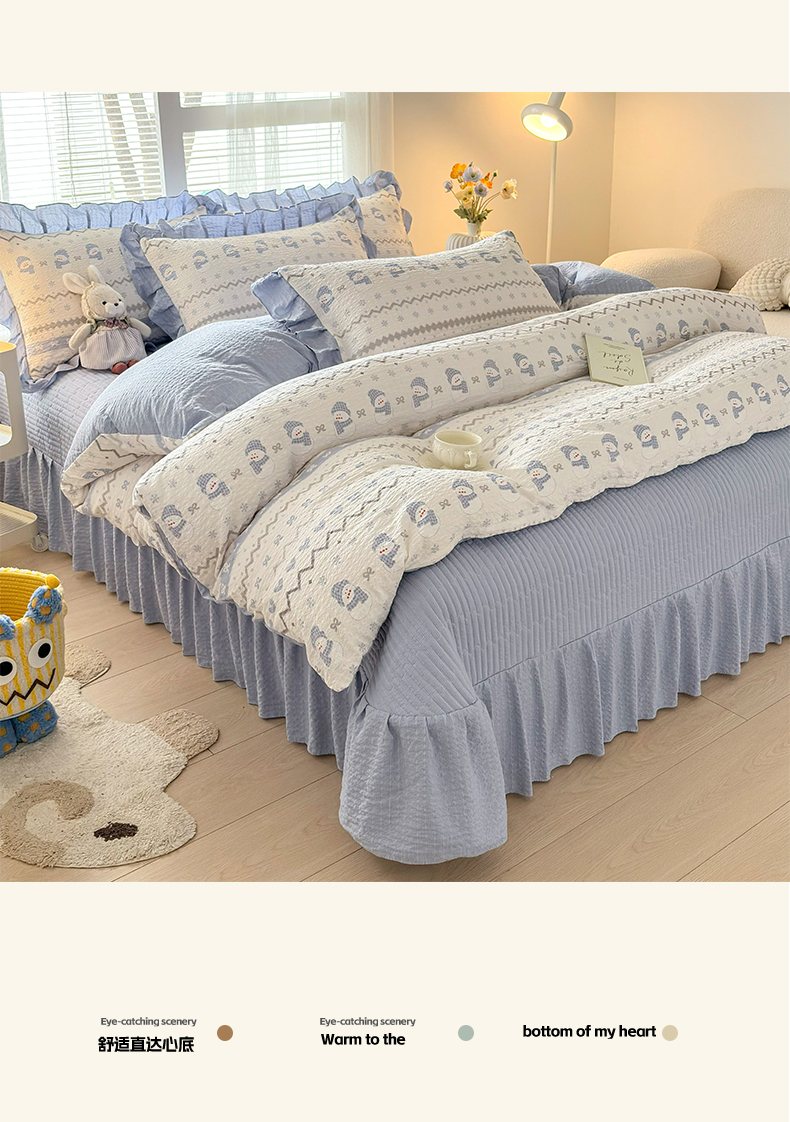 商品名称:民新家纺 2026新款泡芙双层纱床盖款四件套 小雪人-蓝
