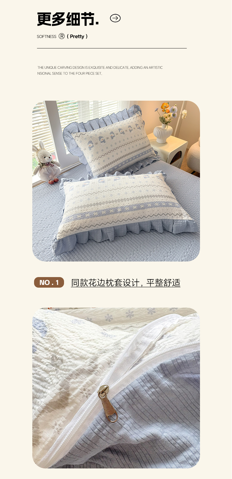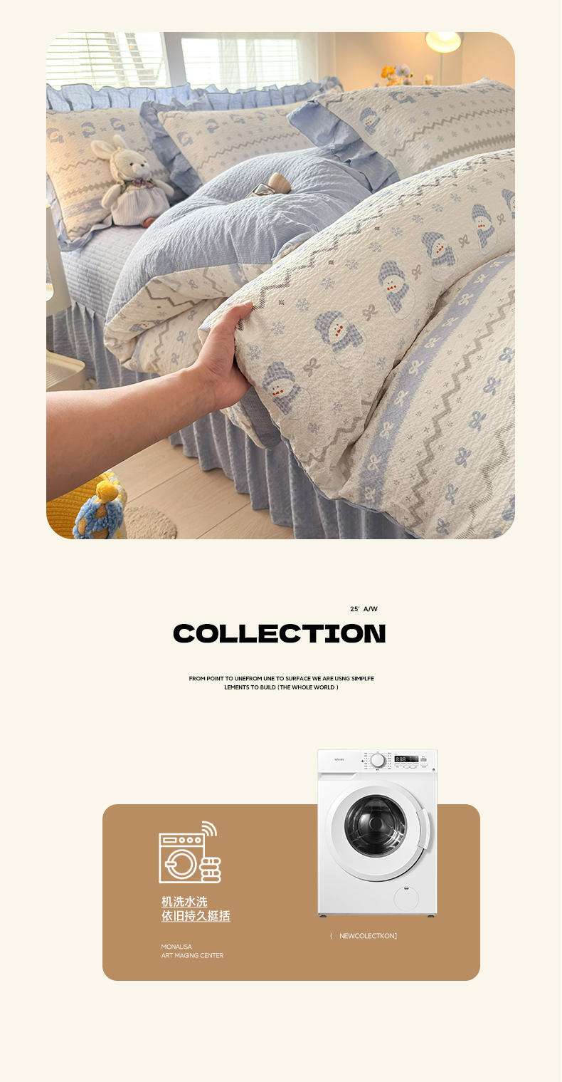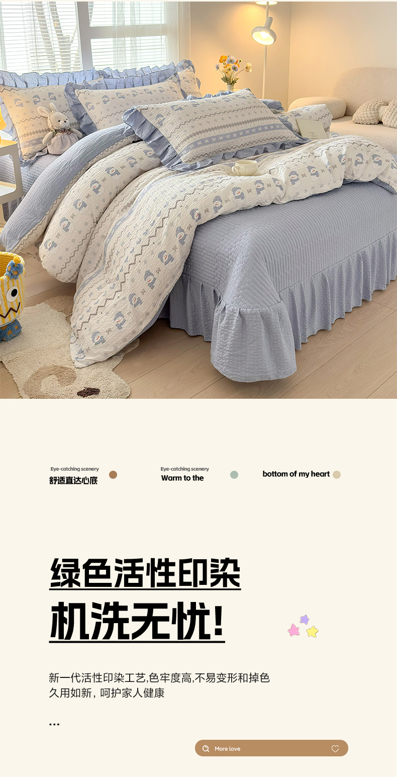 商品名称:民新家纺 2026新款泡芙双层纱床盖款四件套 小雪人-蓝