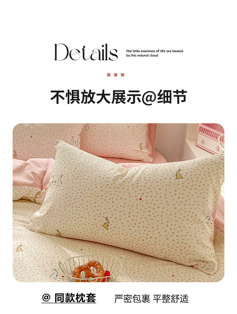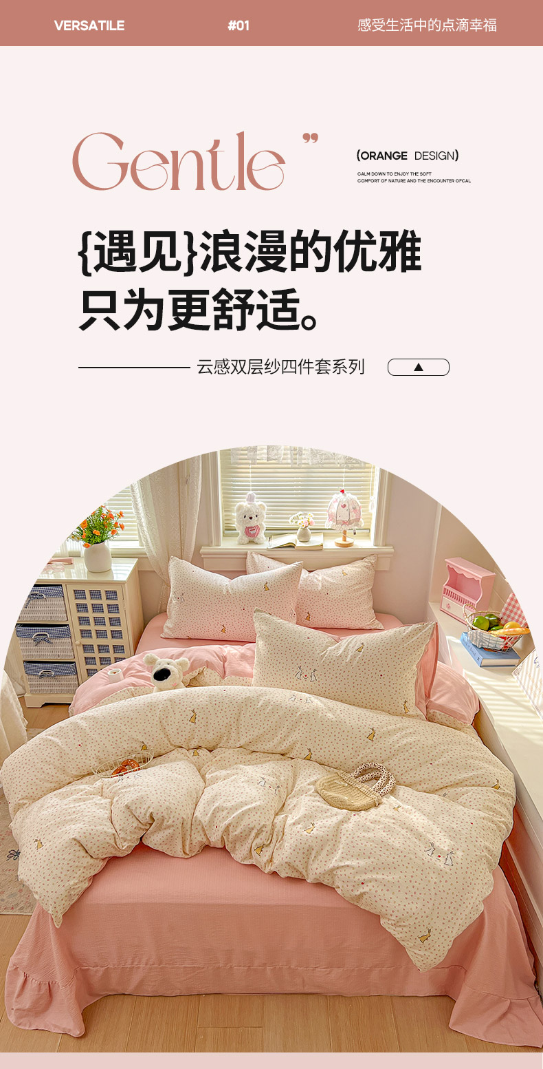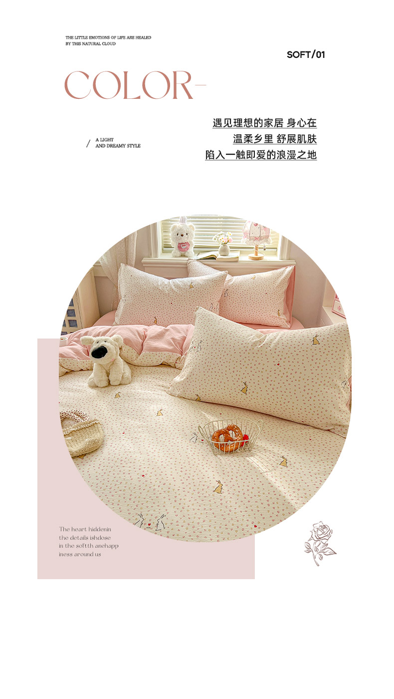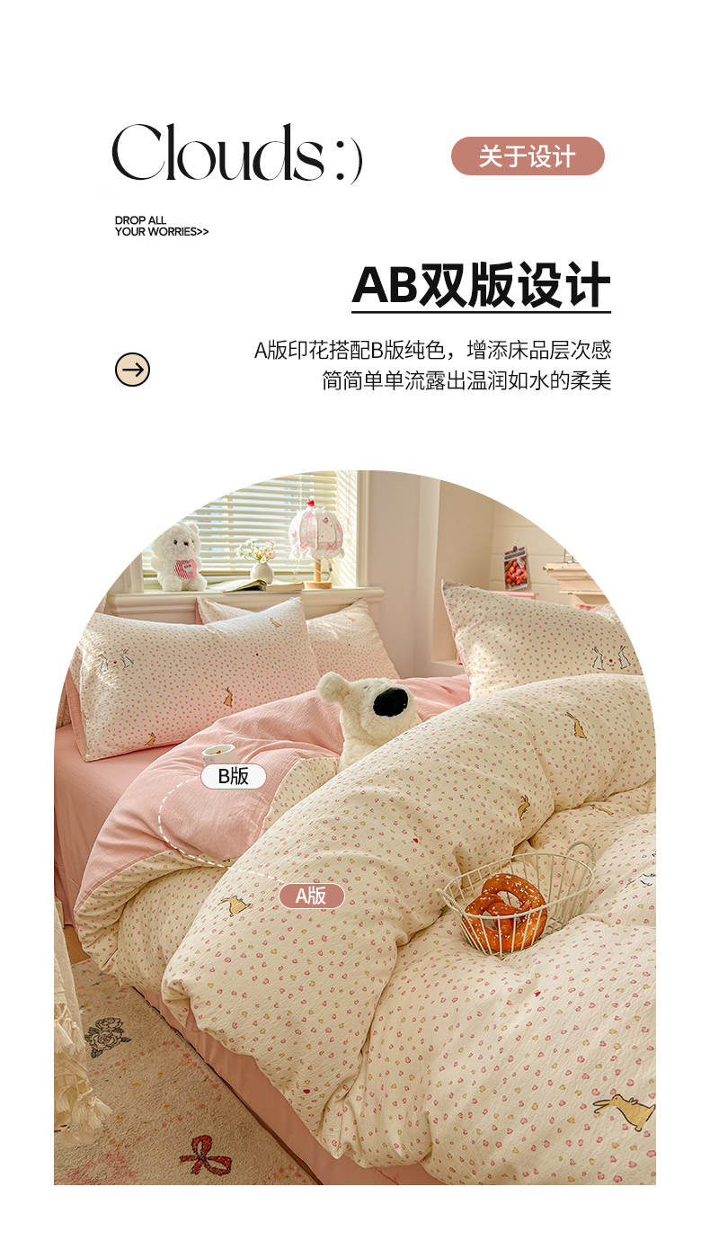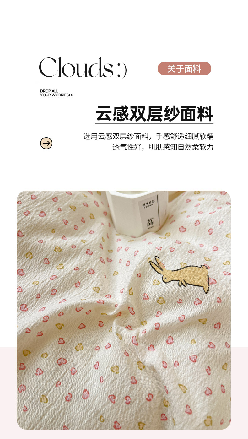 当前位置: 91家纺网 > 商品网购 > 床品套件 > 四件套 > 其它四件套 > 金梦拉家纺 2026春夏新款云感双层纱皱皱纱系列四件套 爱心小兔