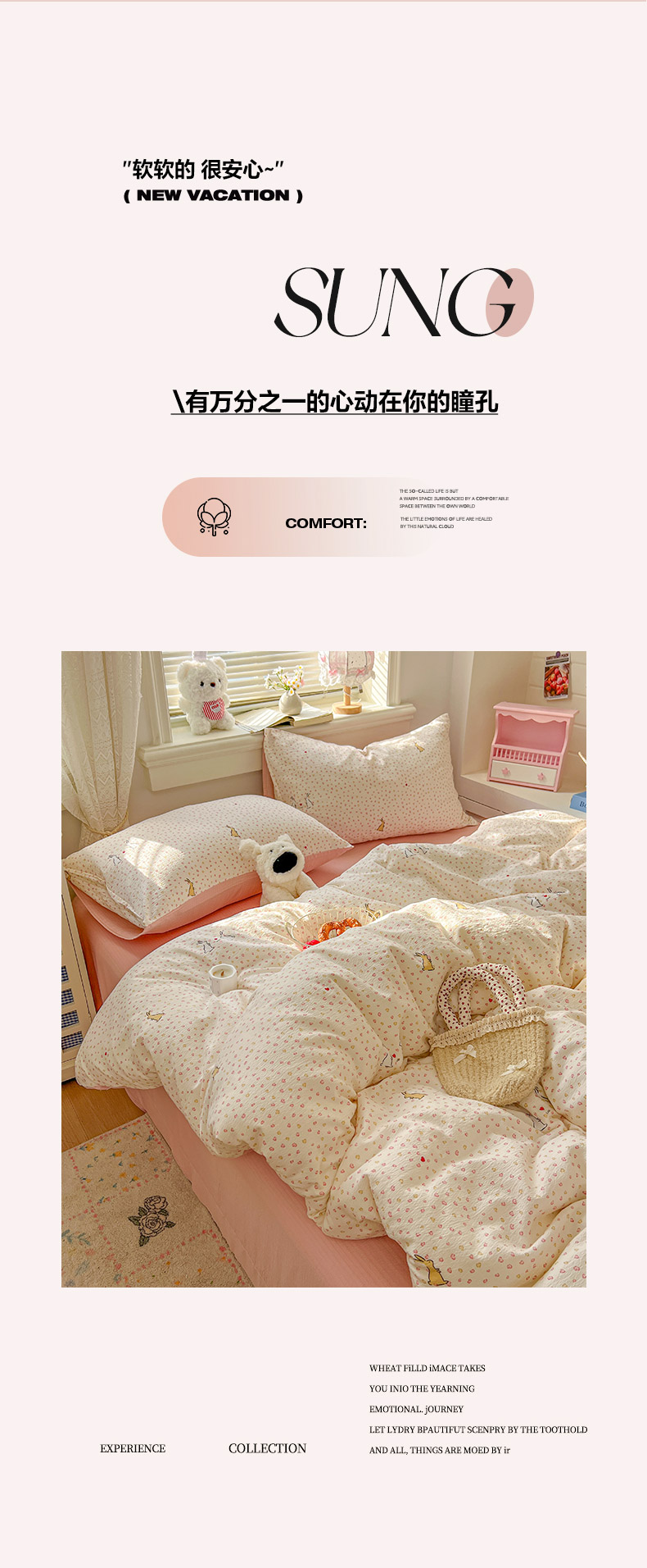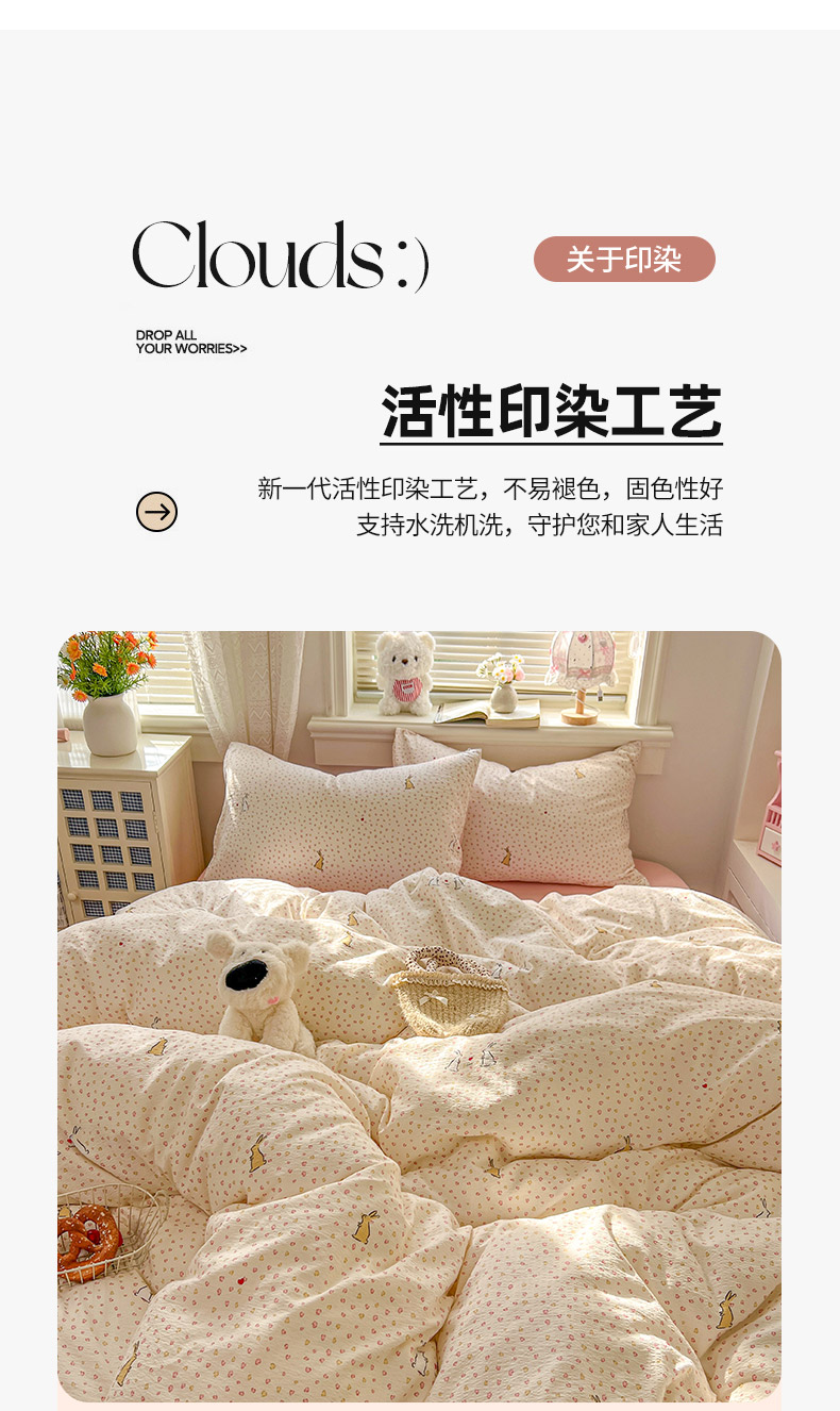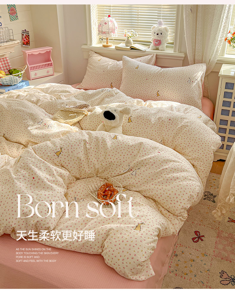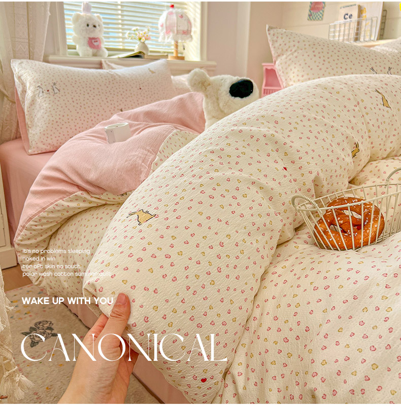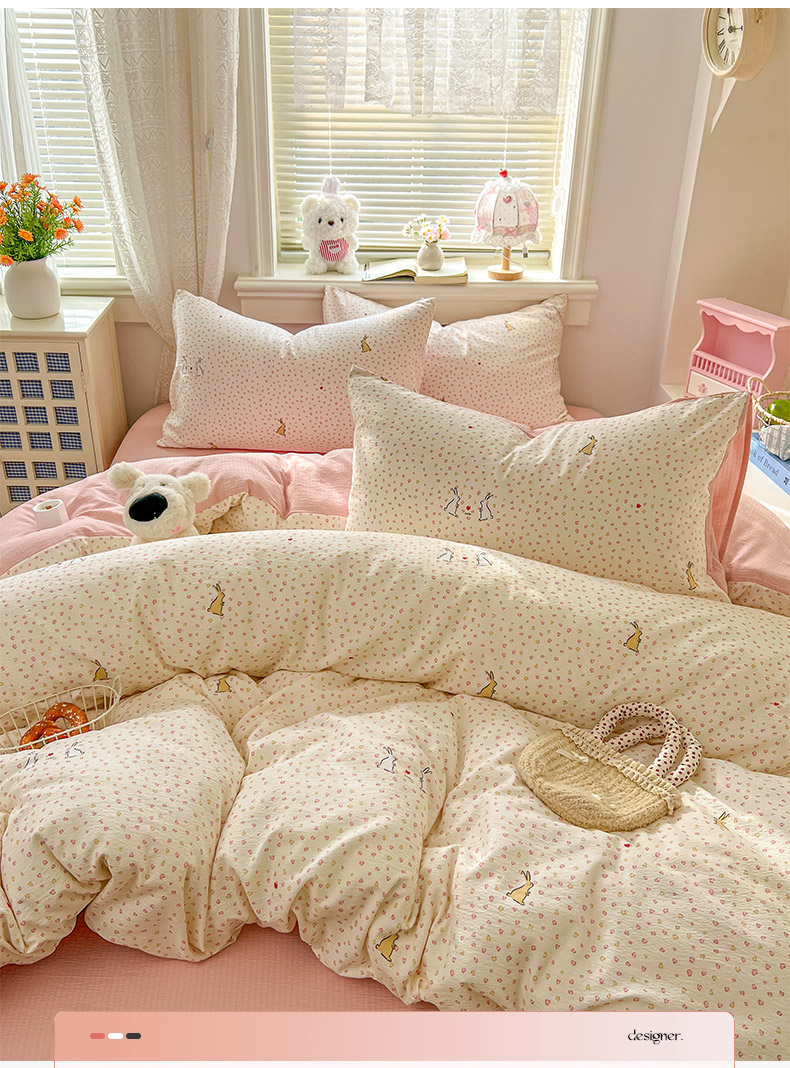 当前位置: 91家纺网 > 商品网购 > 床品套件 > 四件套 > 其它四件套 > 金梦拉家纺 2026春夏新款云感双层纱皱皱纱系列四件套 爱心小兔