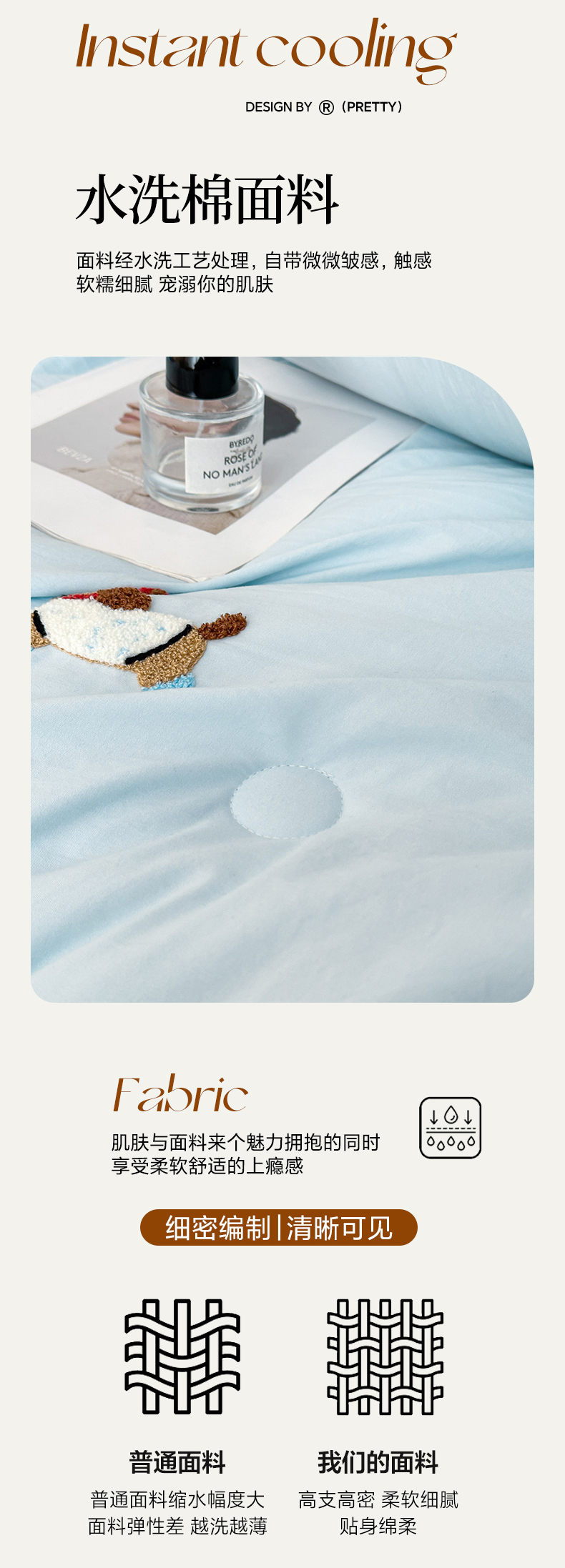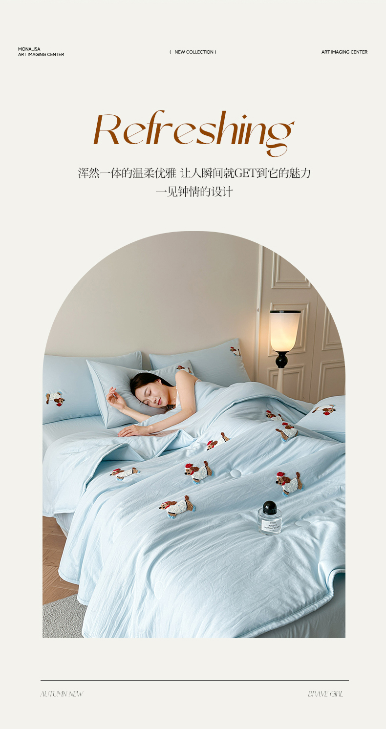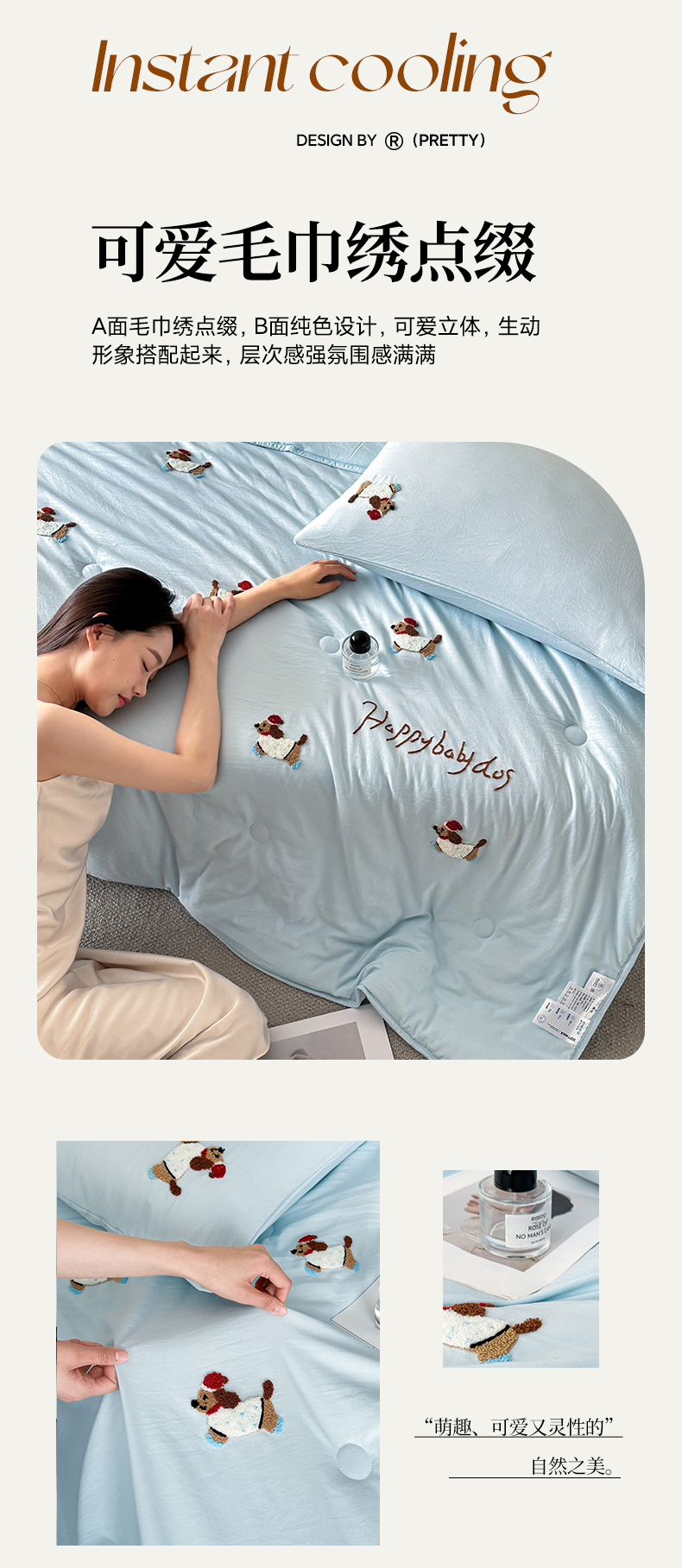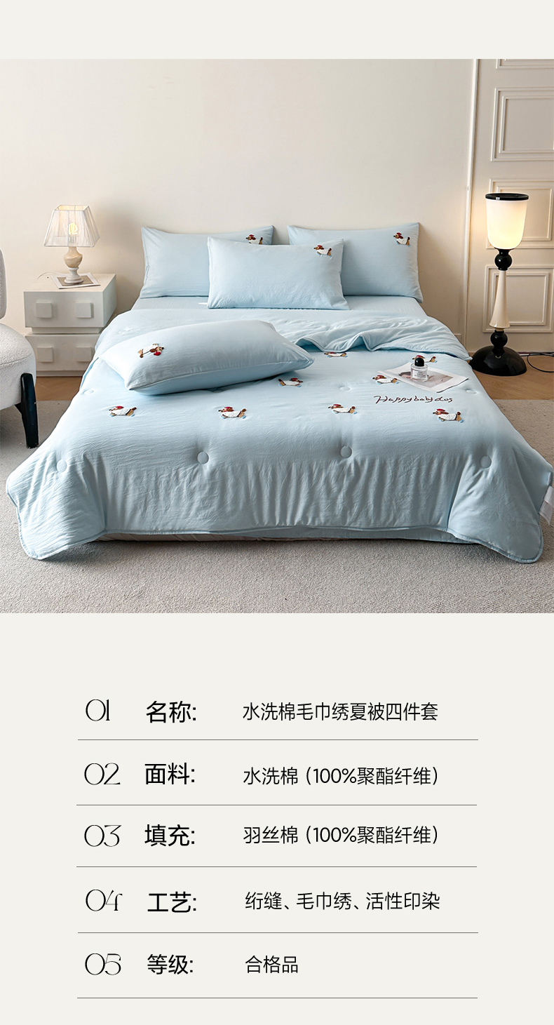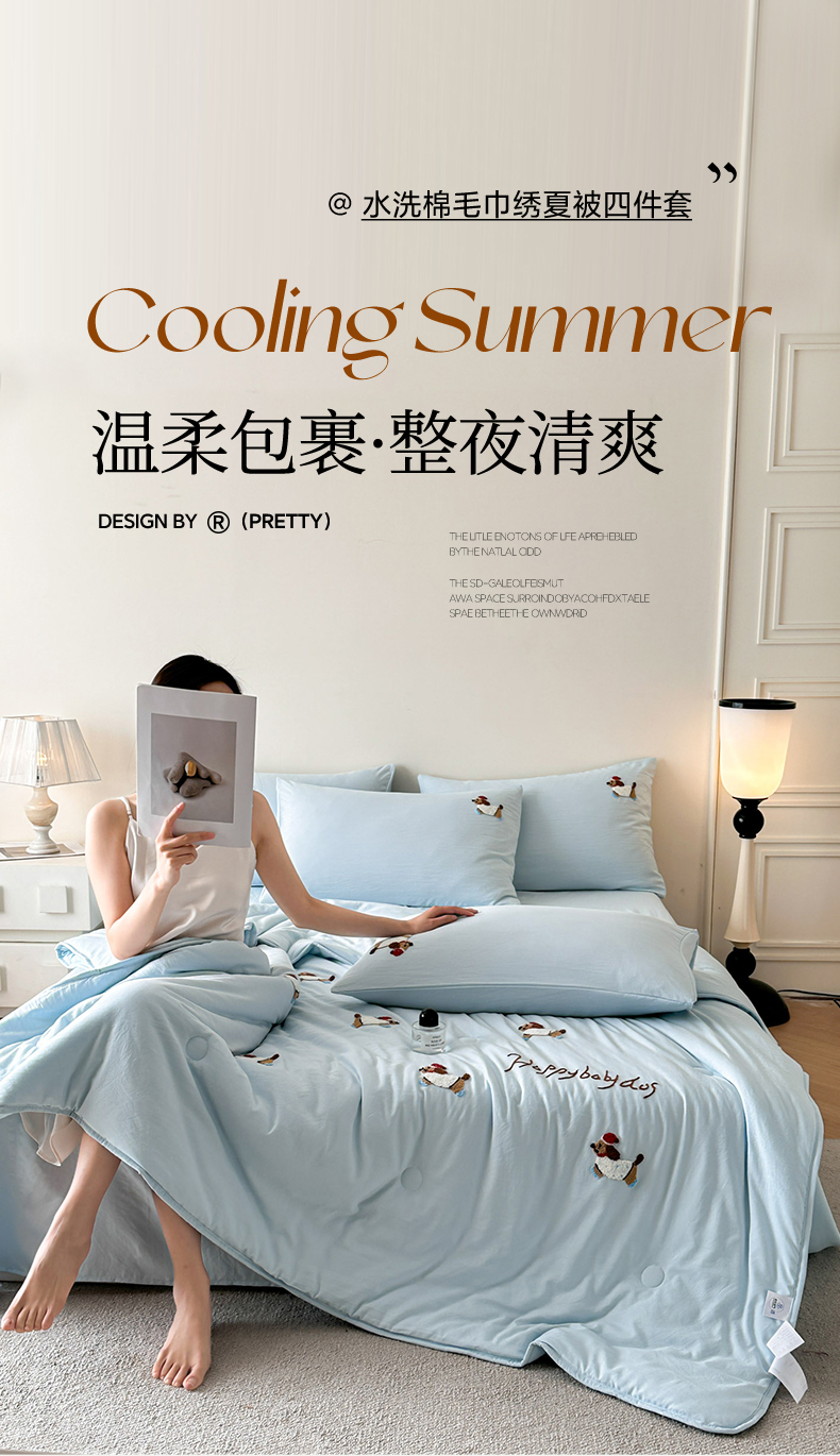 • 91家纺网 家纺一手货源 找家纺 遇见家居生活馆 2026新款水洗棉毛巾绣夏被四件套-艾拉 艾拉-小狗飘蓝