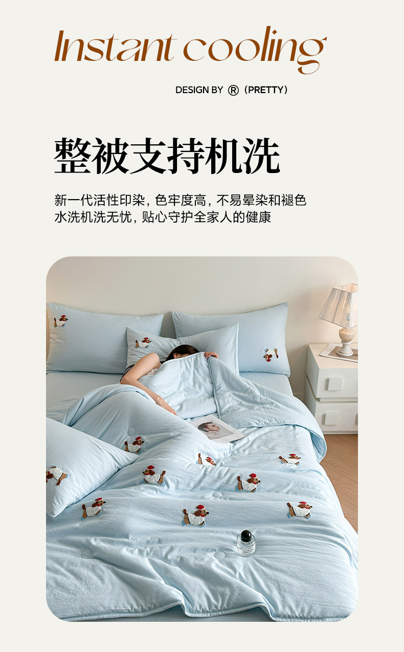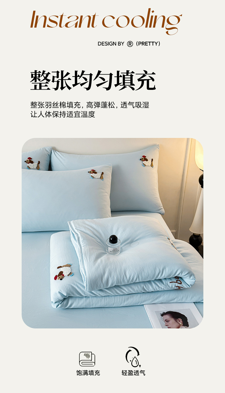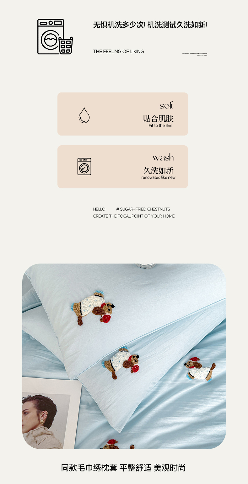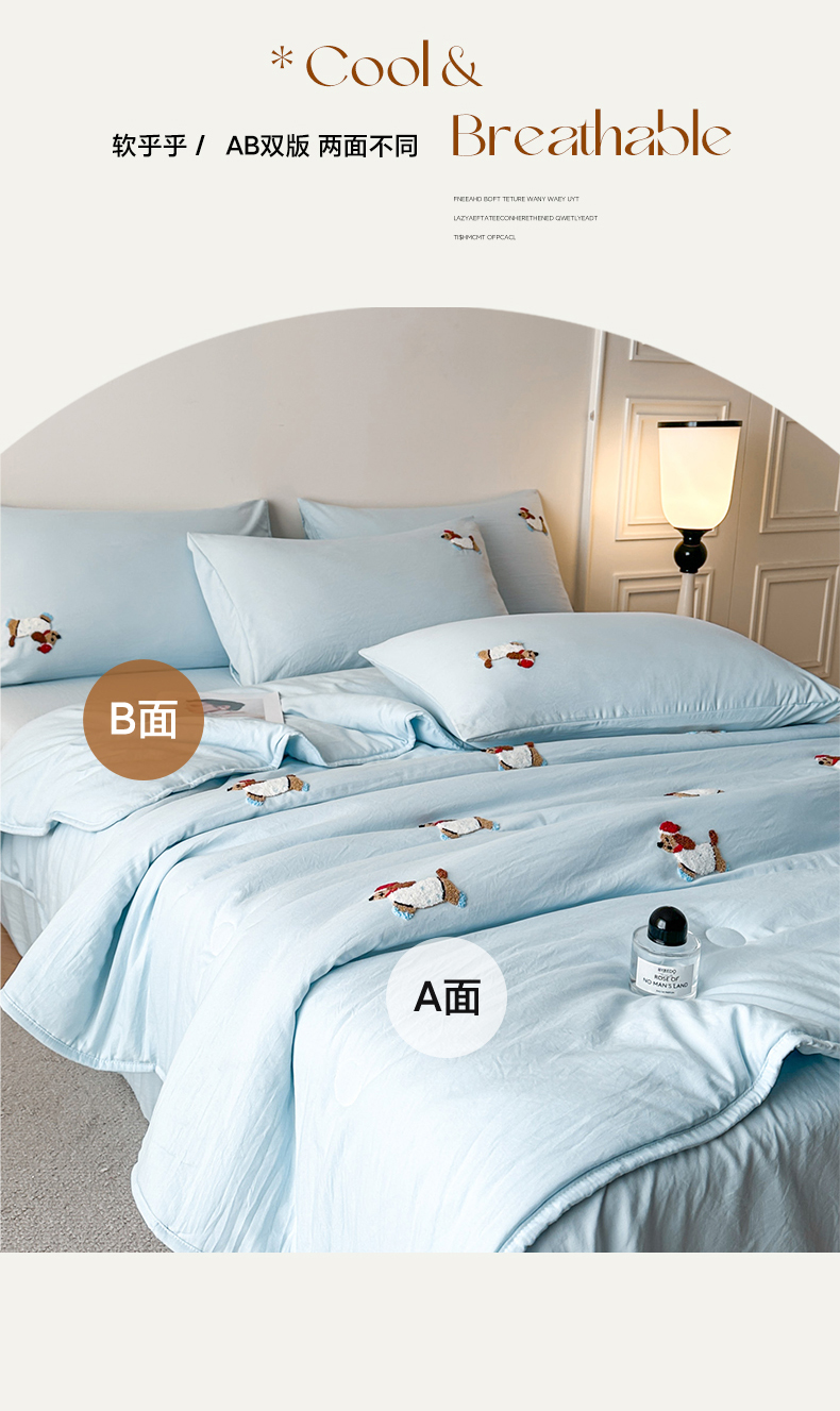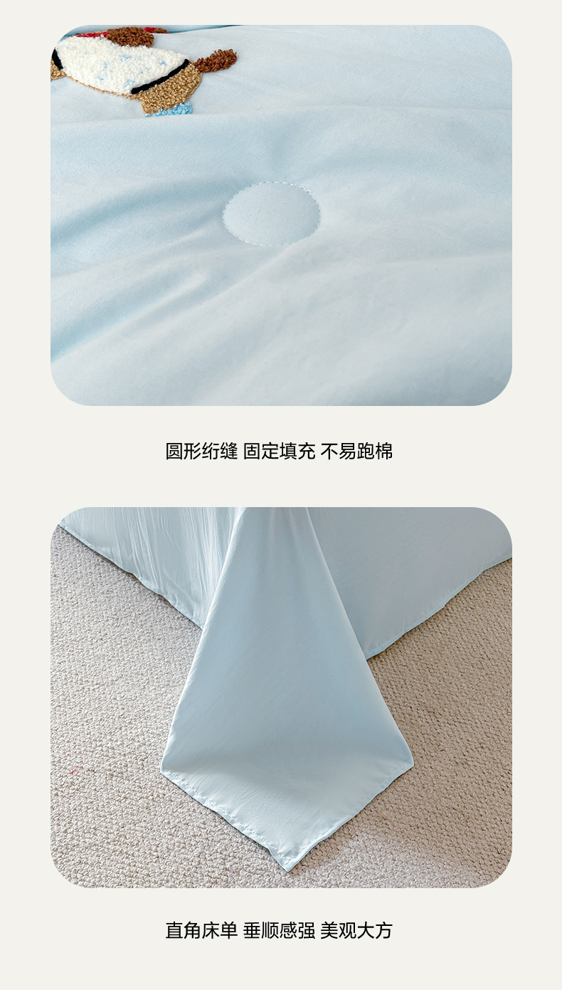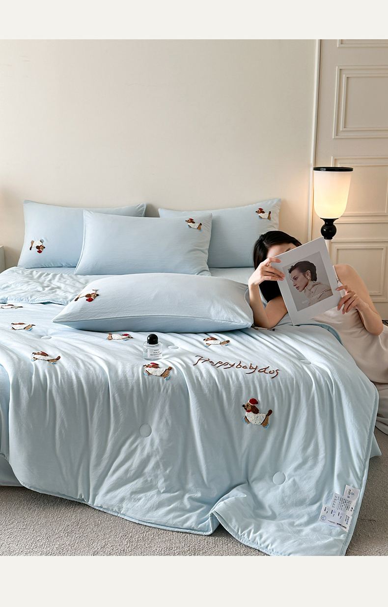 • 91家纺网 家纺一手货源 找家纺 遇见家居生活馆 2026新款水洗棉毛巾绣夏被四件套-艾拉 艾拉-小狗飘蓝
