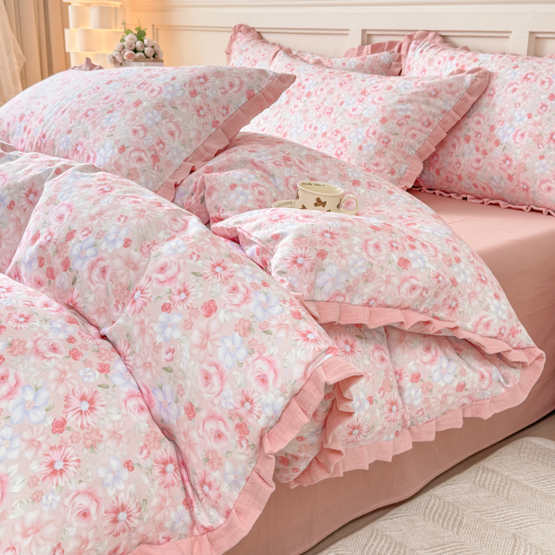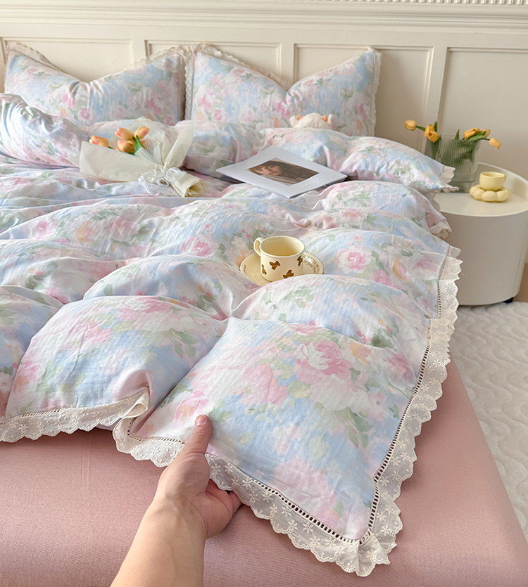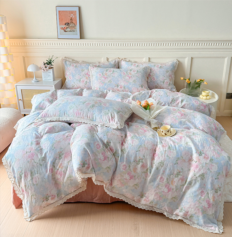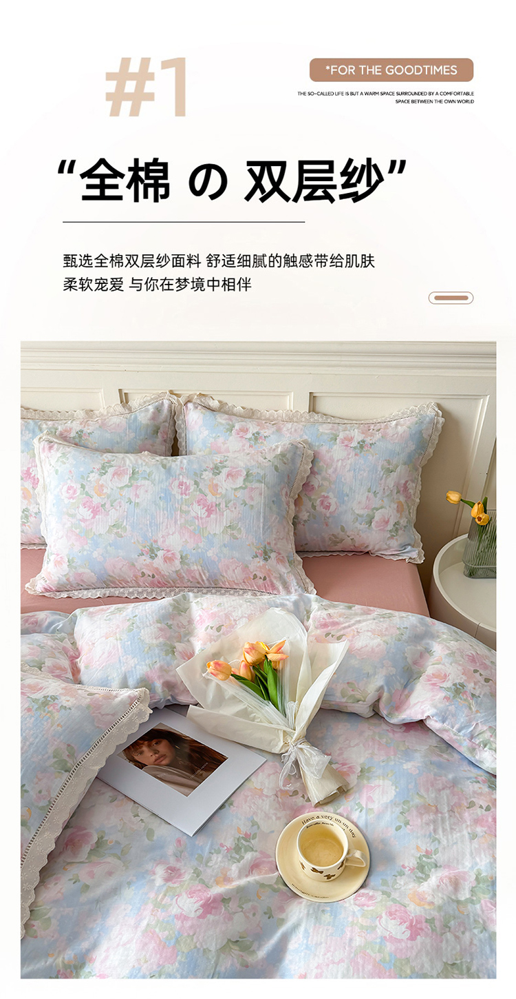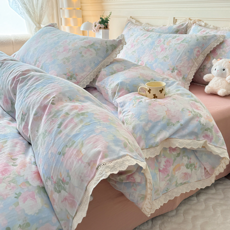 商品名称:(总)【疆东】2026韩版蕾丝花边纯棉全棉双层纱四件套印花纯棉四件套法式赫本木耳花边全棉公主双层纱四件套