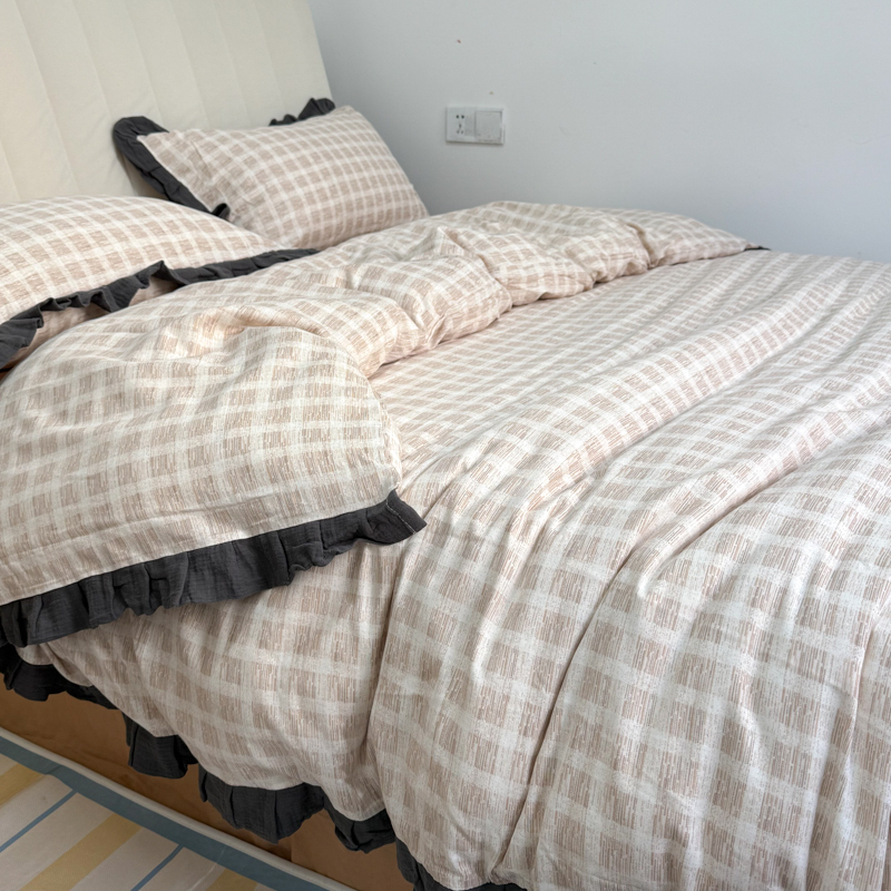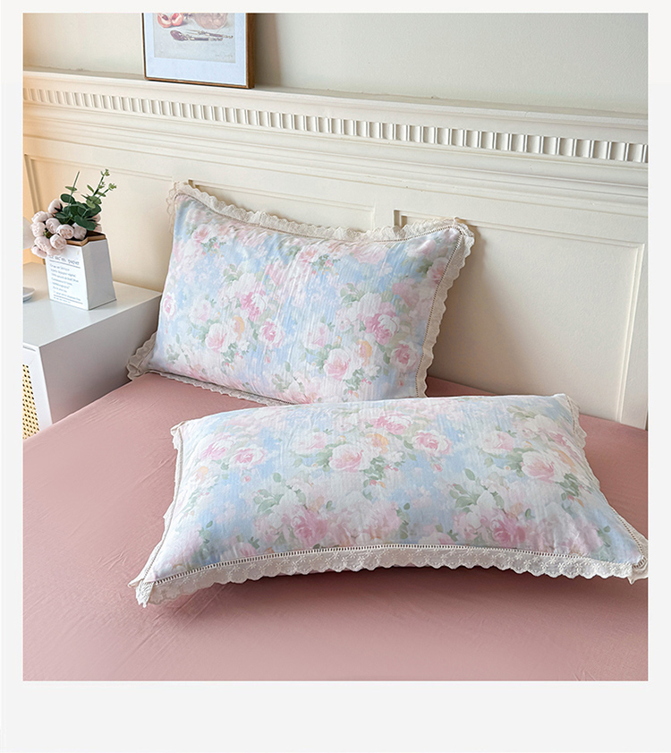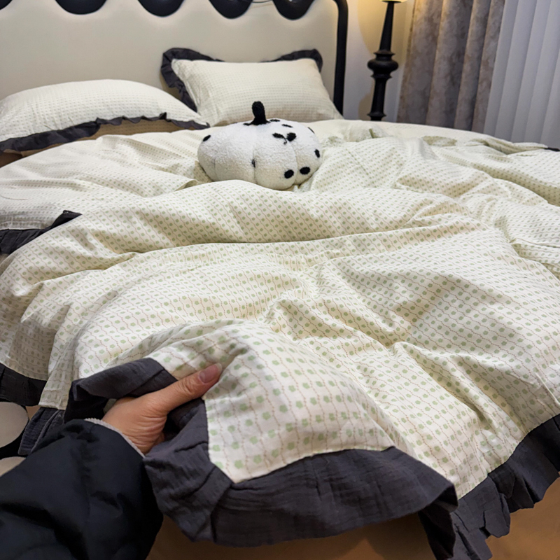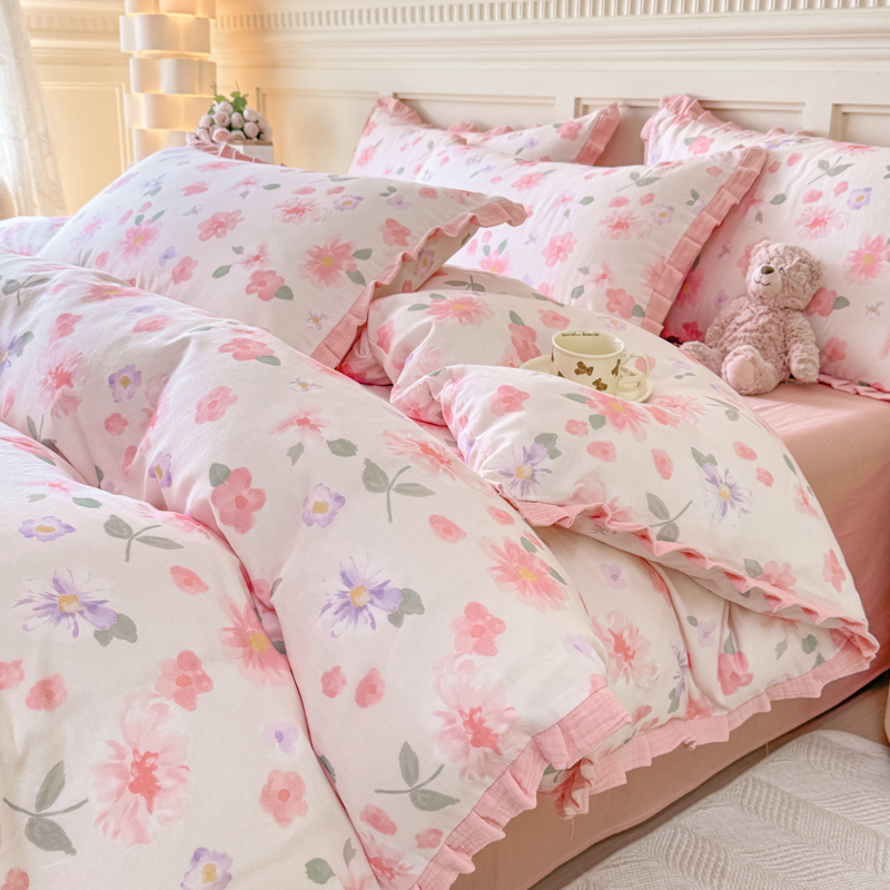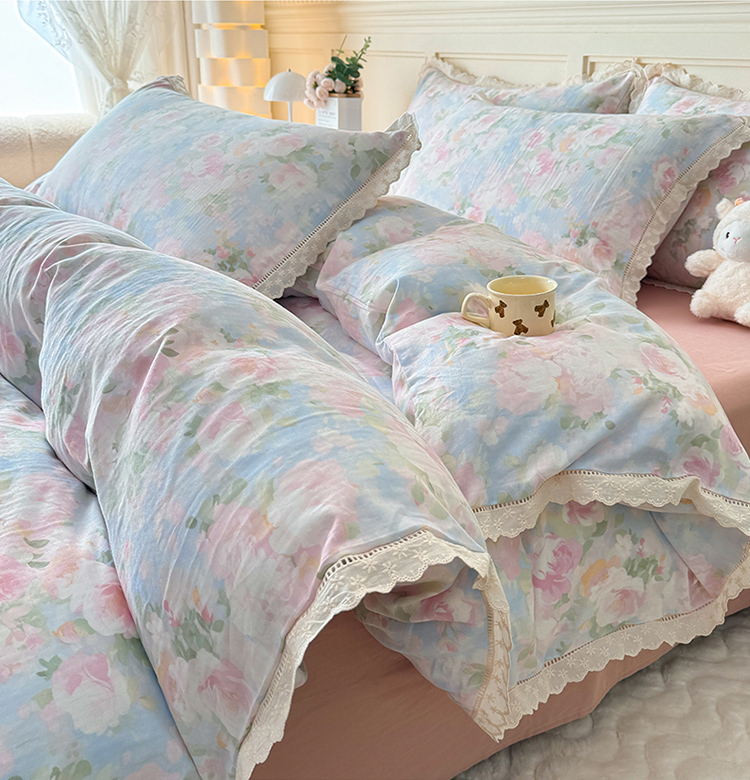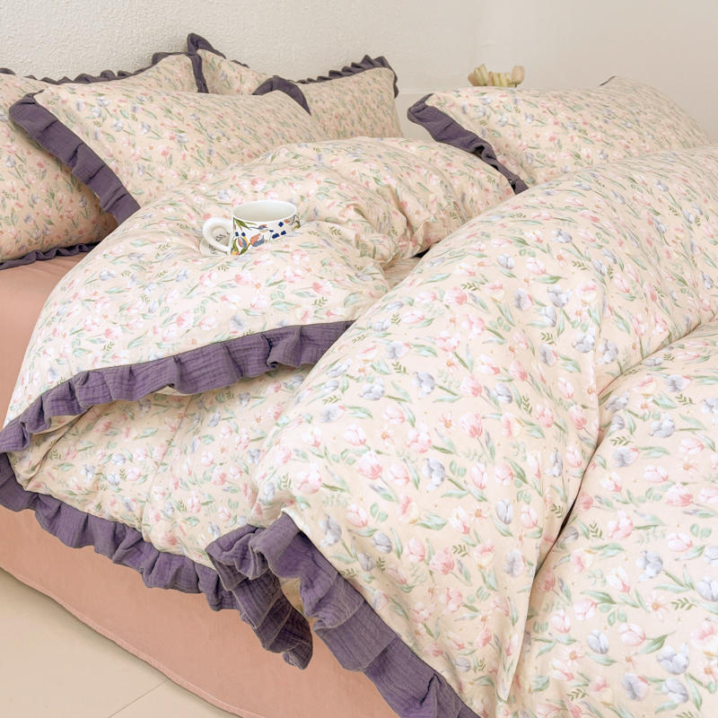 商品名称:(总)【疆东】2026韩版蕾丝花边纯棉全棉双层纱四件套印花纯棉四件套法式赫本木耳花边全棉公主双层纱四件套