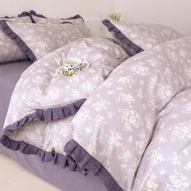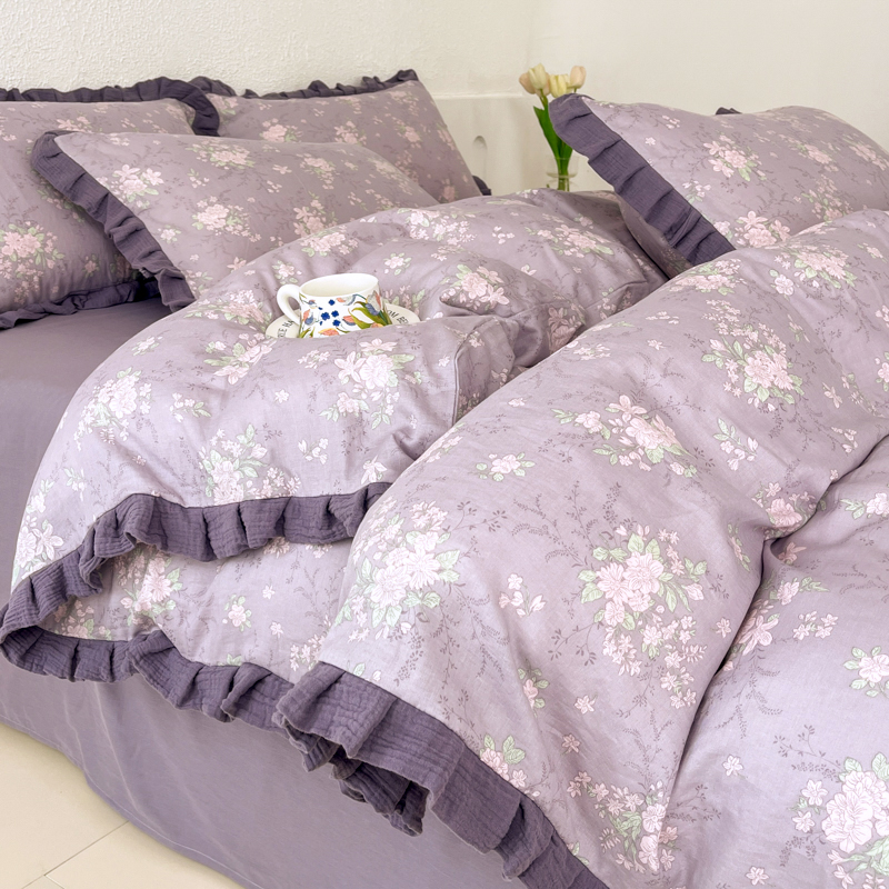(总)(总)2026高端韩版法式荷叶边印花纯棉全棉双层纱四件套复古赫本公主风少女花边全棉纯棉双层纱四件套,木槿,芳菲,时光里里,疏影,青黛,虞美人,爱丽丝,暮色玫瑰,蔷薇恋人,花隐