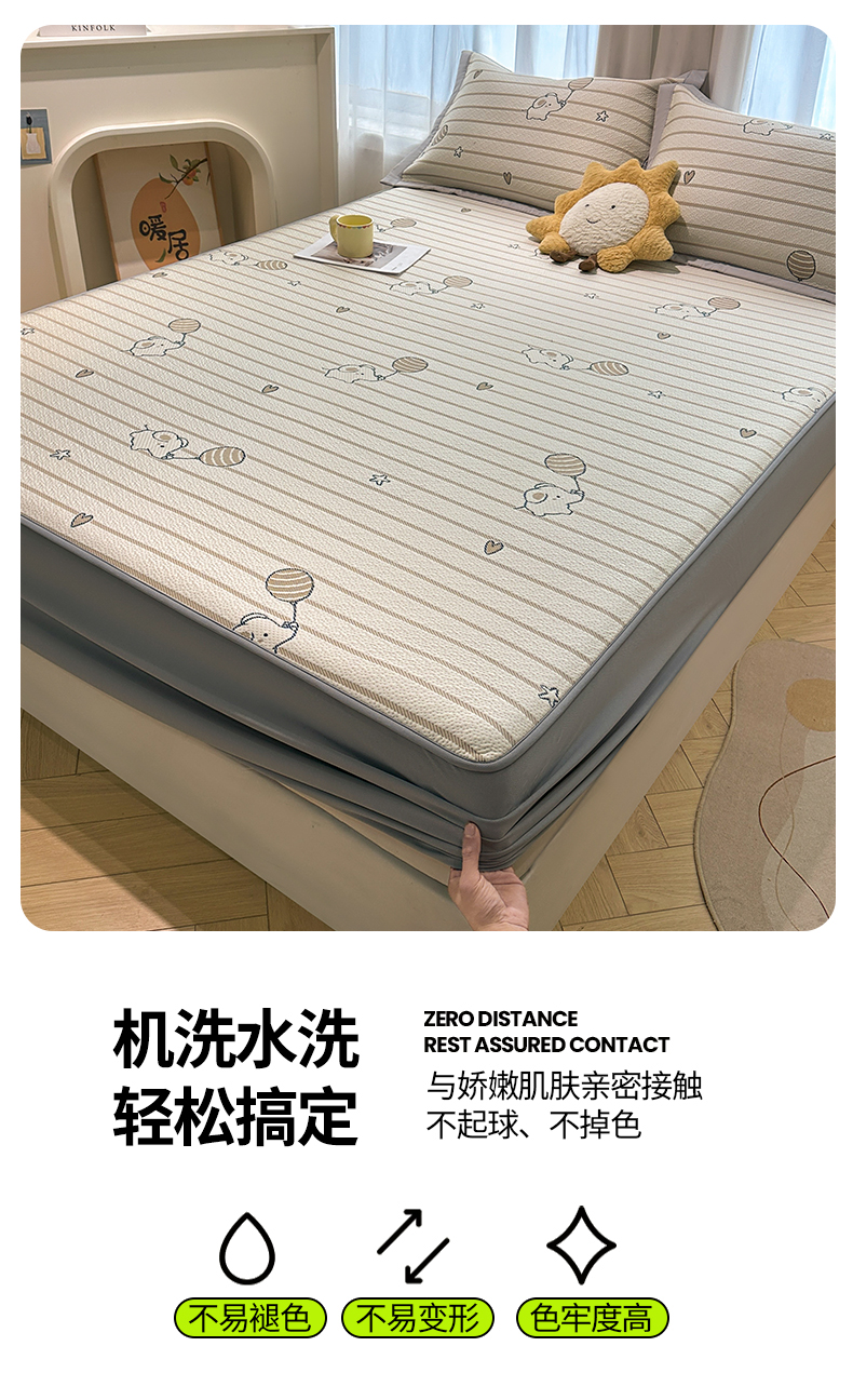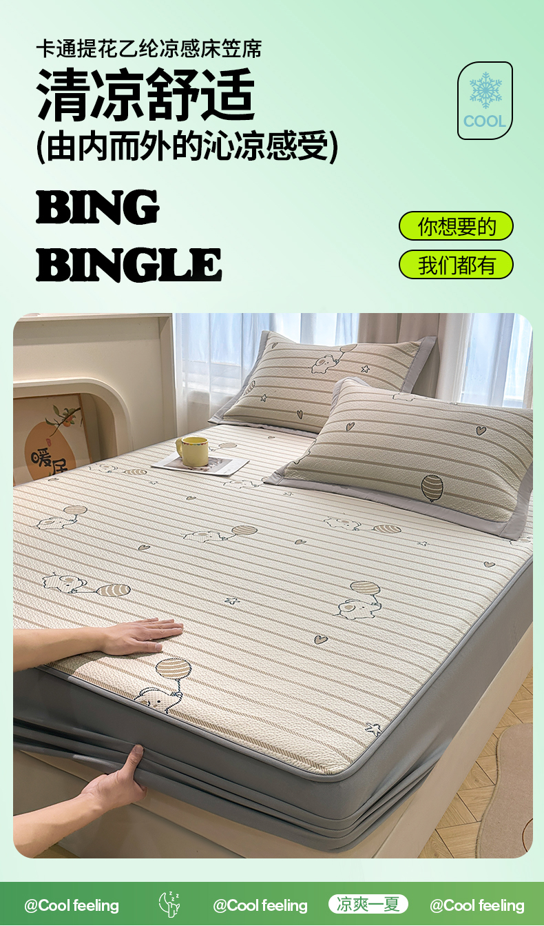 织雅漫 2026春夏新款卡通乙纶冰豆豆凉席席子-床笠款 条纹小象-床笠款