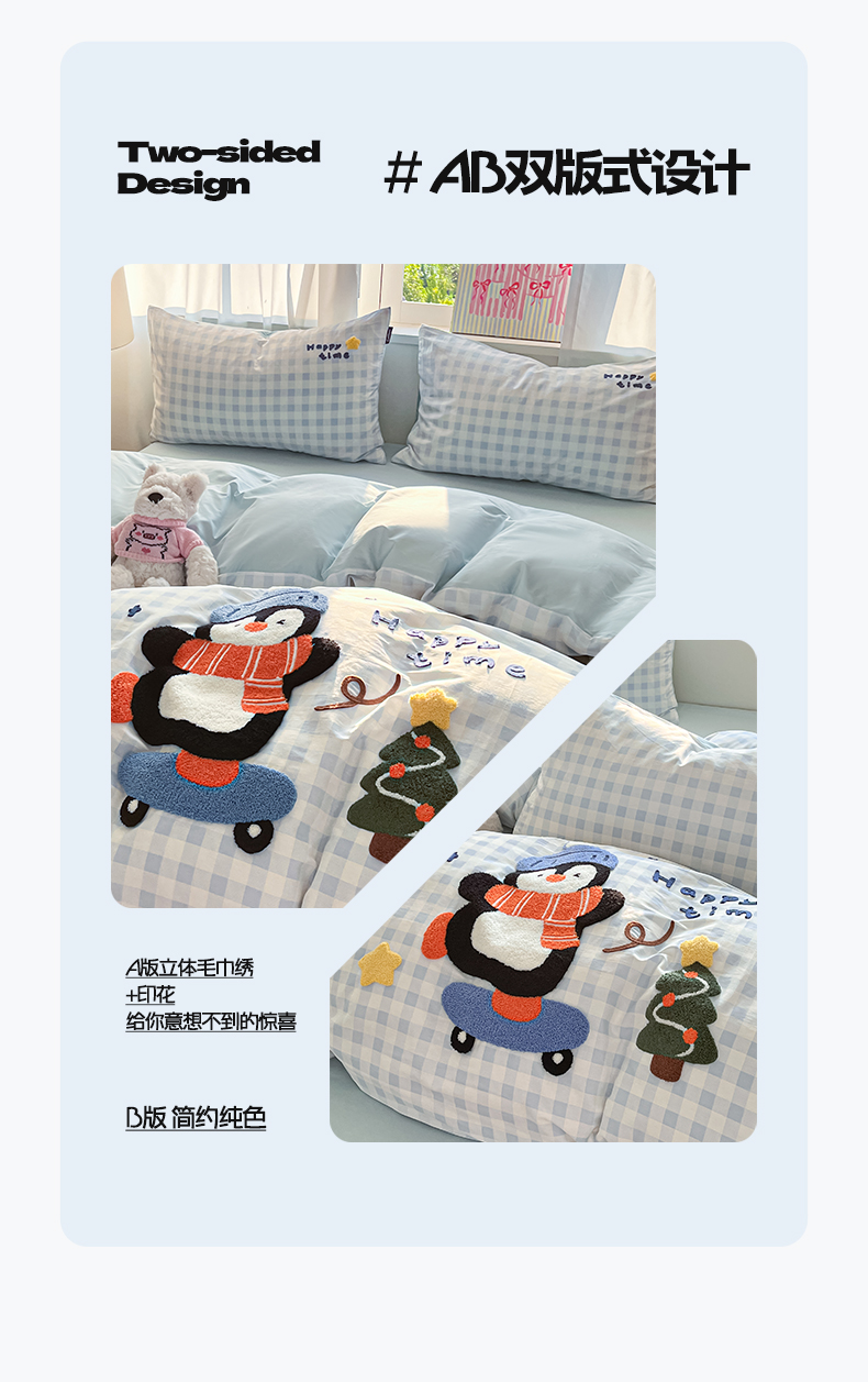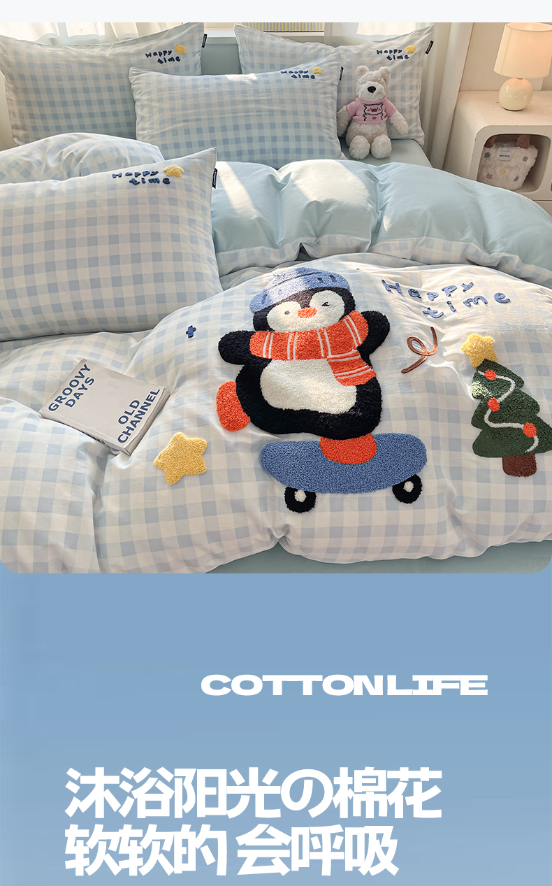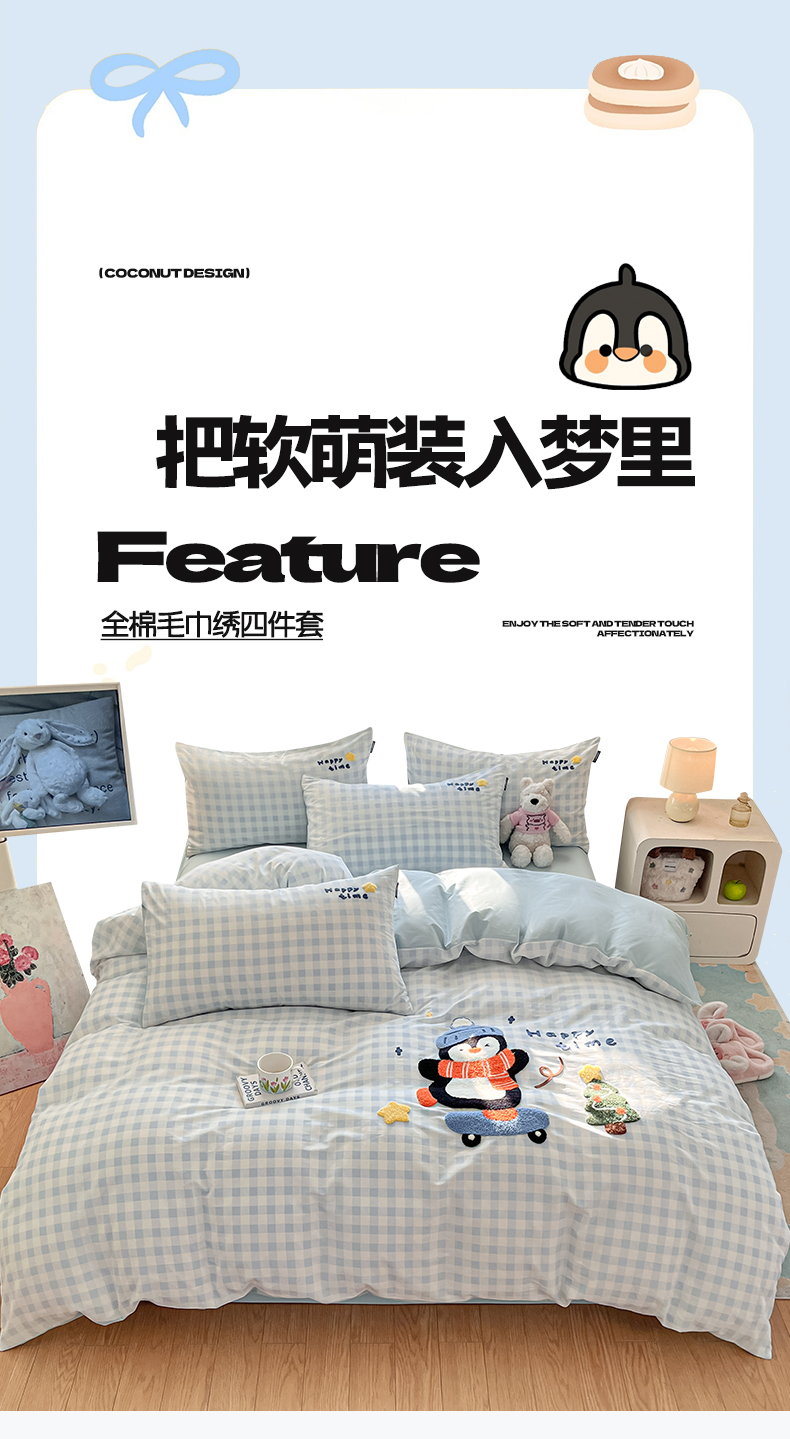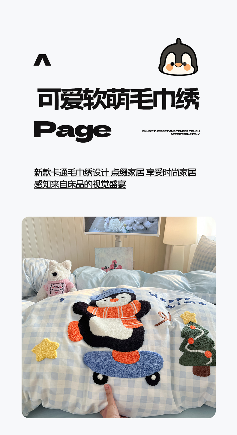商品名称:涵宸家纺 2026新款全棉印花毛巾绣四件套 活力企鹅
