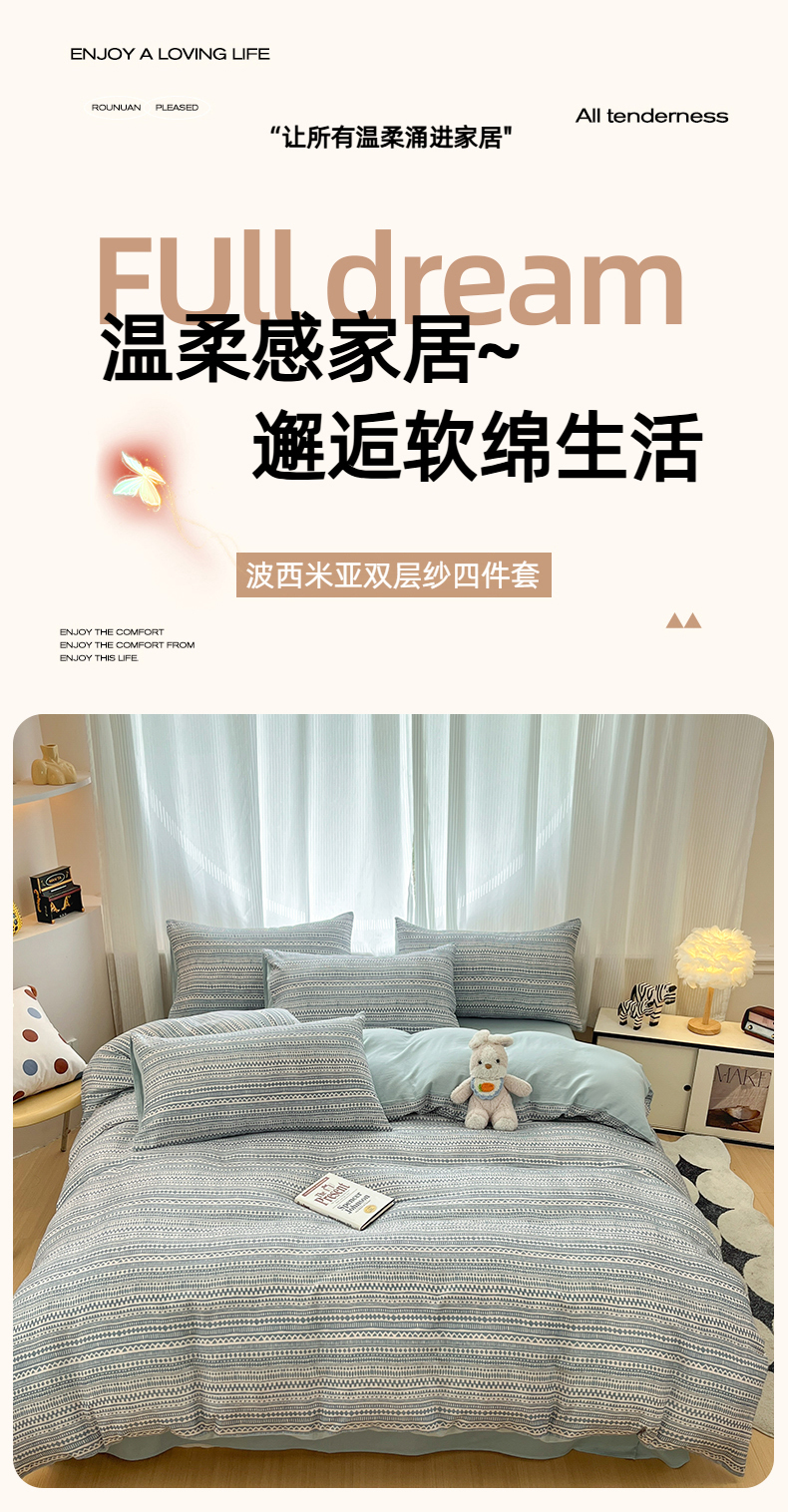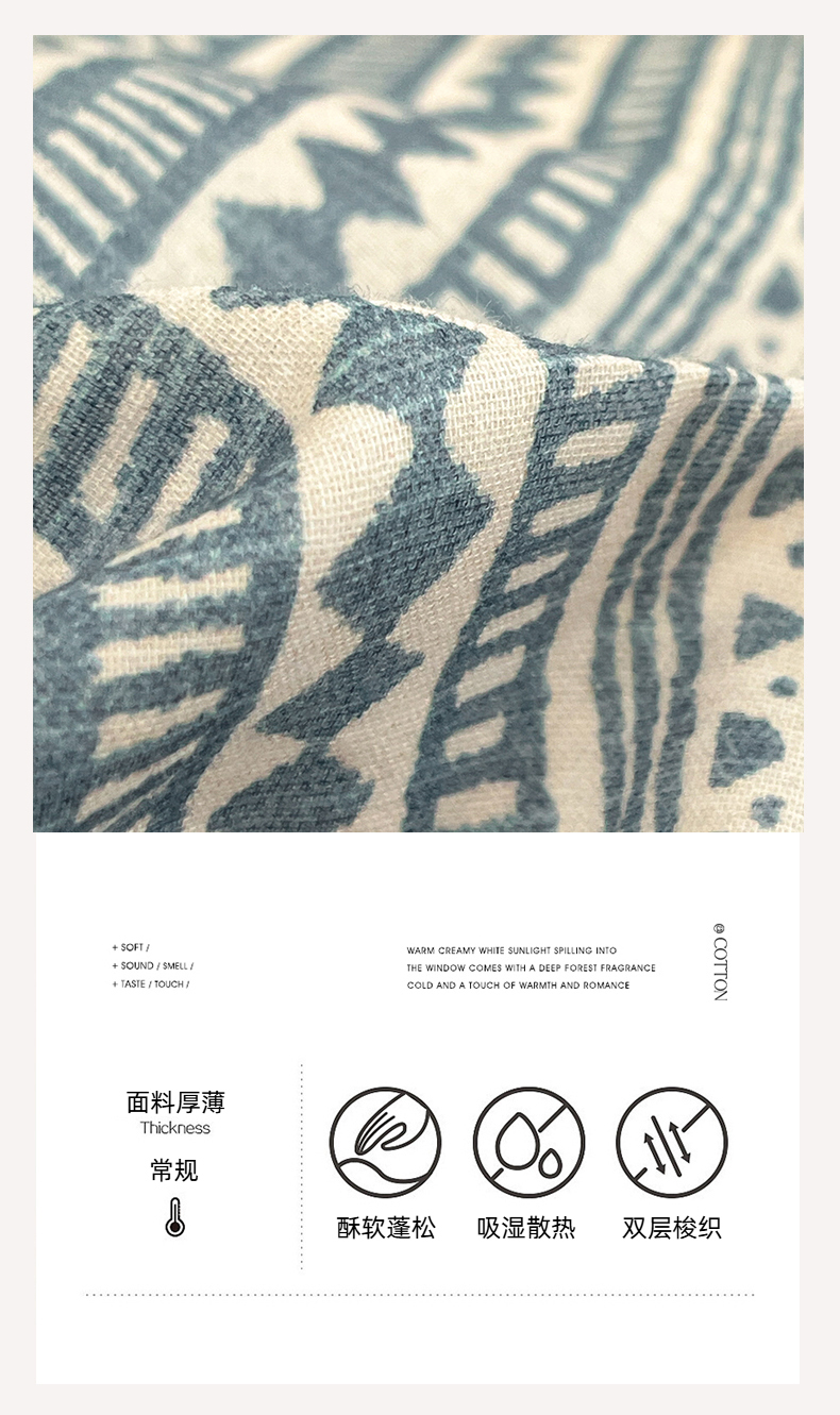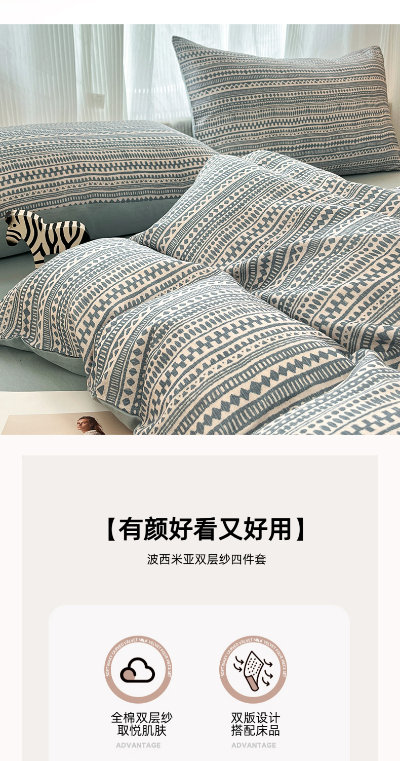 当前位置: 91家纺网 > 商品网购 > 床品套件 > 四件套 > 全棉普通四件套 > 禾时 2026新款A类波西米亚全棉纯棉双层纱四件套 波西米亚-水蓝