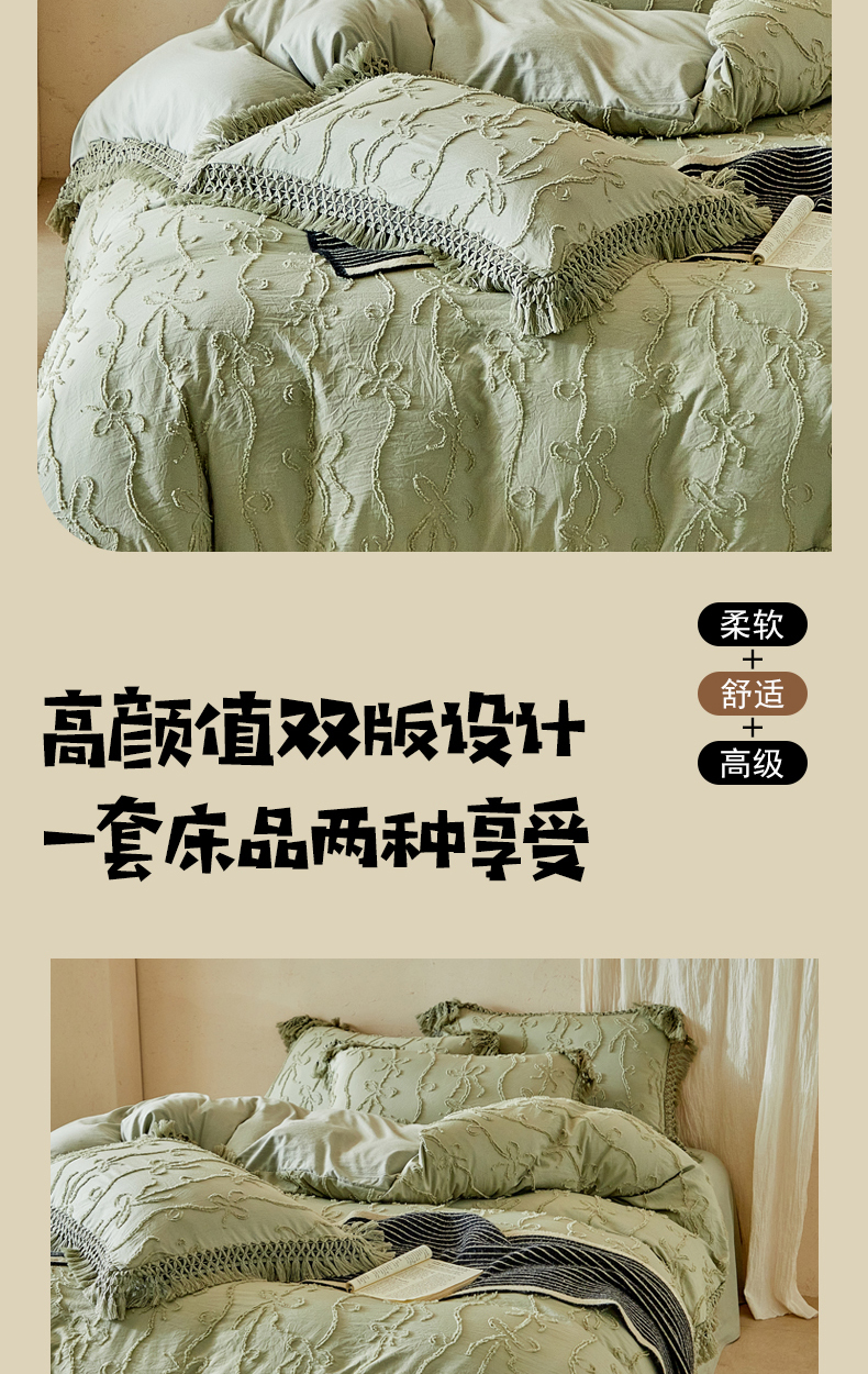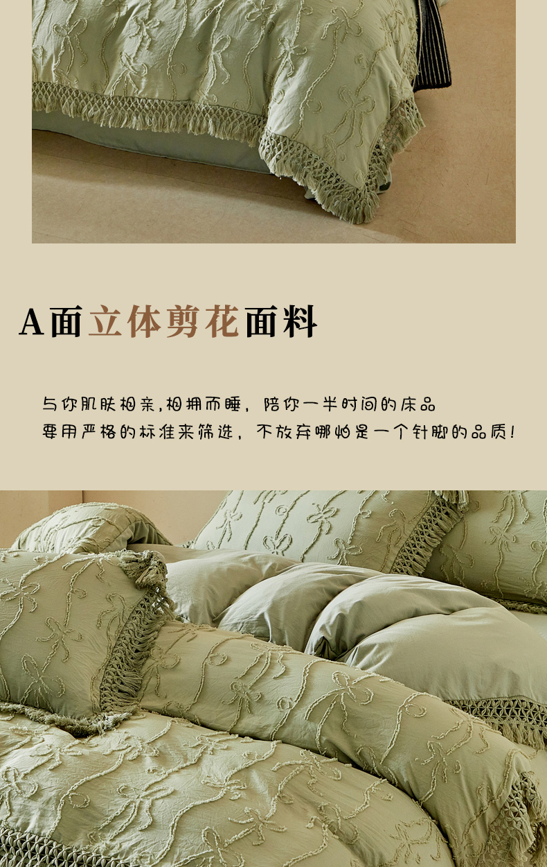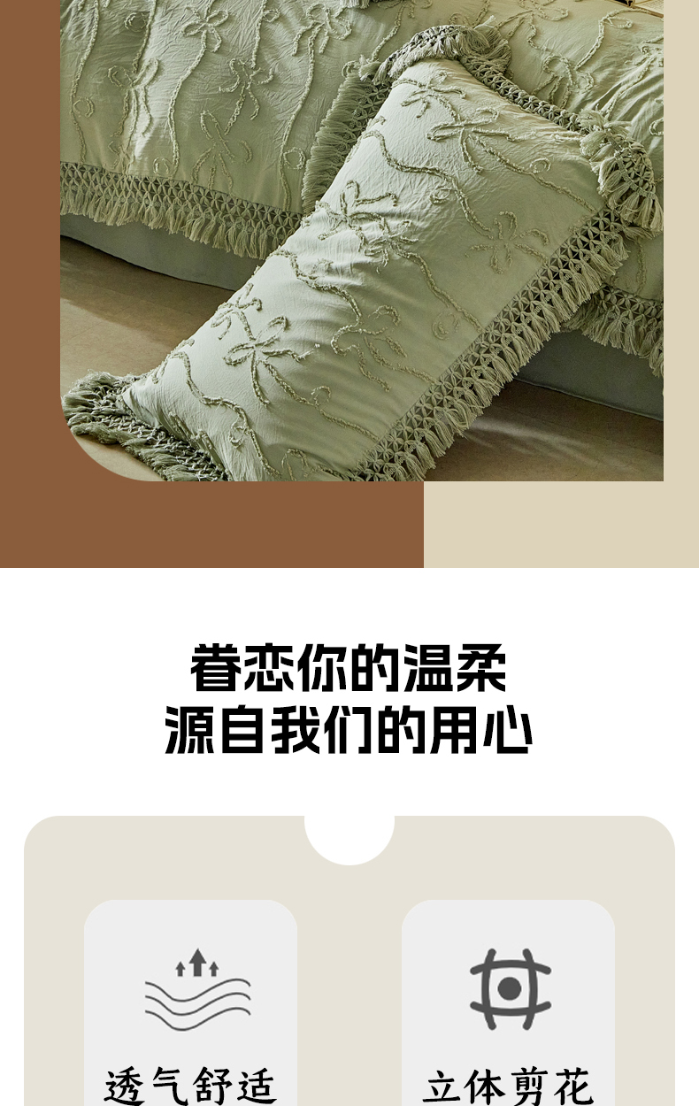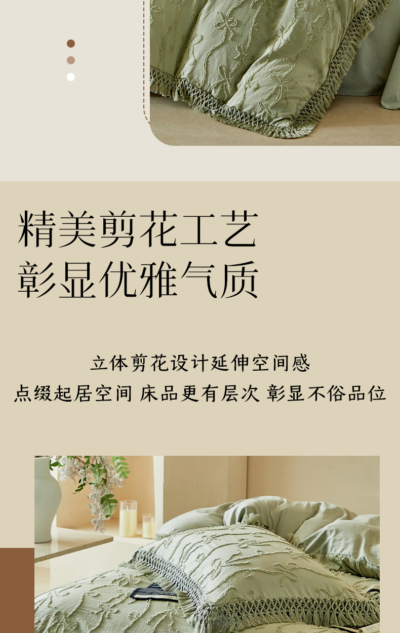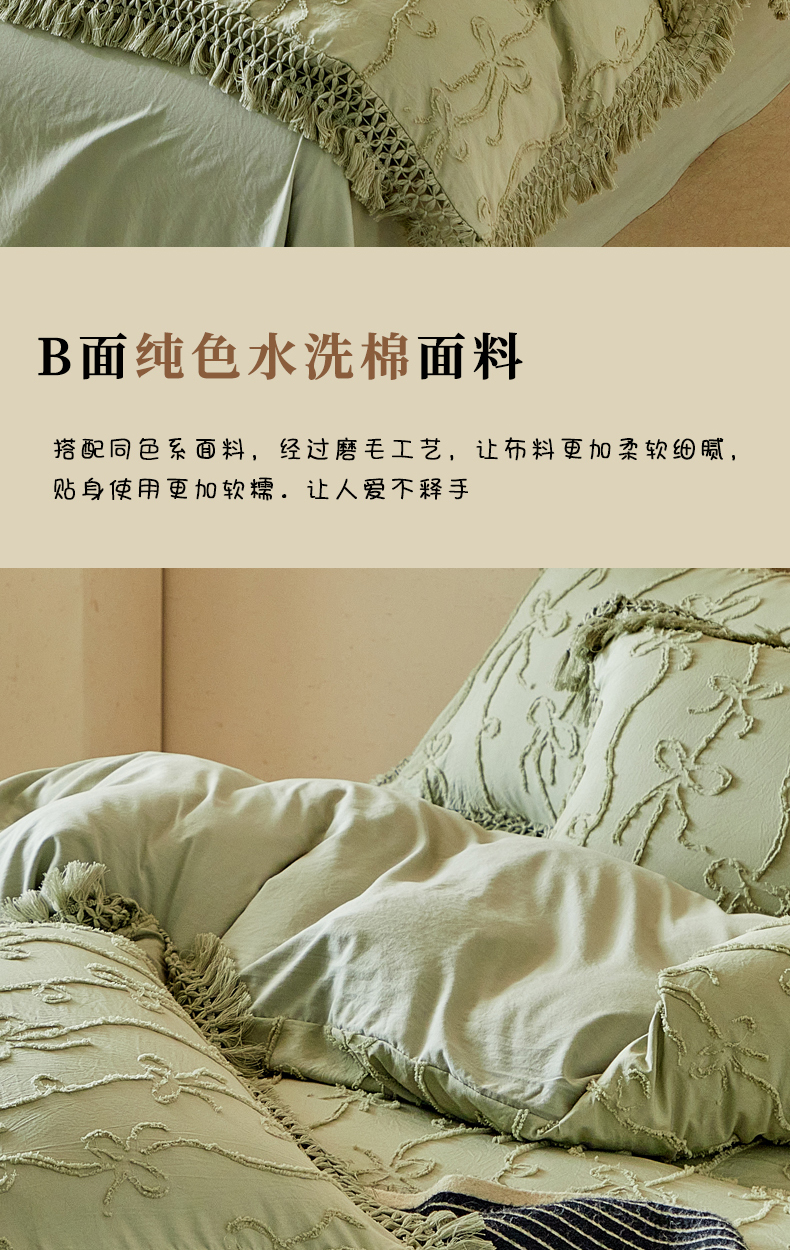 当前位置: 91家纺网 > 商品网购 > 床品套件 > 四件套 > 其它四件套 > 缘生活 2026春夏新款民宿立体剪花蝴蝶结流苏四件套 剪花竖条纹蝴蝶结流苏抹茶绿