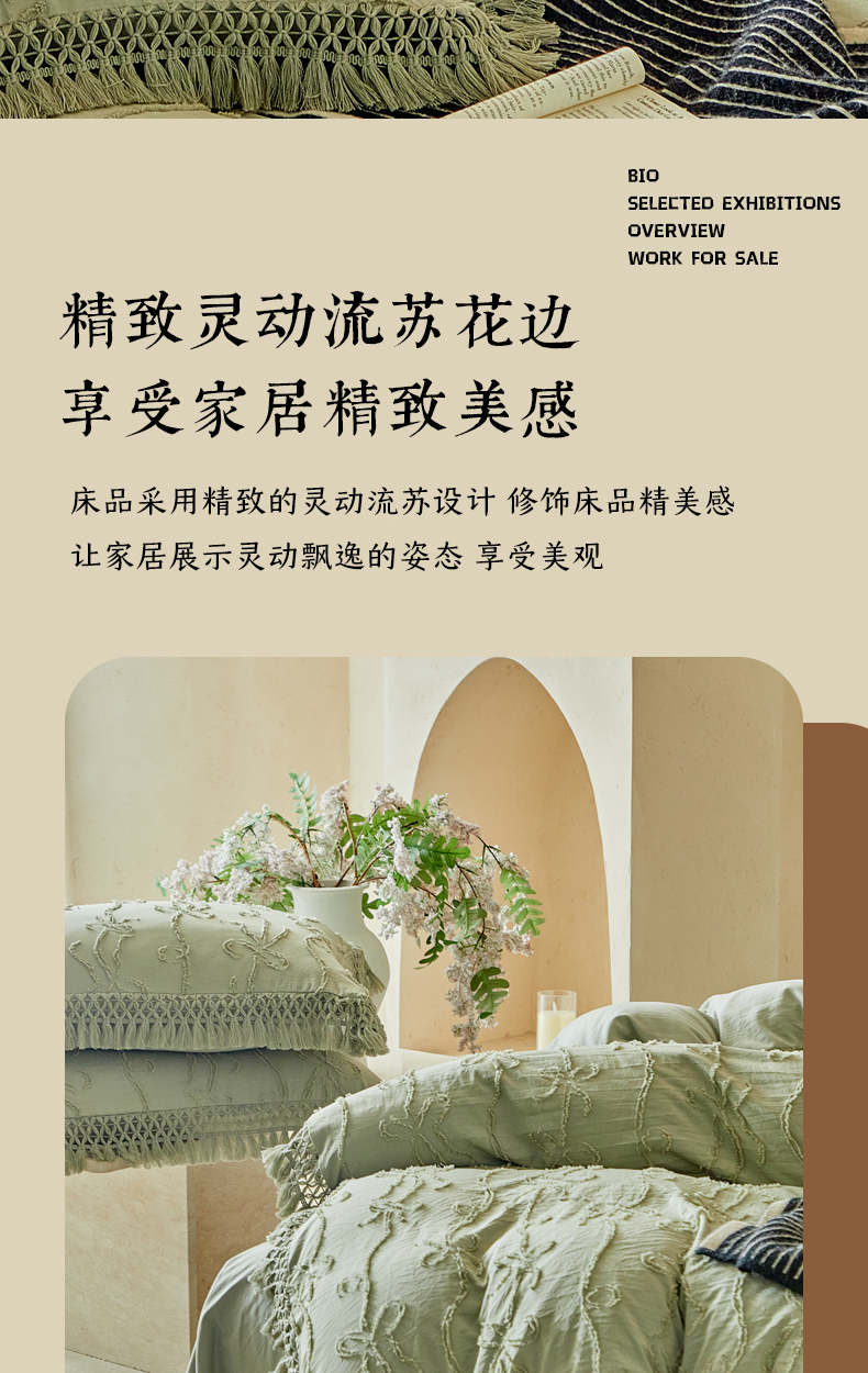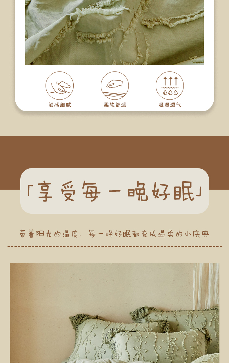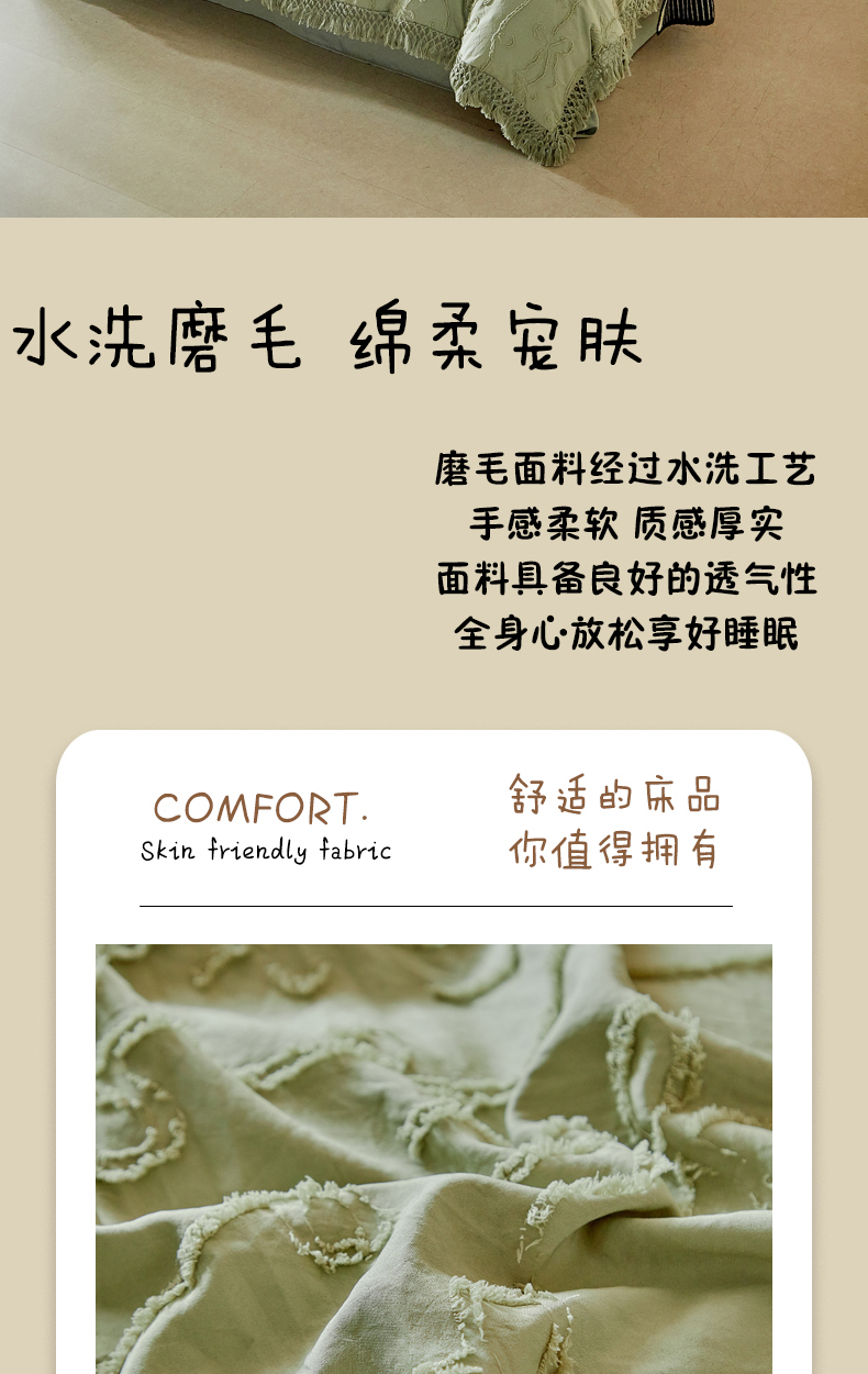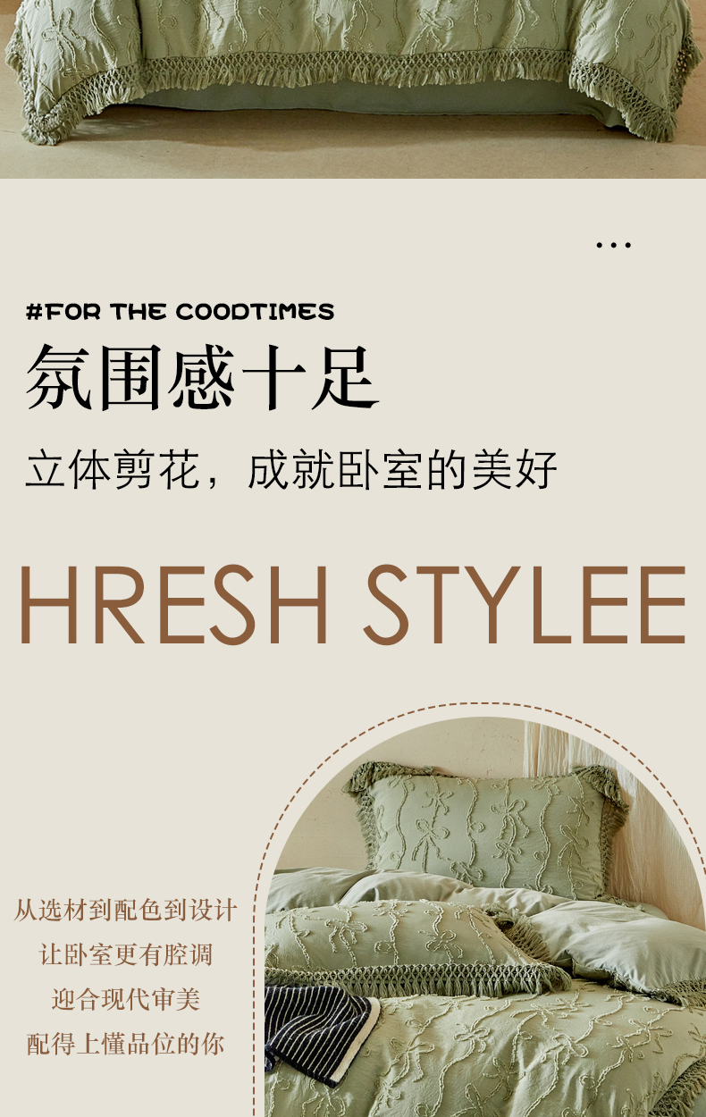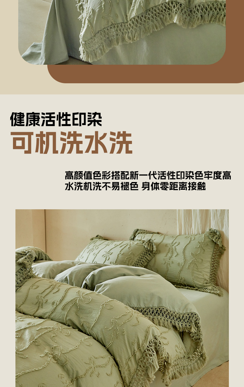 当前位置: 91家纺网 > 商品网购 > 床品套件 > 四件套 > 其它四件套 > 缘生活 2026春夏新款民宿立体剪花蝴蝶结流苏四件套 剪花竖条纹蝴蝶结流苏抹茶绿