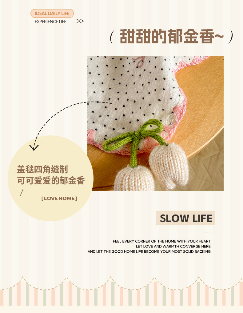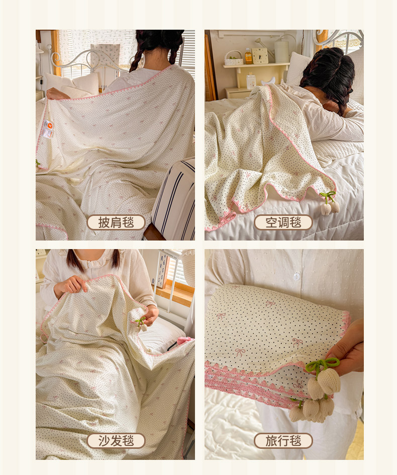商品名称:潮邦创意家居 2026新A类全棉双层纱三角针四角郁金香吊坠盖毯—郁金纱语系列【含A类检测报告】 黑点粉结