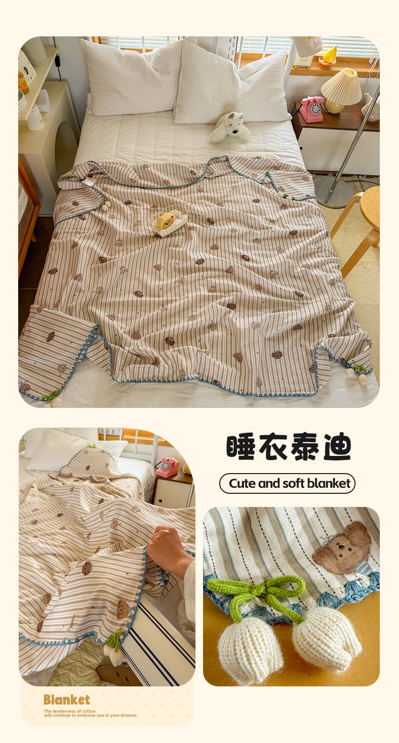 (总)潮邦 2025新款全棉双层纱多功能盖毯,白露-白,背包兔,彩虹糖,车厘子,动物派,秋之花,甜心字母,兔跳跳,兔之园,心怡粉,雨伞兔,棕熊