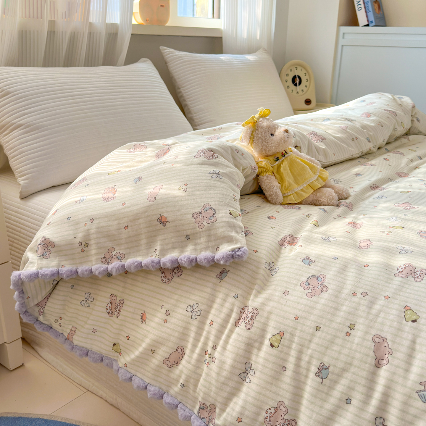 (总)丽涵家纺 2026新款全棉双层纱全棉纯棉大雁纹毛球花边四件套,晚安鸭-黄,晚安鸭-绿,小怪兽,小象马戏团,小熊郊游,熊猫笨笨,音乐小象-绿,音乐小象-紫