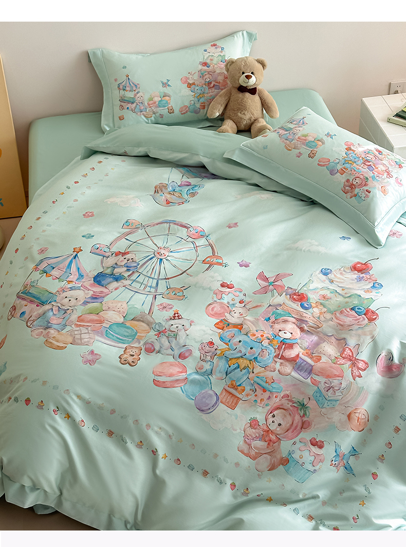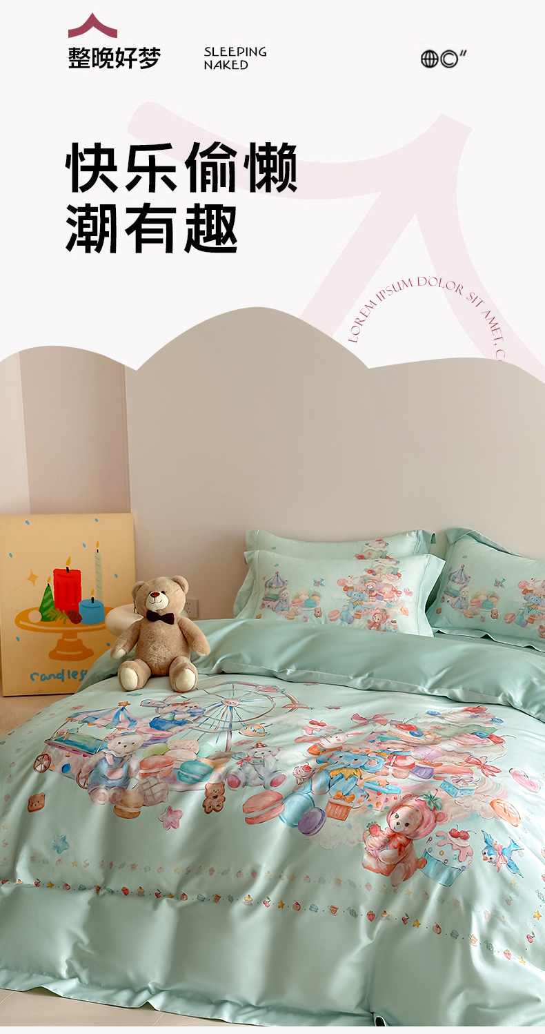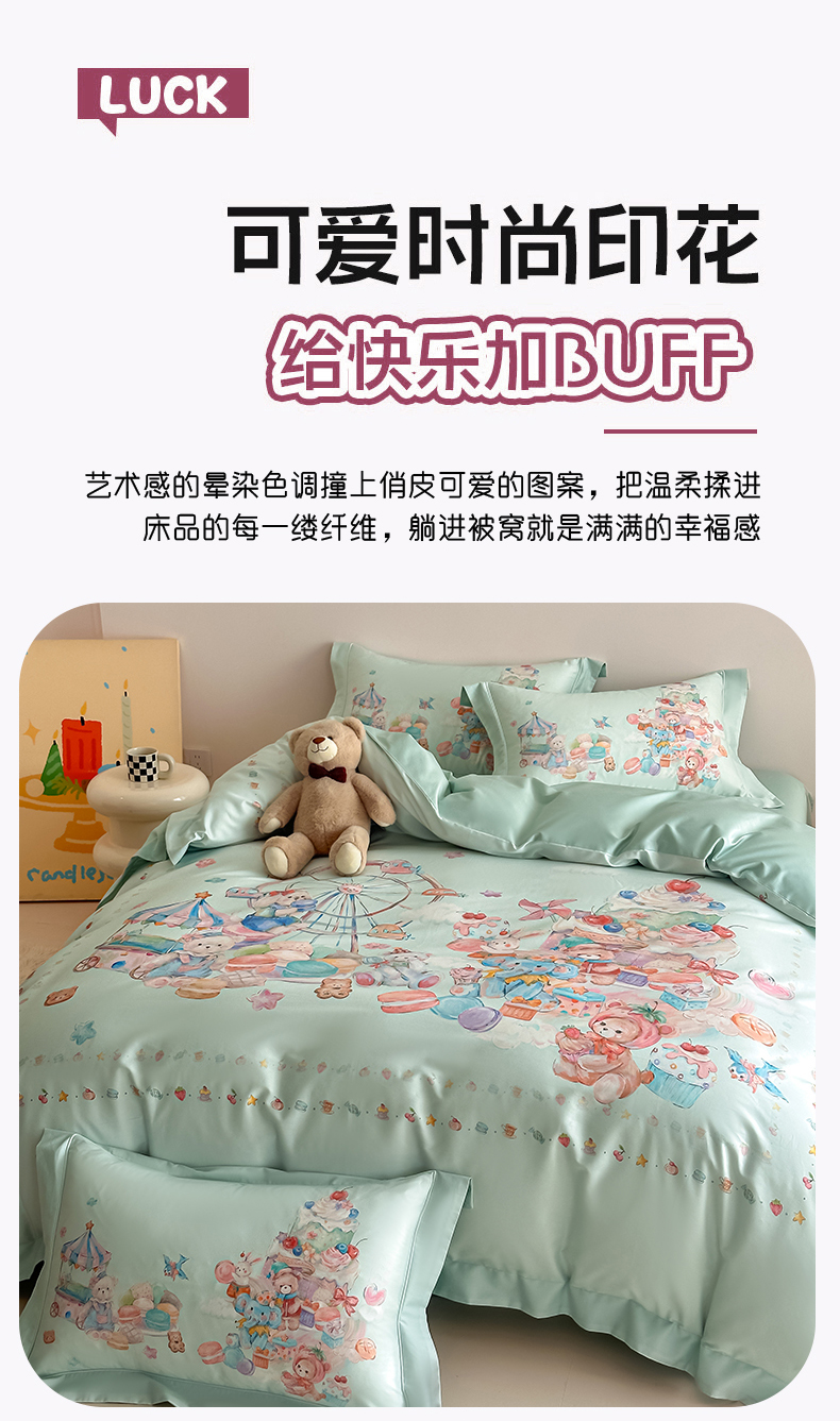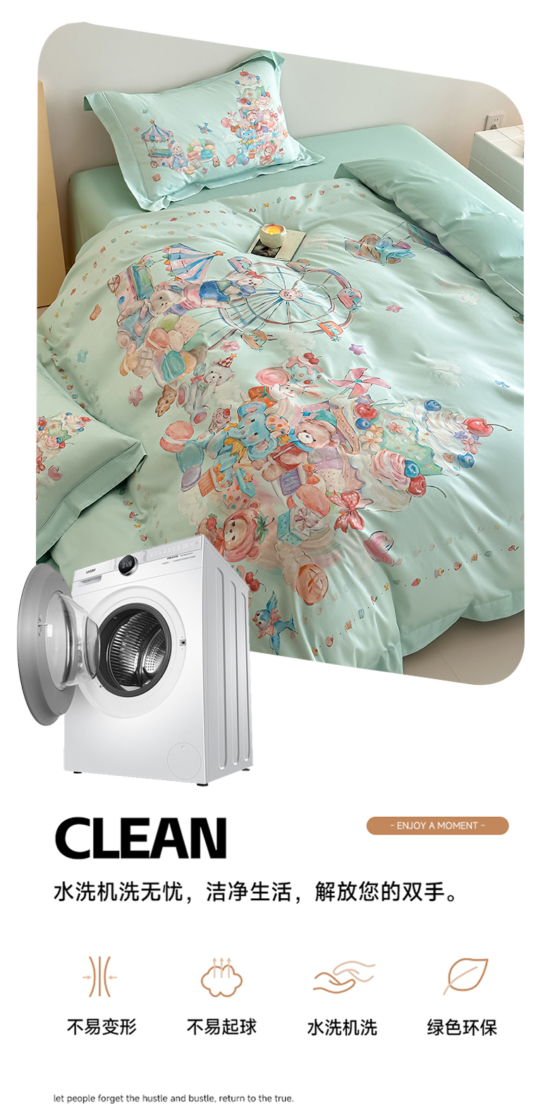 U品汇 2026新品纯棉全棉平网大版数码印花四件套高端60支长绒棉贡缎埋绳宽边系列 甜趣乐园(绿)
