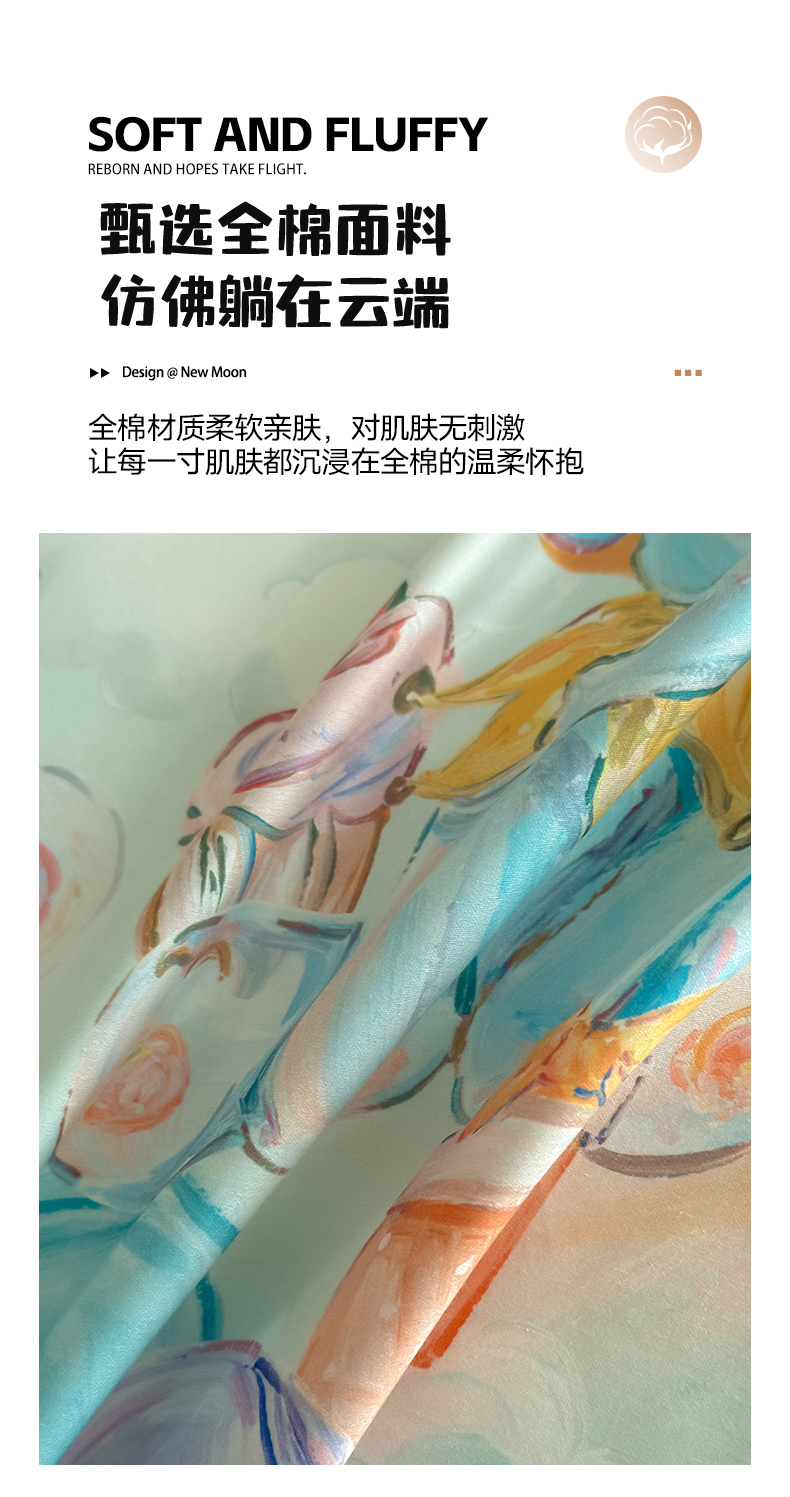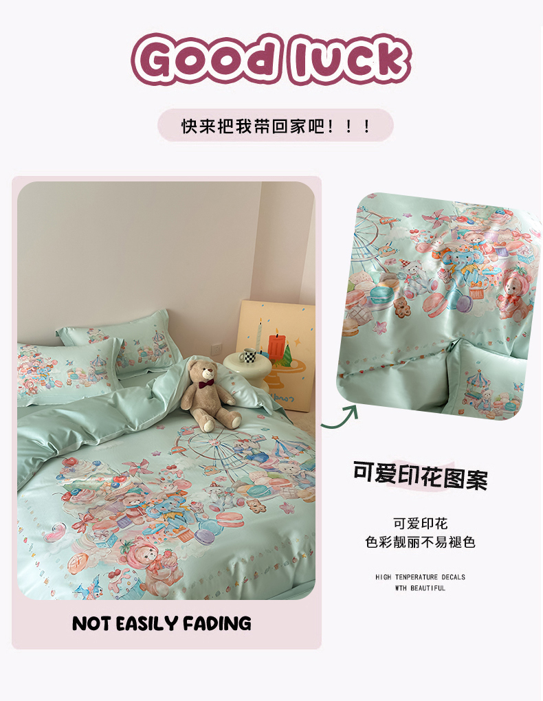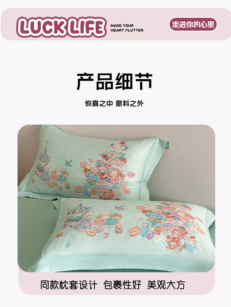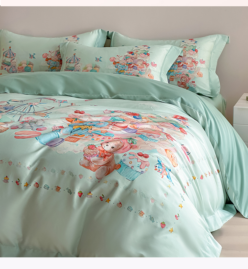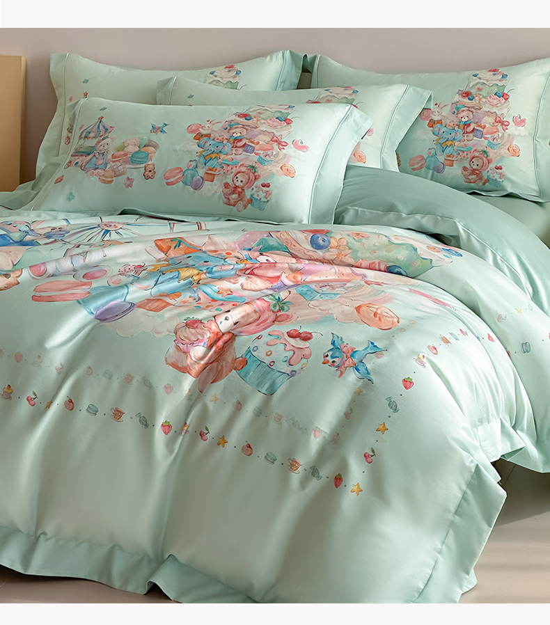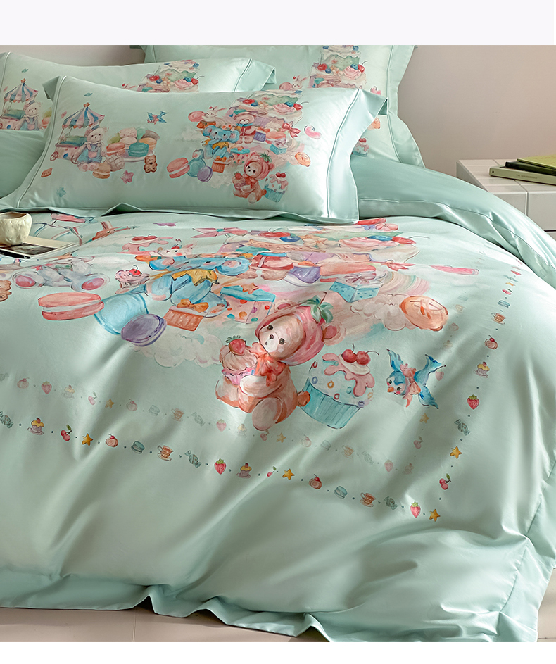 商品名称:U品汇 2026新品纯棉全棉平网大版数码印花四件套高端60支长绒棉贡缎埋绳宽边系列 甜趣乐园(绿)