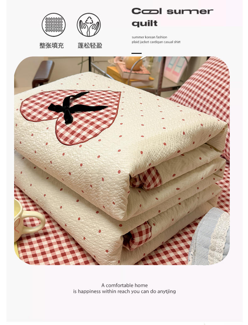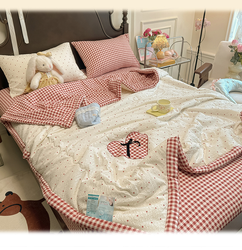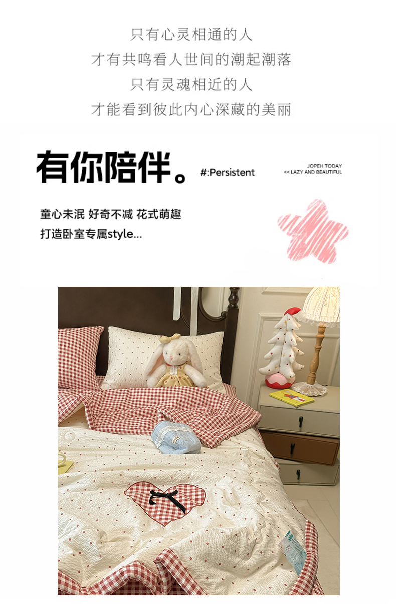 (总)瑞禾家纺(原阿亮) 2026新款春夏新款提花泡芙棉贴布绣手包边单夏被夏被四件套-丘比特的爱恋,丘比特的爱恋-海盐蓝+蓝格,丘比特的爱恋-奶粉波点+粉波点,丘比特的爱恋-奶黑波点+黑小格,丘比特的爱恋-奶红波点+红格,组合图仅供展示-不可下单