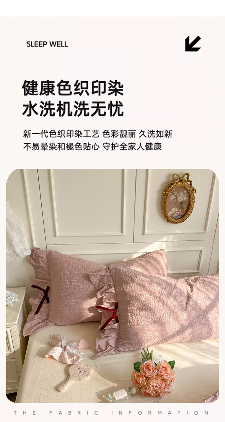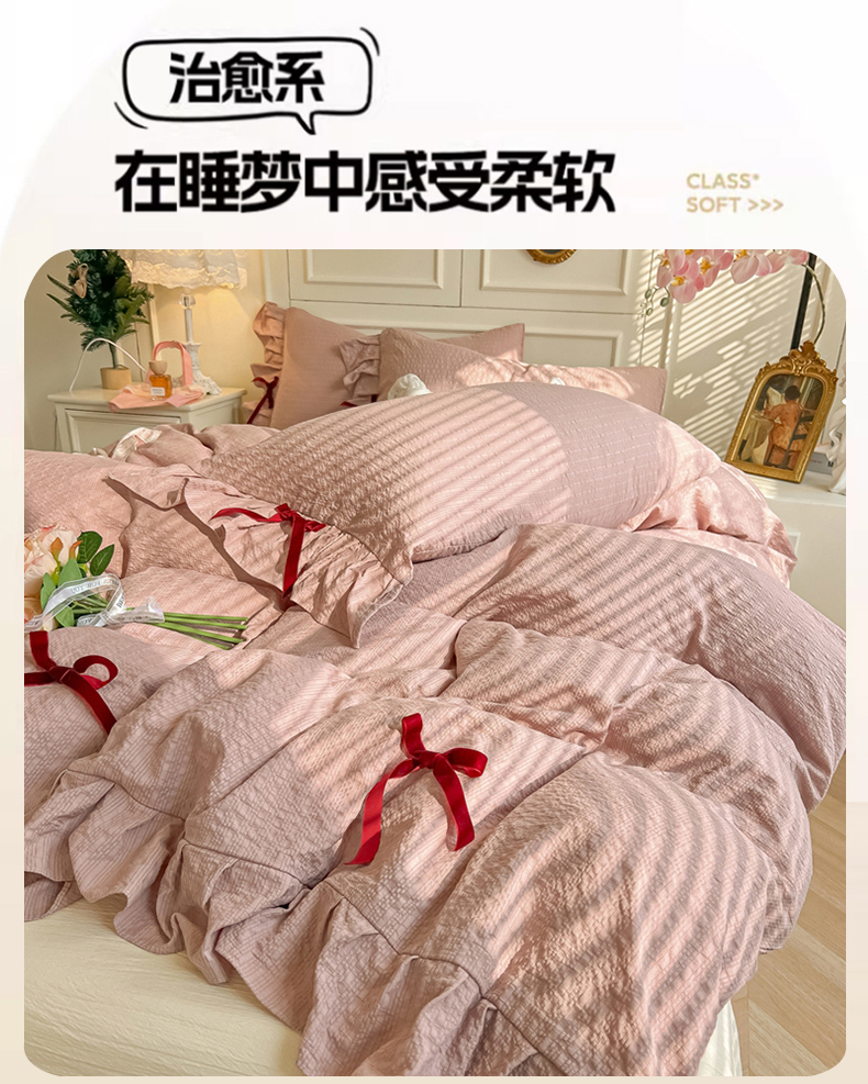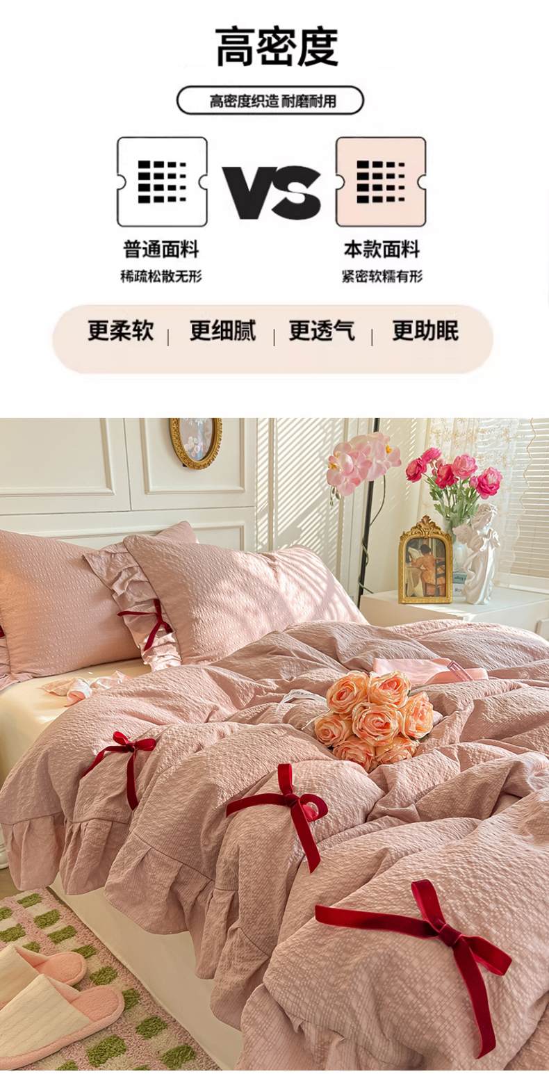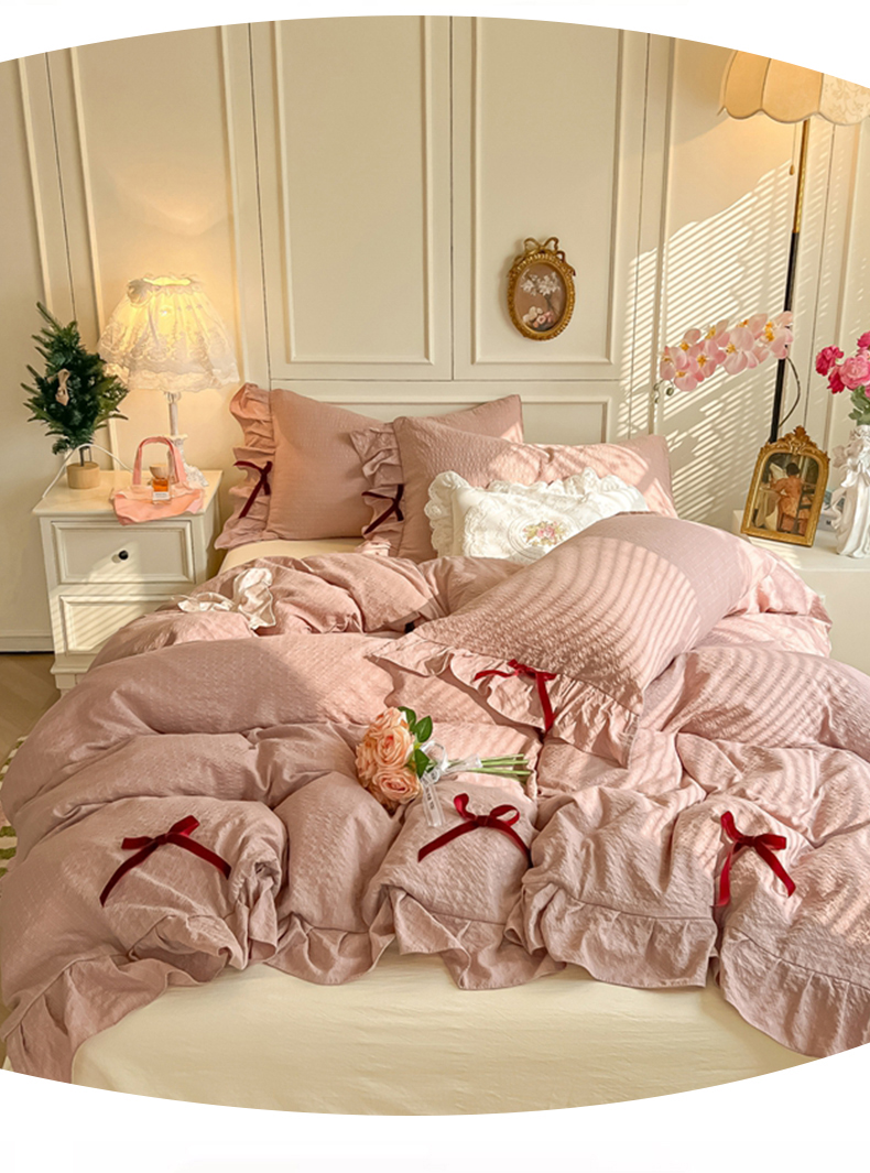 当前位置: 91家纺网 > 商品网购 > 床品套件 > 四件套 > 其它四件套 > 瑞禾家纺(原阿亮) 2026春夏新款提花泡芙棉花边蝴蝶结床单床笠四件套-甜心公主 甜心公主-浅豆沙