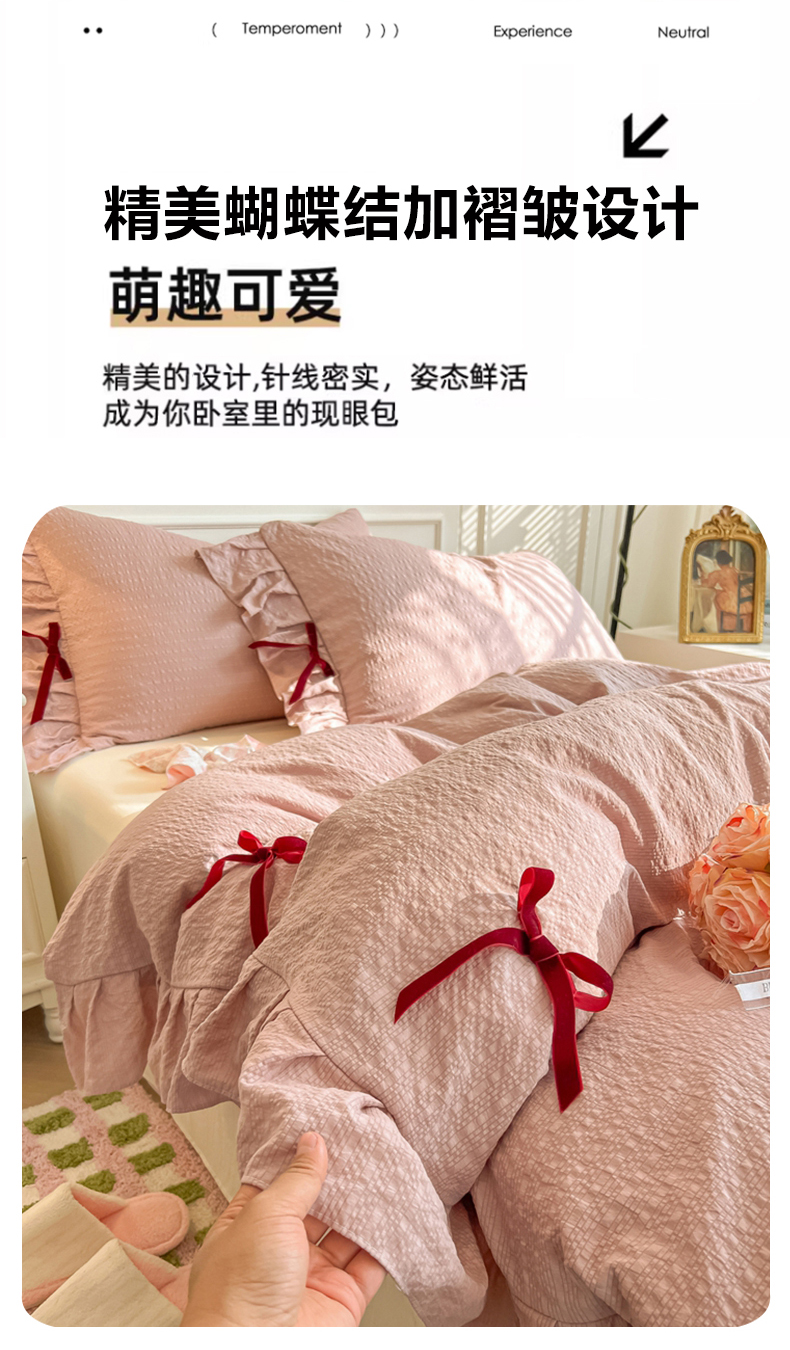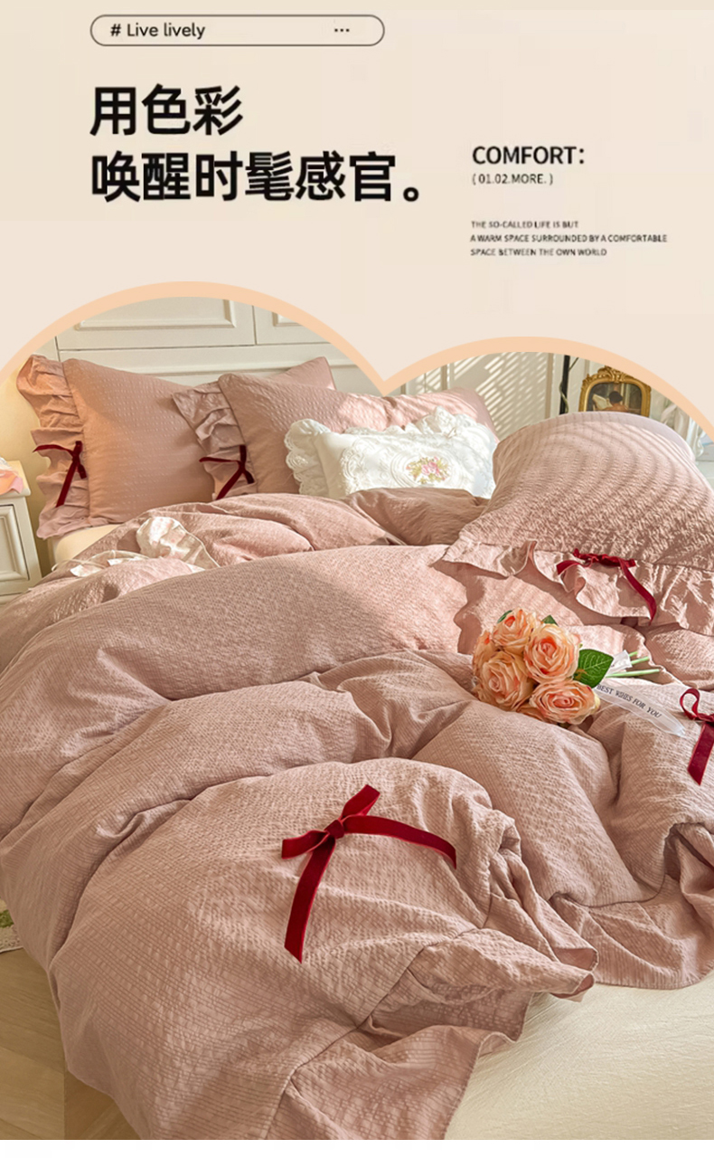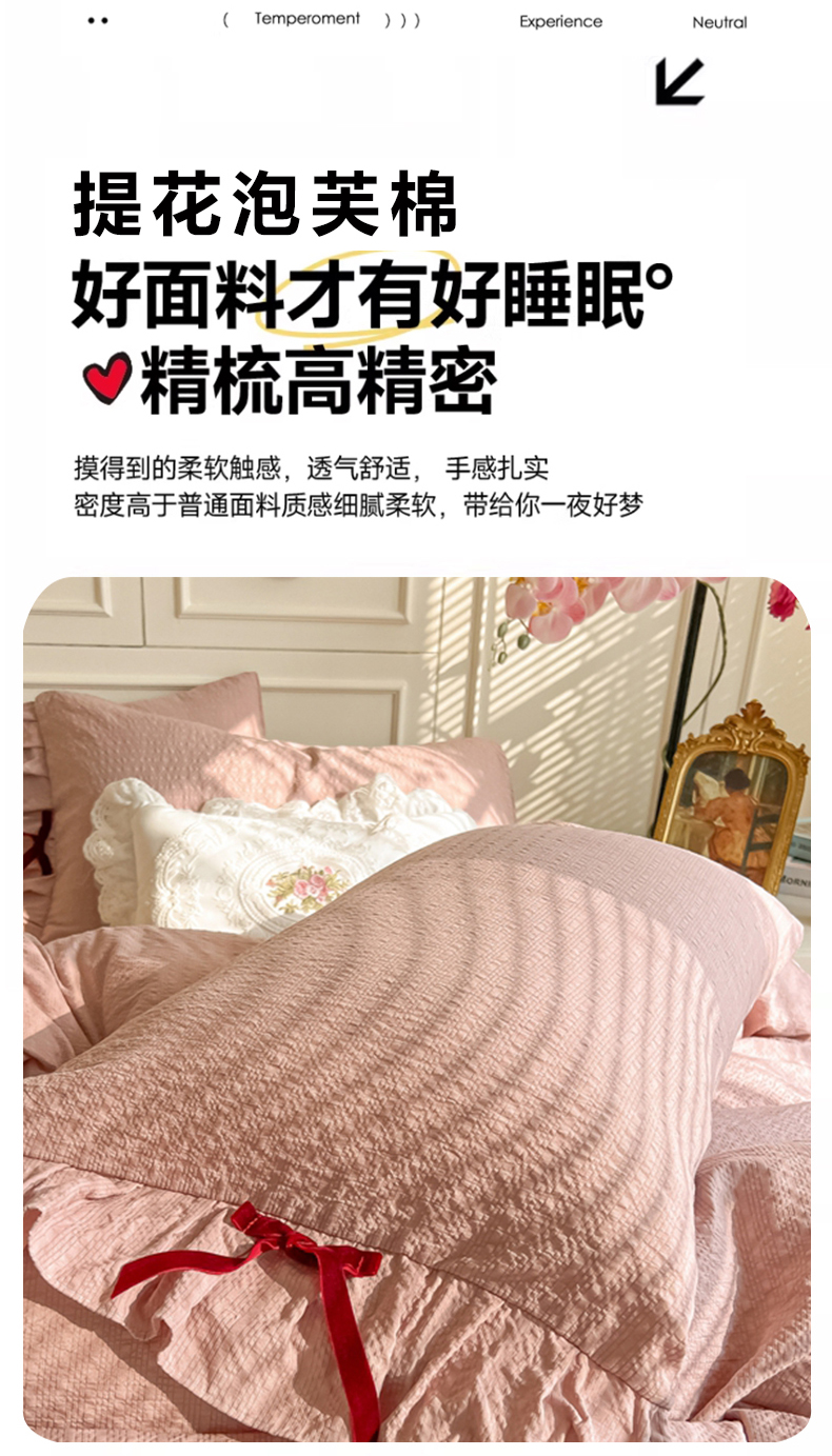 当前位置: 91家纺网 > 商品网购 > 床品套件 > 四件套 > 其它四件套 > 瑞禾家纺(原阿亮) 2026春夏新款提花泡芙棉花边蝴蝶结床单床笠四件套-甜心公主 甜心公主-浅豆沙