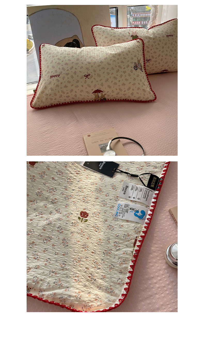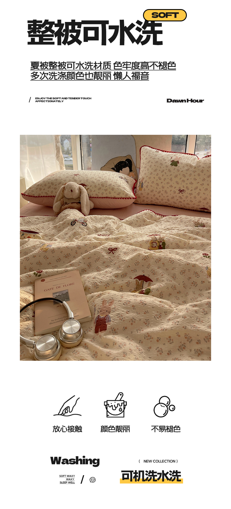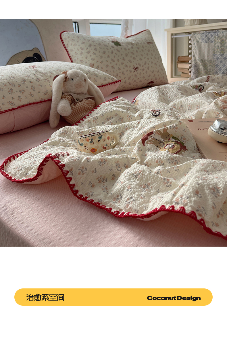 商品名称:贝扬思家纺 2026新款泡芙纱贝壳边夏被套件-欧包系列(今天也只做被快乐包裹的小朋友) 欧包-躲雨小兔