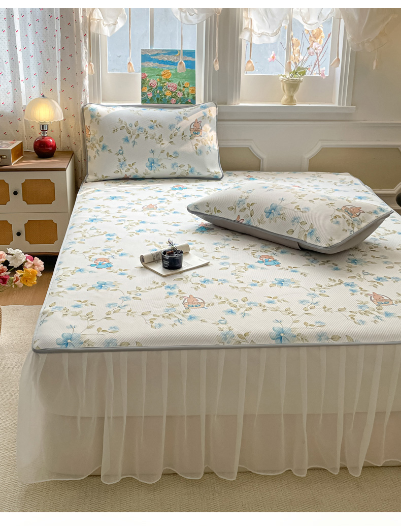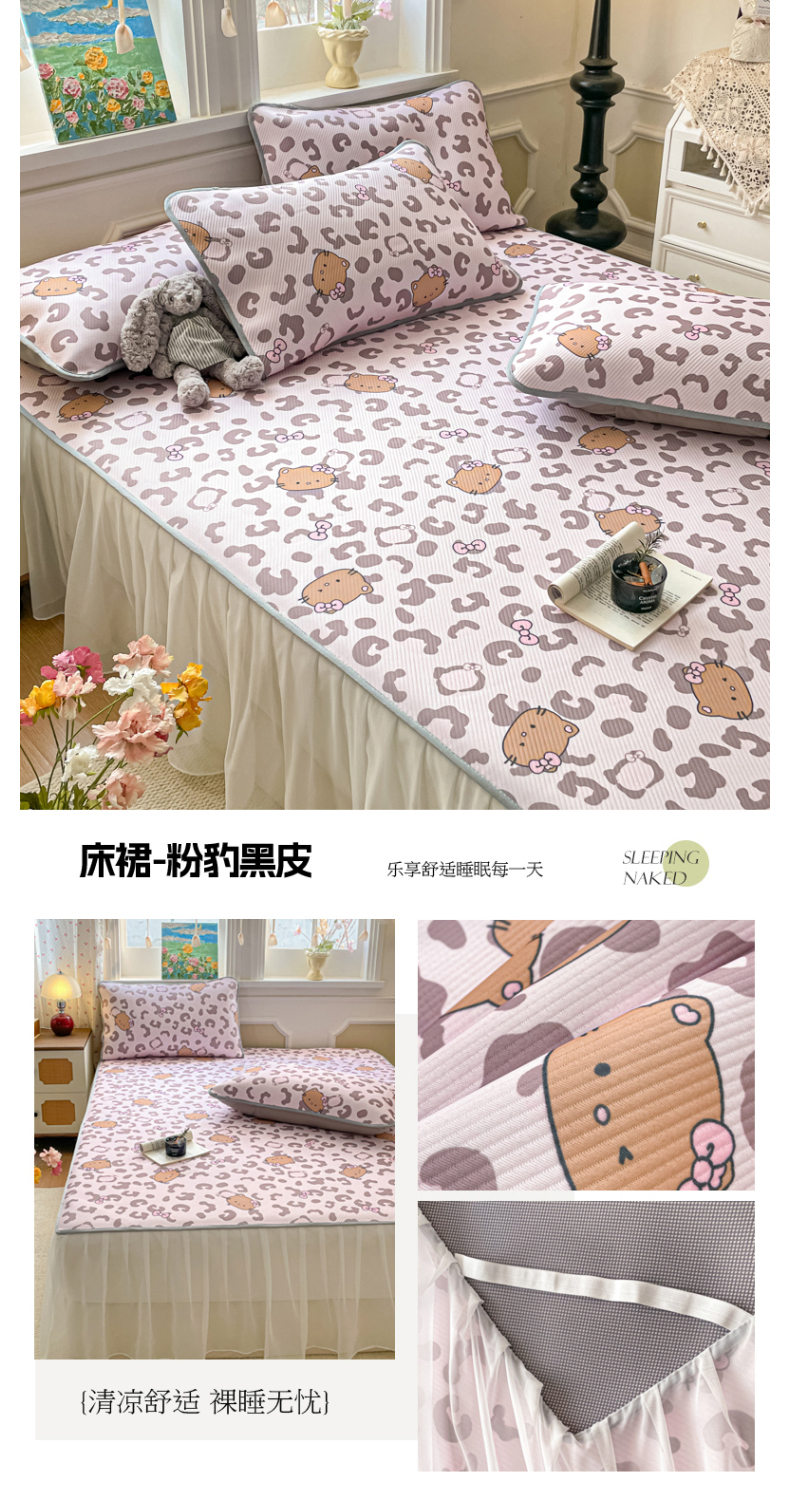 (总)柒月家居 2026新款斜纹凉感豆豆床裙款凉席,床裙-蓝雾花枝,床裙-粉豹黑皮,床裙-粉花软熊,床裙-粉蓝萌猫,床裙-花花精灵,床裙-花筐奶兔,床裙-玫瑰园,床裙-浅夏花兔,床裙-青叶萌物