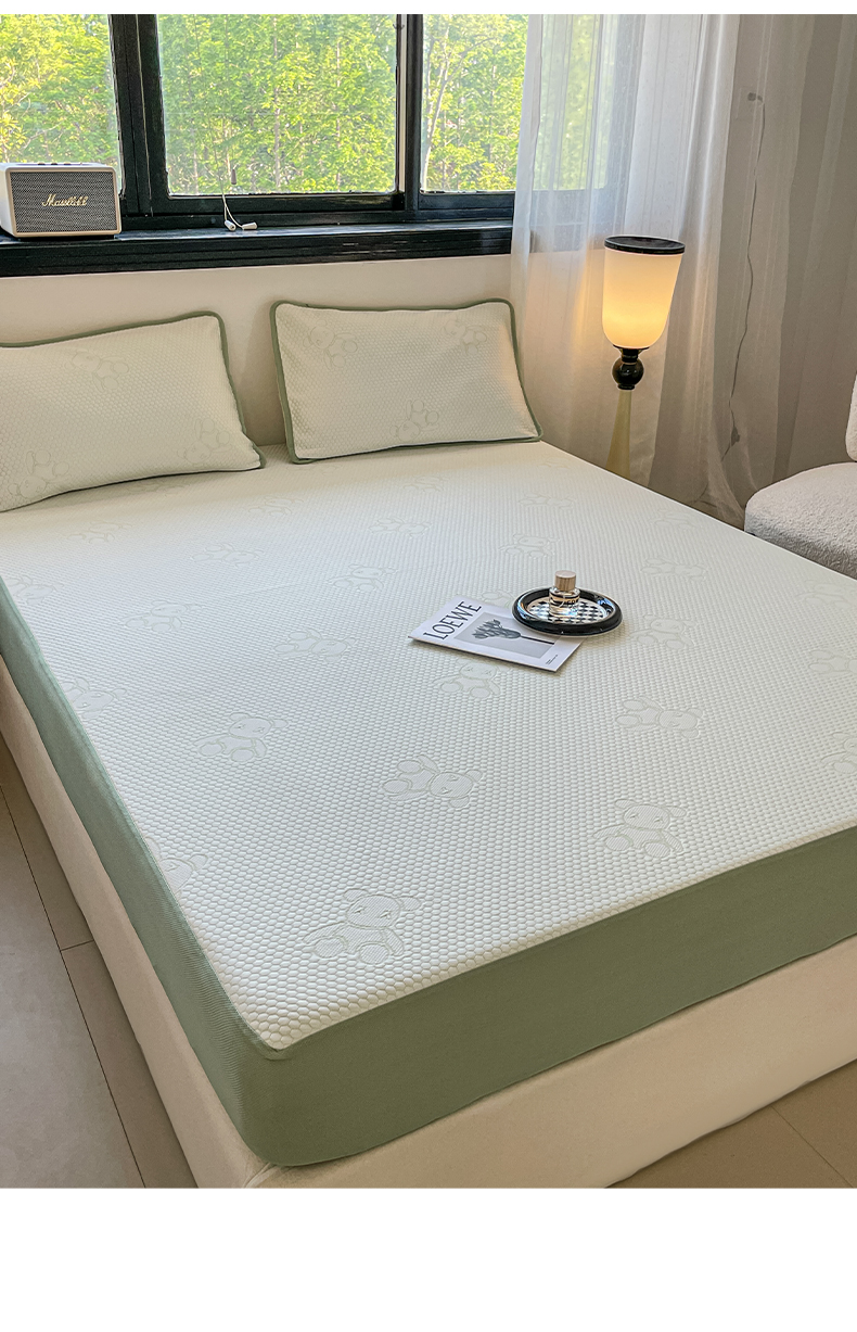 商品名称:悦织湾家纺 2026新款提花凉豆豆凉席三件套夏季3D豆豆席冰爽席子床笠款蝴蝶结小熊系列 暴力熊绿