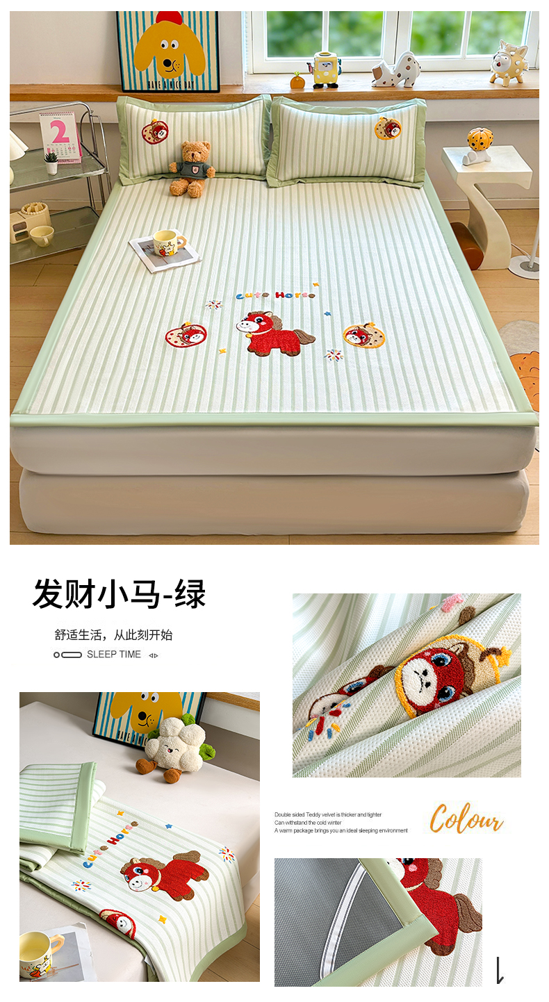 (总)雯豆家纺 2026新款PE中分子毛巾绣凉席三件套平铺席子卡通绣花条席,奔腾小马-蓝,奔腾小马-粉,发财小马-蓝,发财小马-绿,恐龙鸭-蓝,恐龙鸭-绿,软糖小KT-粉,软糖小KT-绿,三色熊-蓝,三色熊-绿,树懒-蓝,树懒-绿