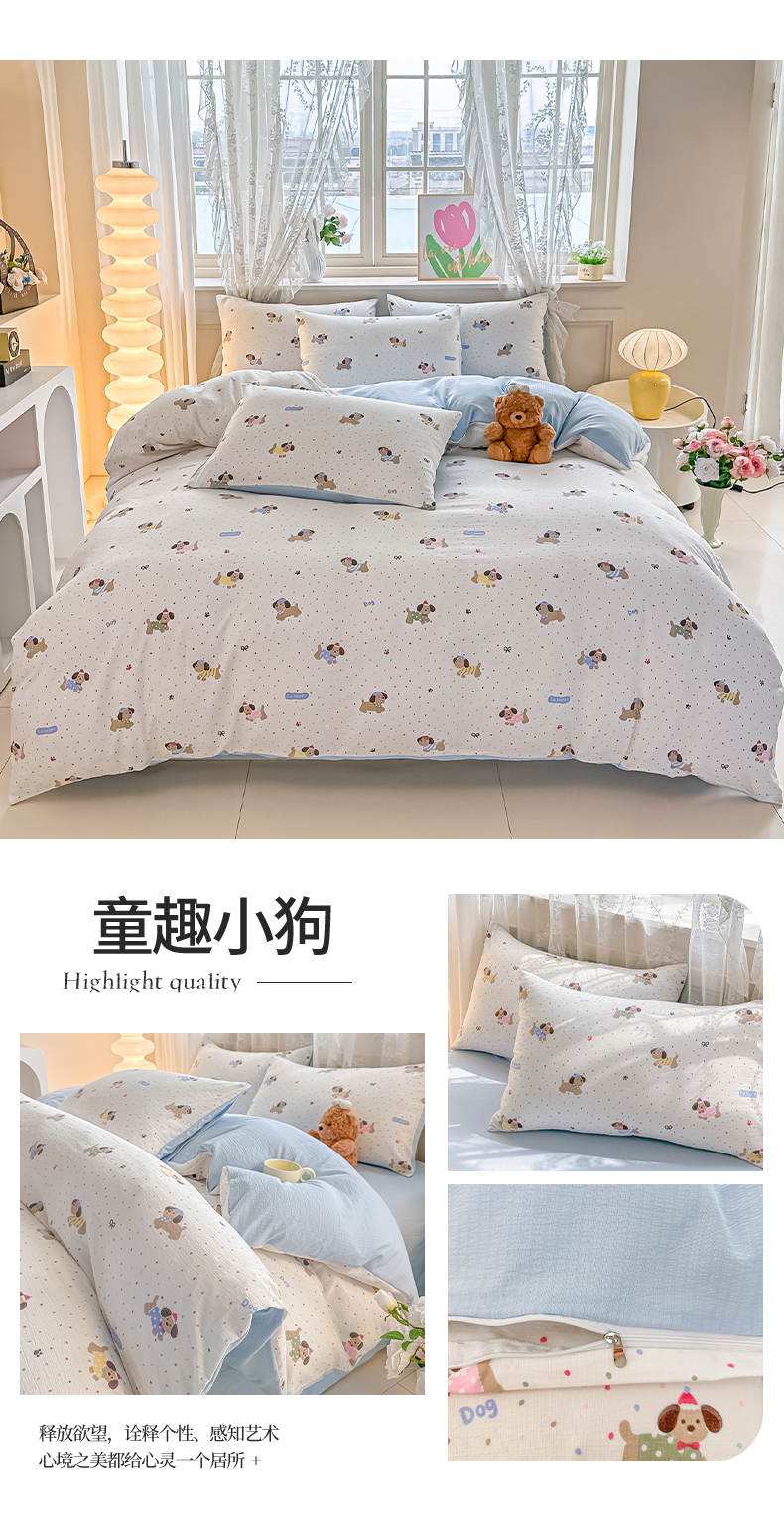 商品名称:侯先生家纺新款直播爆款云感双层纱皱皱纱单被套小清新水洗棉 童趣小狗