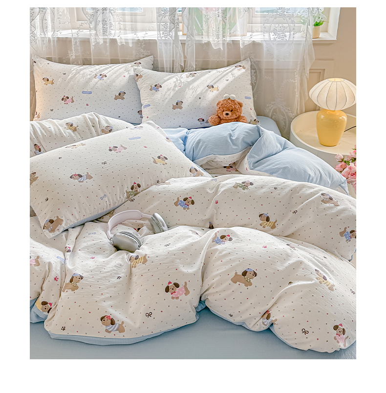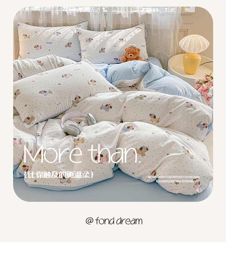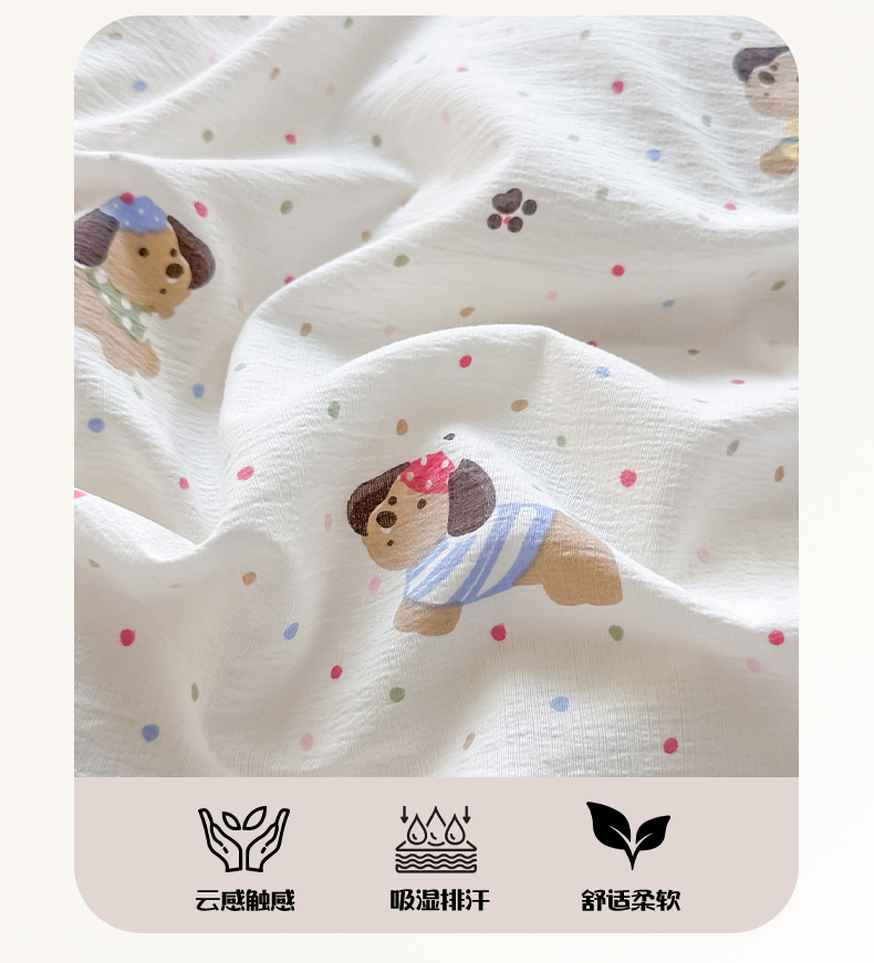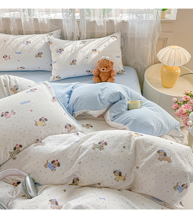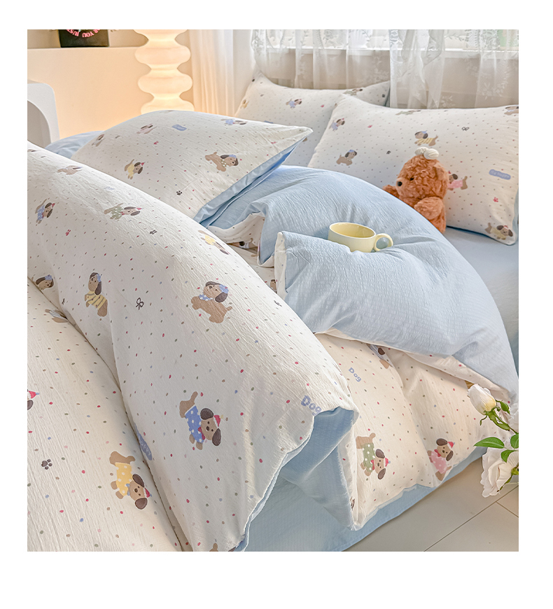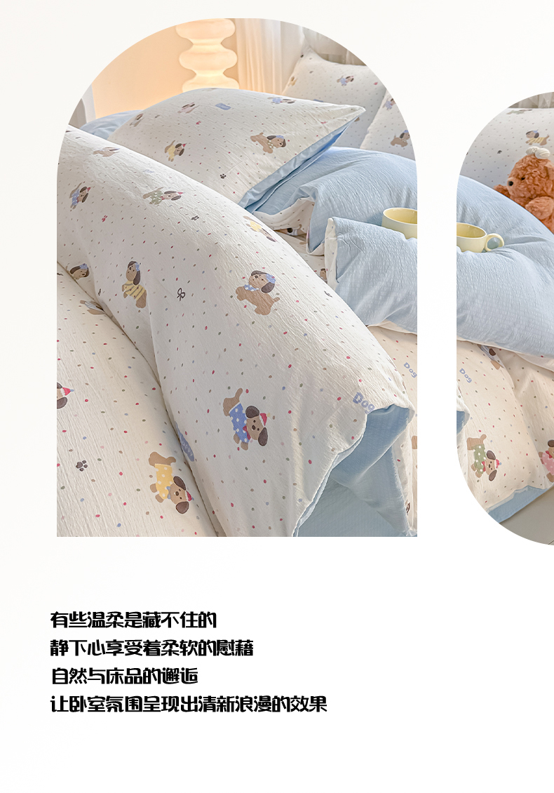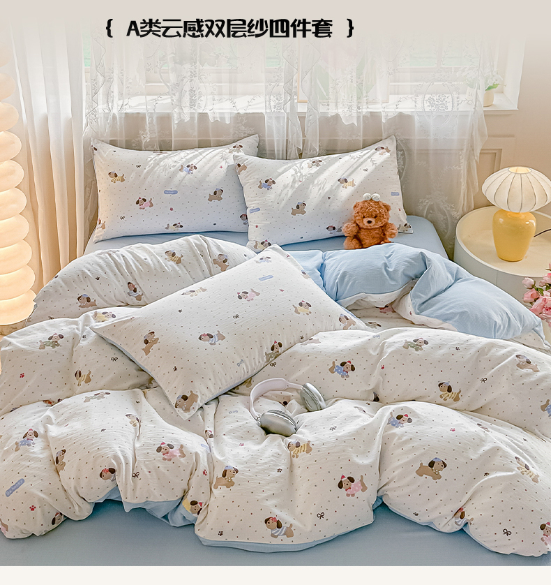 当前位置: 91家纺网 > 商品网购 > 床品套件 > 四件套 > 其它四件套 > 侯先生家纺新款直播爆款云感双层纱皱皱纱四件套小清新水洗棉床笠 童趣小狗