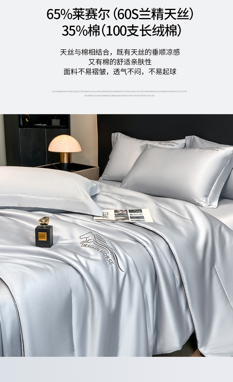 当前位置: 91家纺网 > 商品网购 > 床品套件 > 四件套 > 莱赛尔四件套 > 新方向 2026新款刺绣A类20%蚕丝天丝棉夏被四件套一马当先 一马当先-朦胧灰
