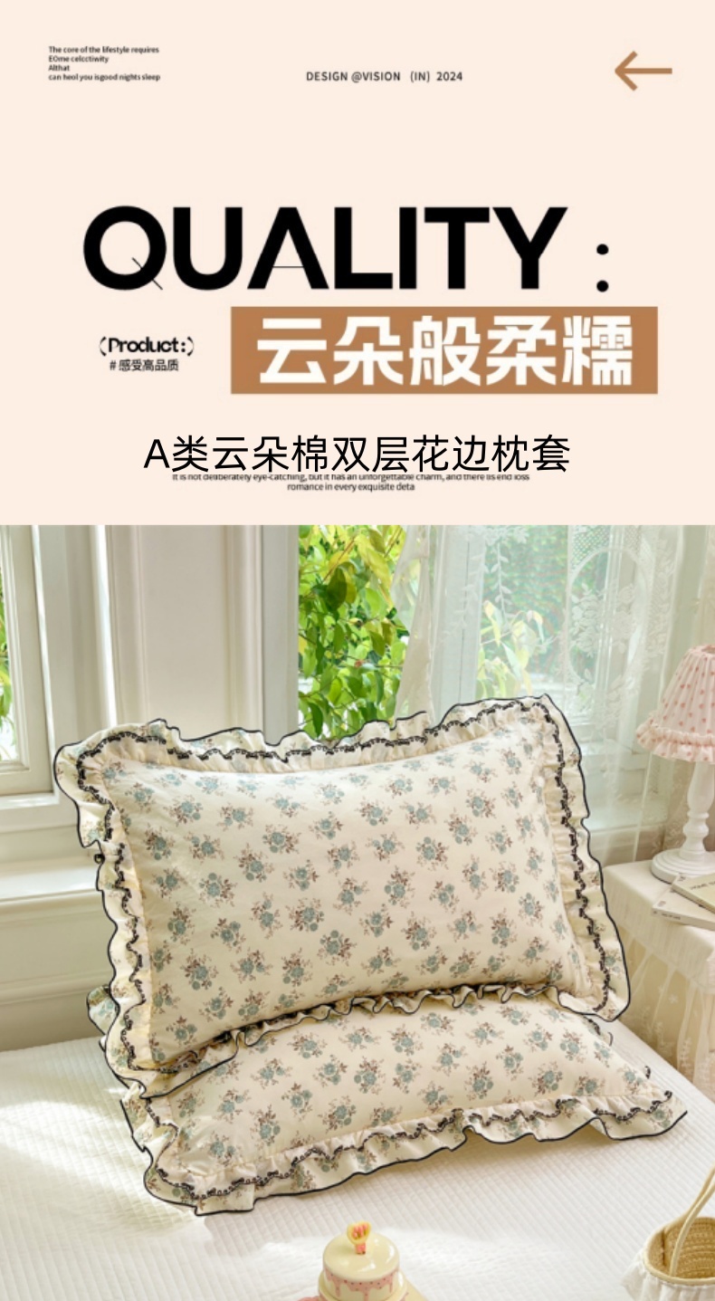 (总)圣比熊 2026新款A类云朵棉蕾丝双层花边枕套宿舍单人单只一只装枕芯48x74cm内胆套,浮影,花时令,花田洛,蓝岛风铃,黎梦,绿涧,苏颜粉,幸运熊,旋转木马,樱桃花语