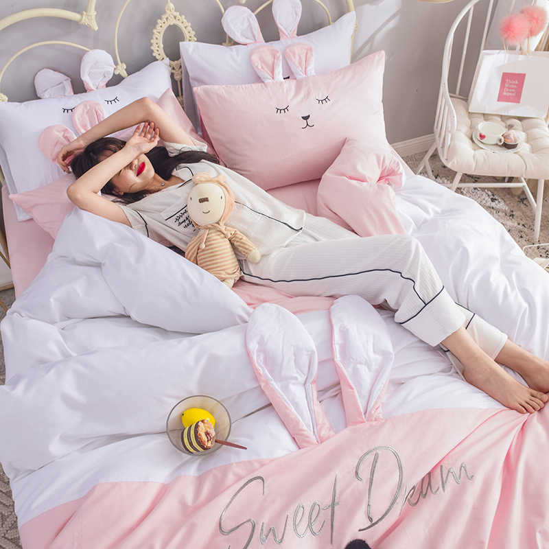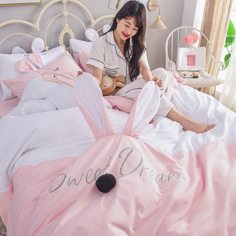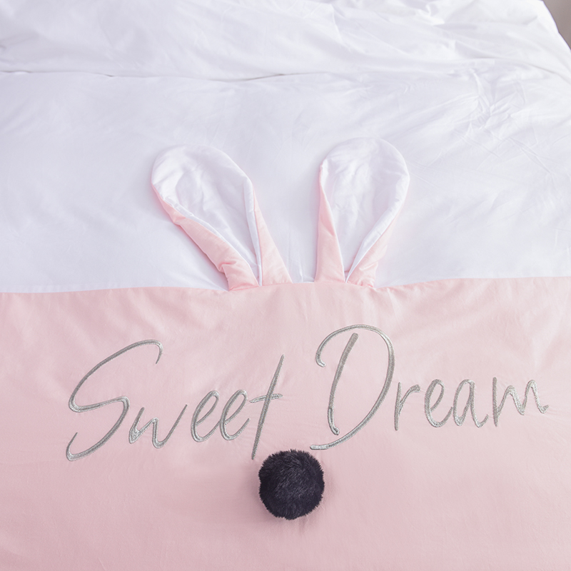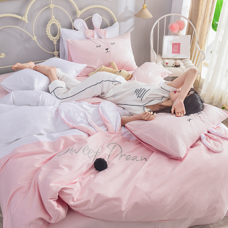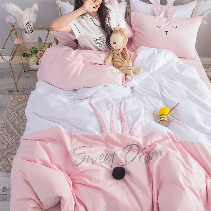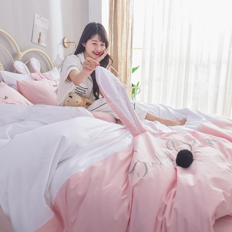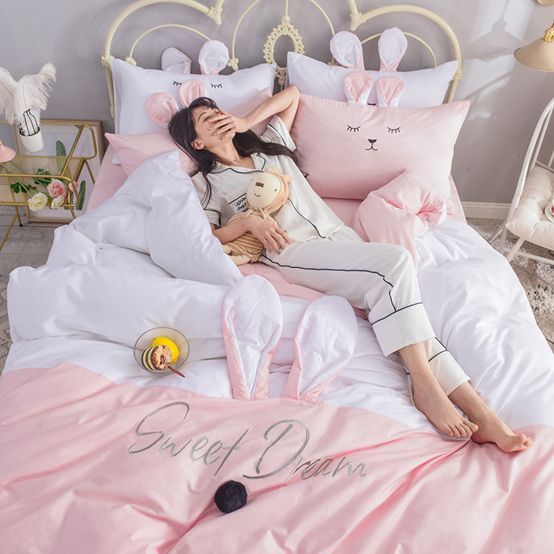 漫调家纺 2019新款ins爆款全棉兔耳朵四件套 甜心粉-白