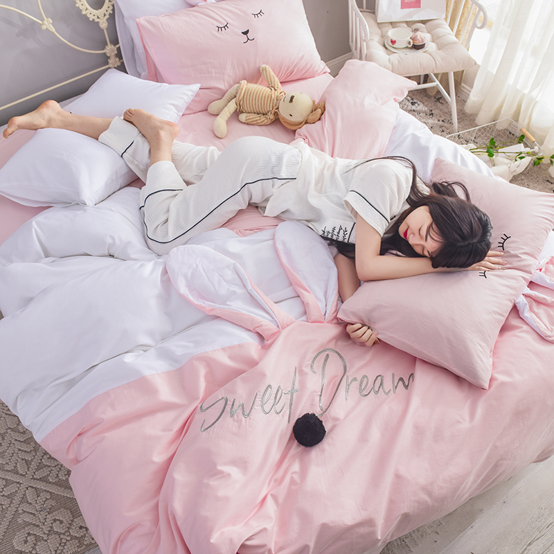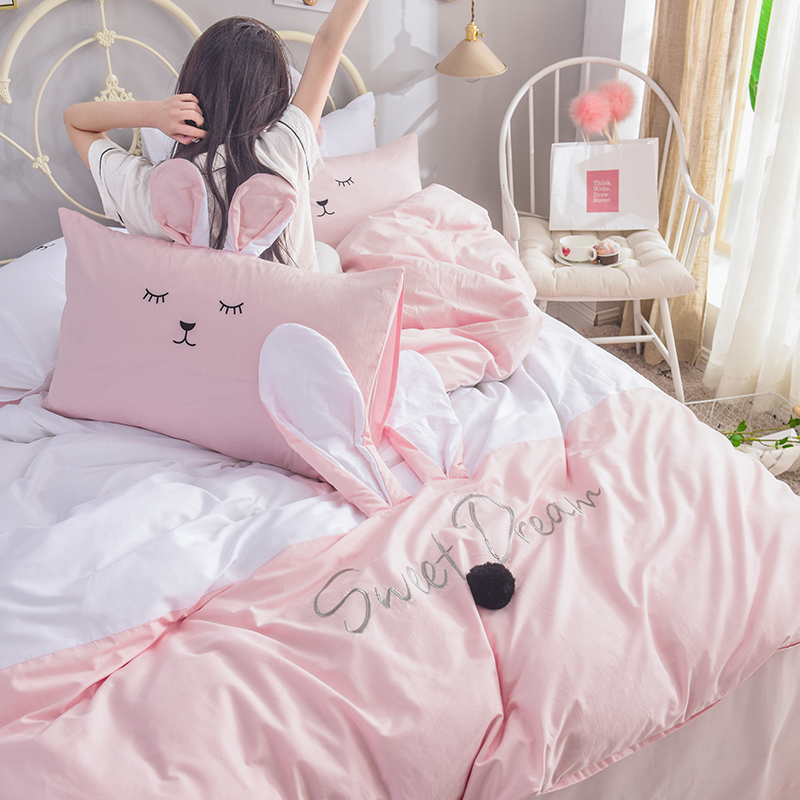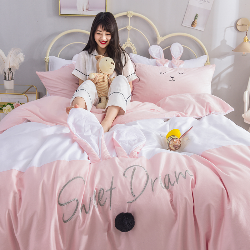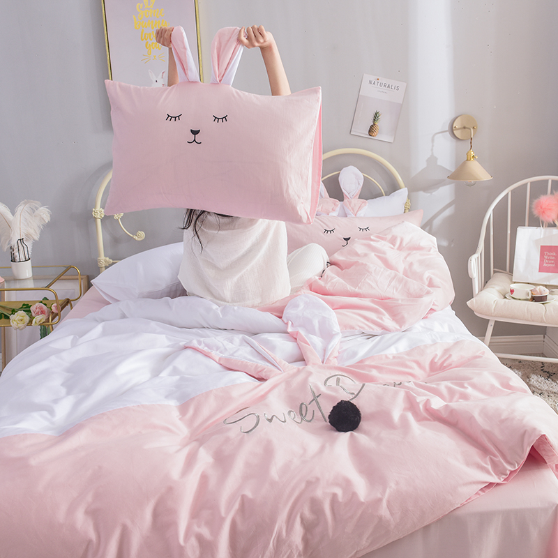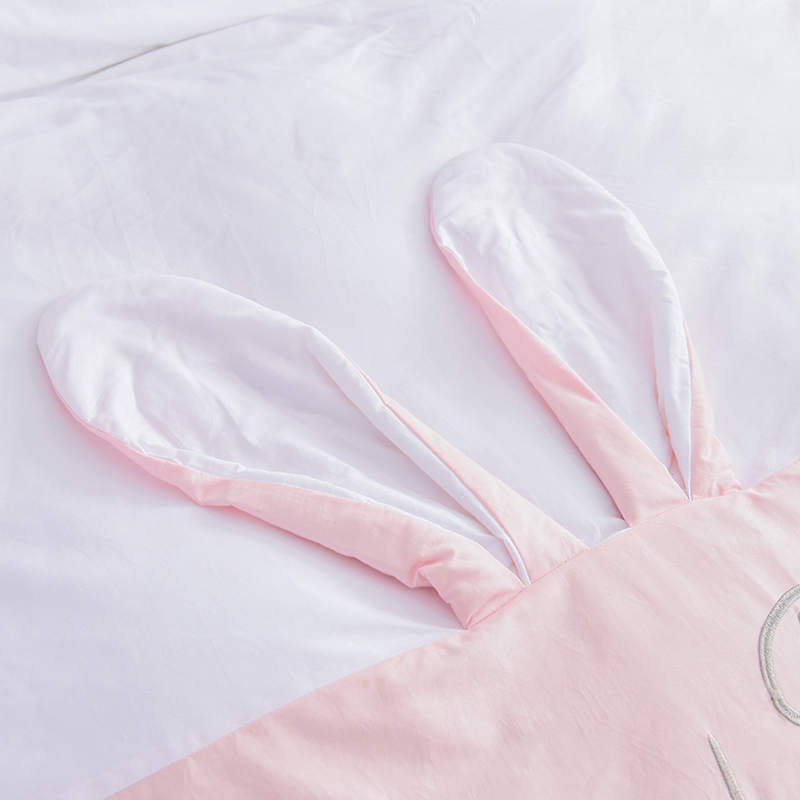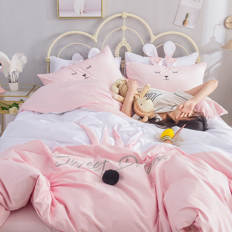 漫调家纺 2019新款ins爆款全棉兔耳朵四件套 甜心粉-白