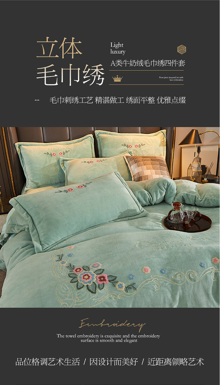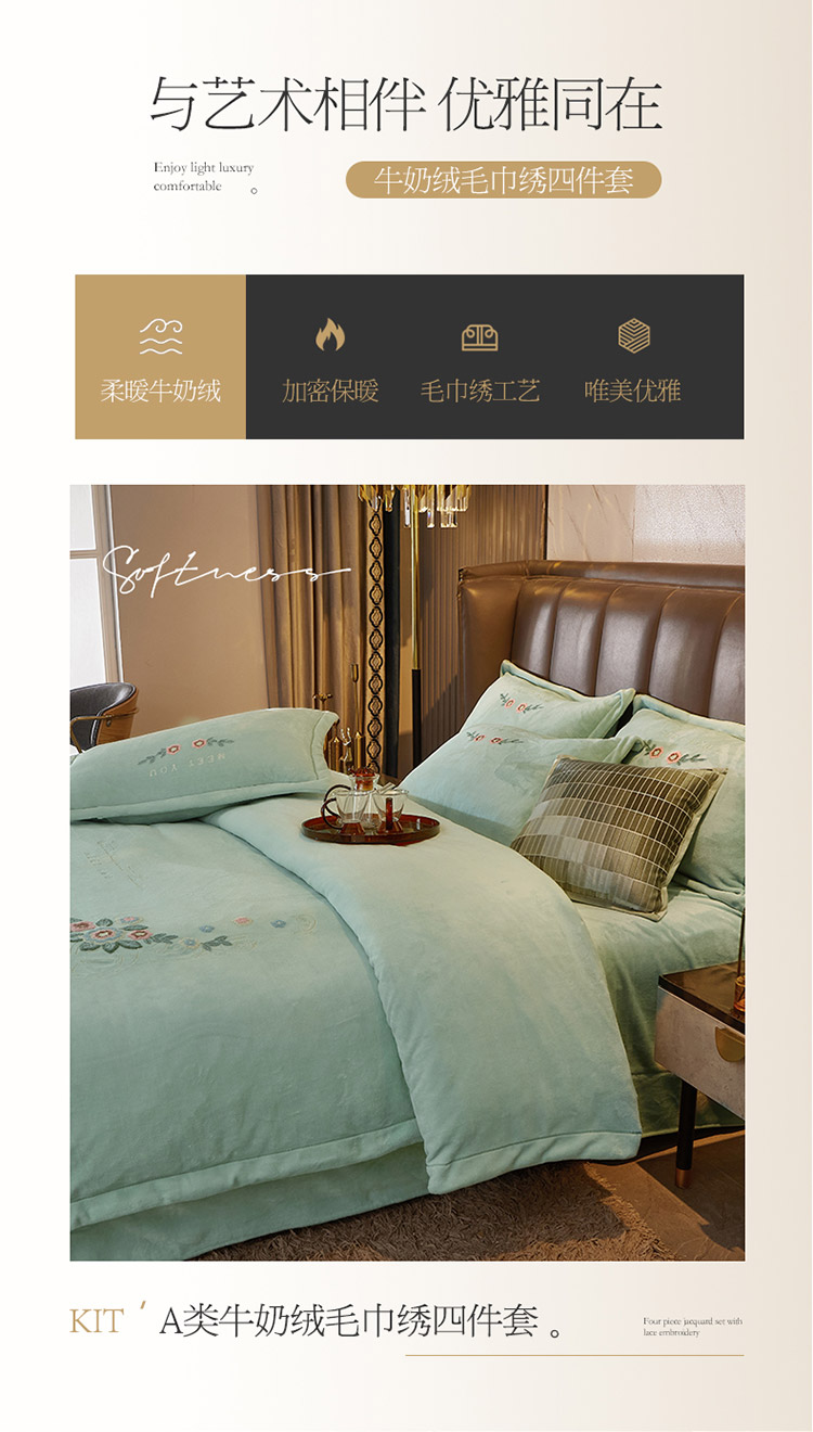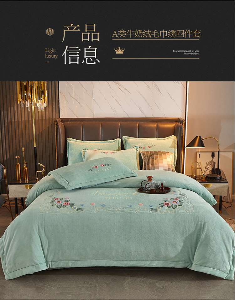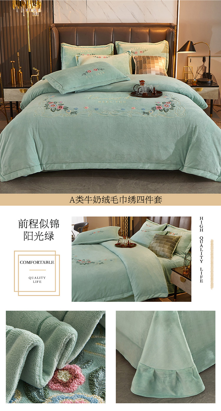 2024新款220克加厚牛奶绒一字绣四件套 前程似锦-浅绿