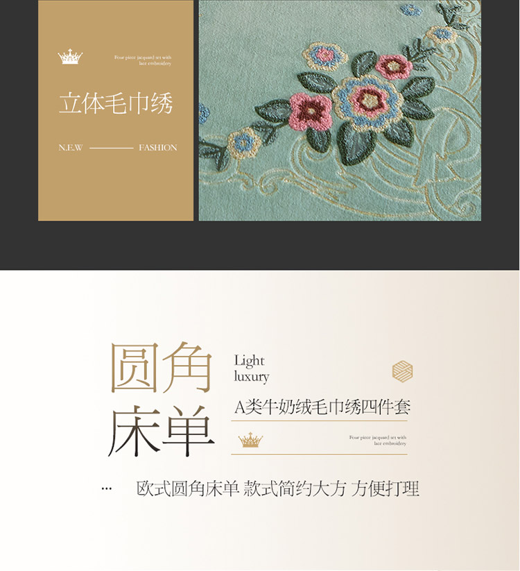 (总)金窝窝家纺 2024新款婴儿级牛奶绒拼接刺绣烂花雕花绒四件套--朱丽叶系列,朱丽叶-粉,朱丽叶-灰,朱丽叶-咖,朱丽叶-蓝,朱丽叶-绿