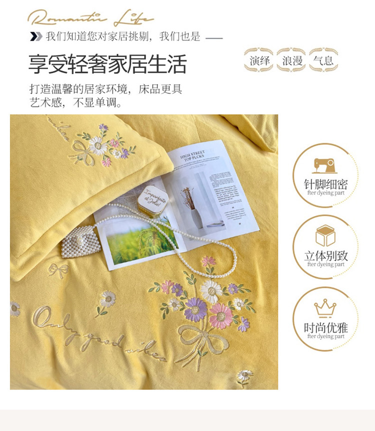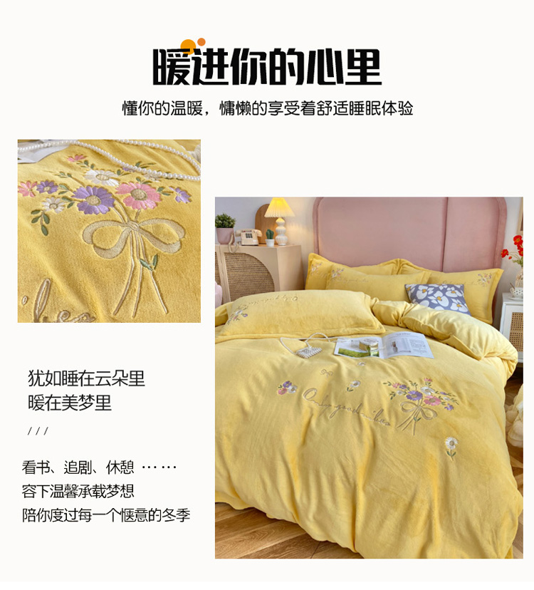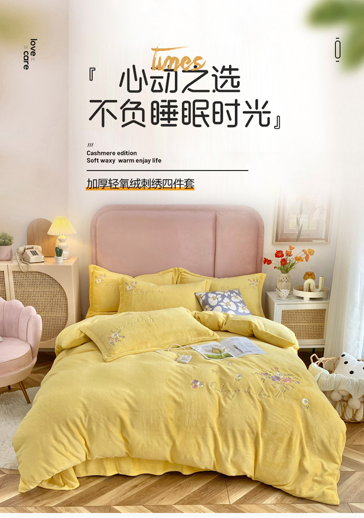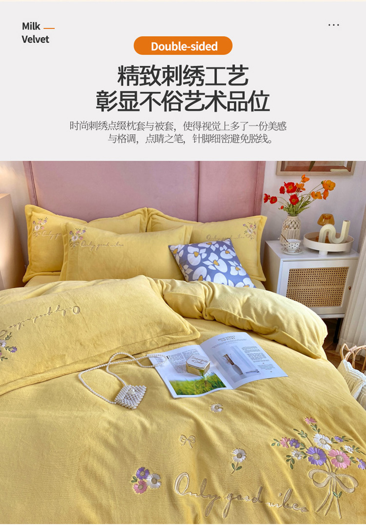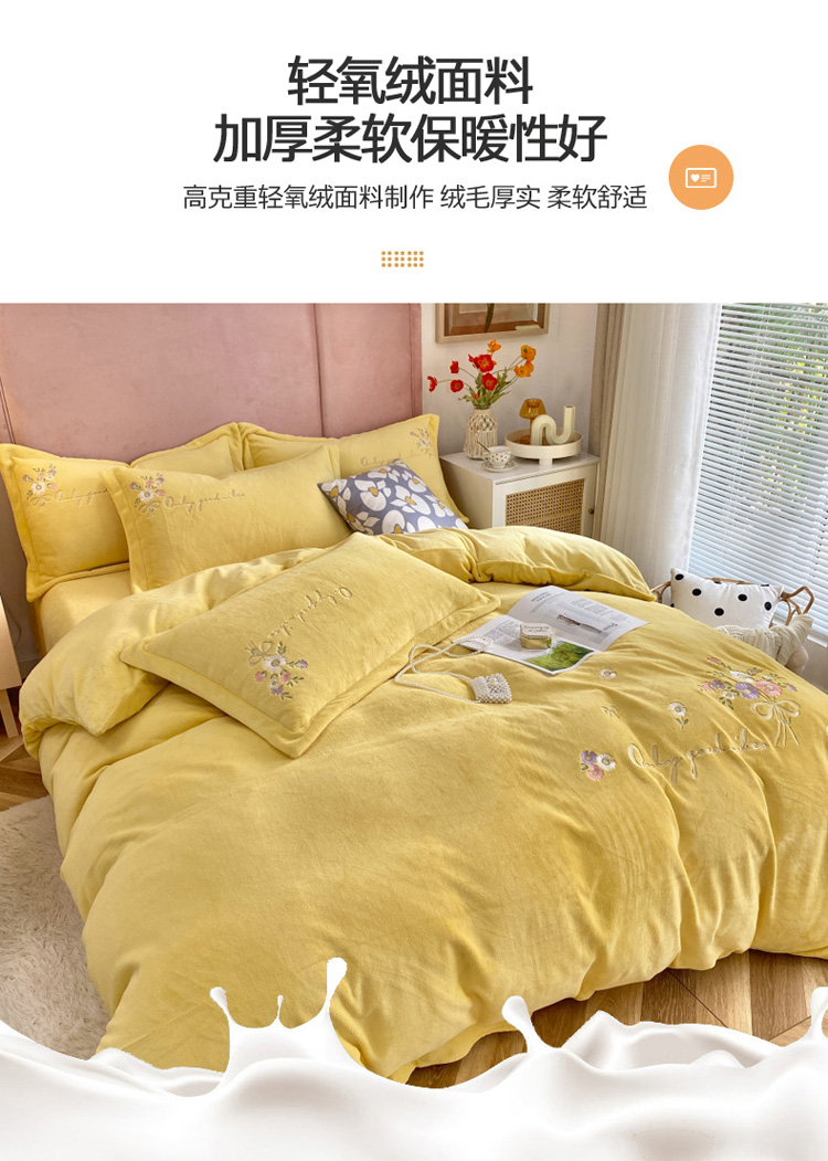商品名称:星尚家纺 2021新款轻氧绒A类牛奶棉绒加厚绣花四件套 奶油黄