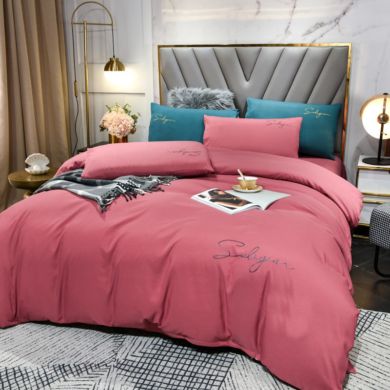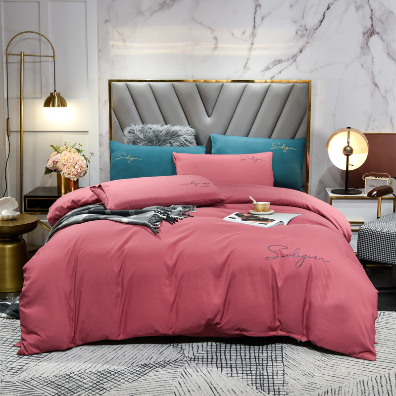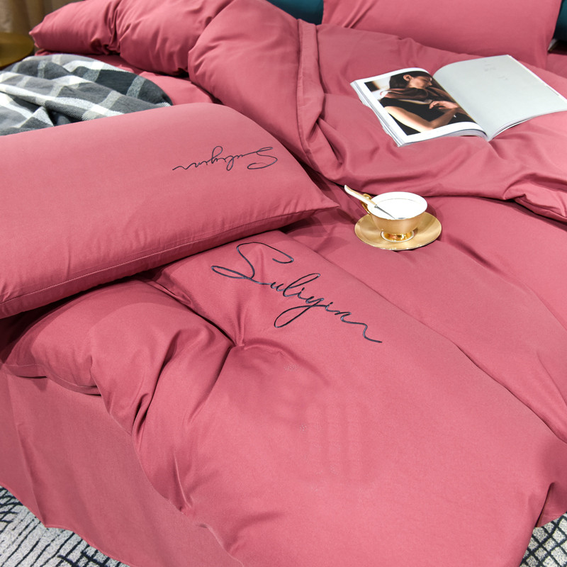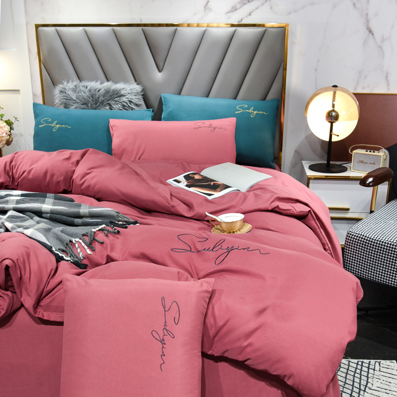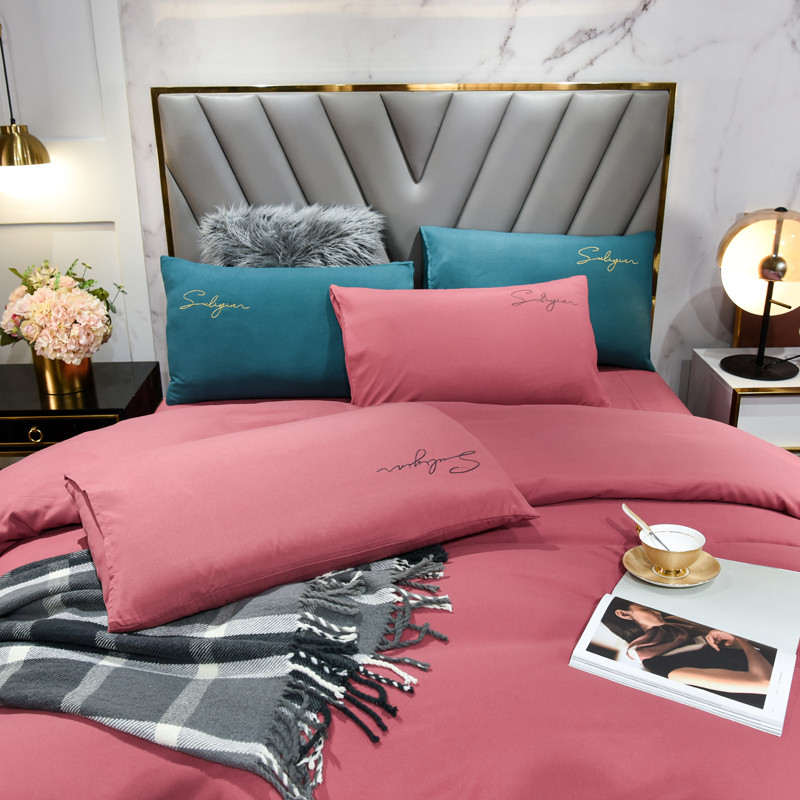 孟鑫家纺 2021新款加厚纯色刺绣磨毛四件套 紫嫣红