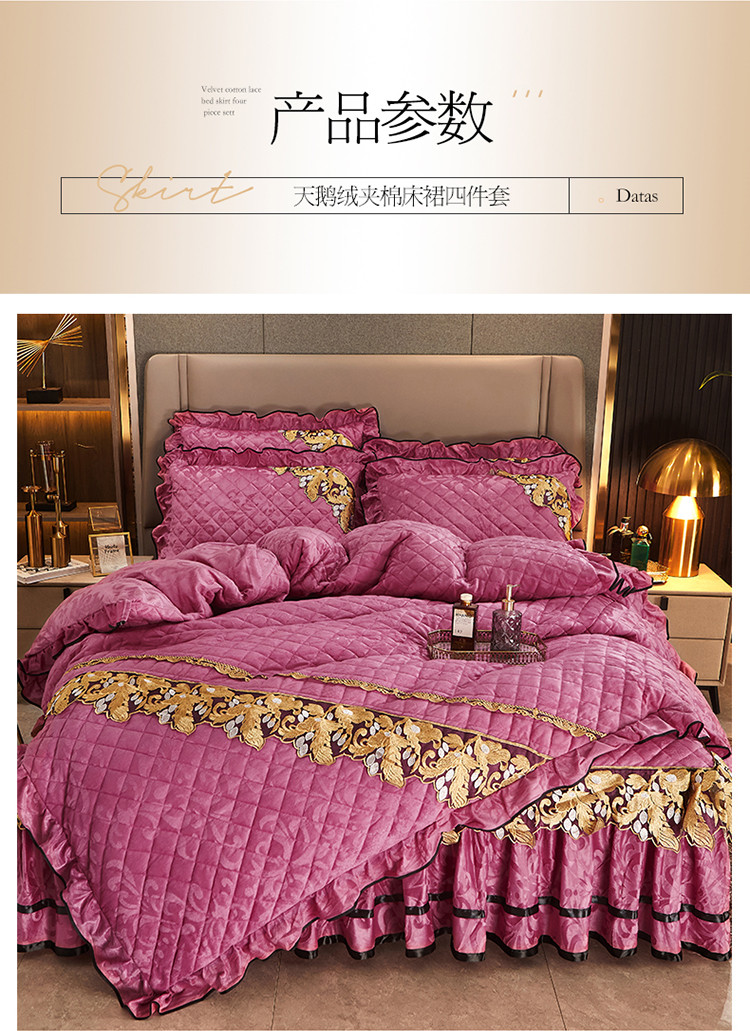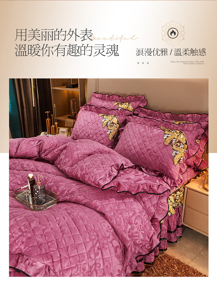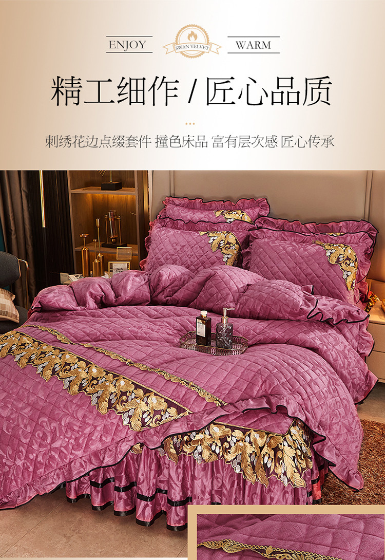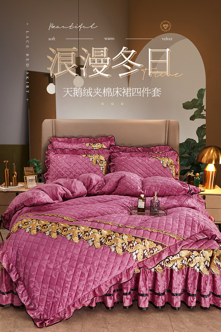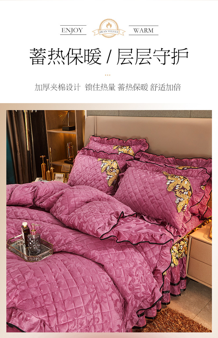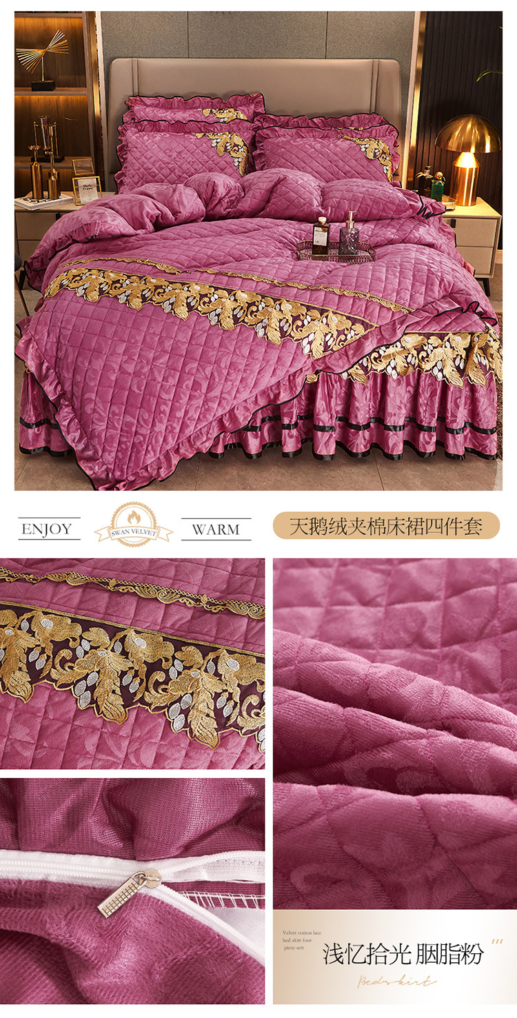 网红馆2025新款天鹅绒夹棉床裙四件套 浅忆拾光-胭脂粉