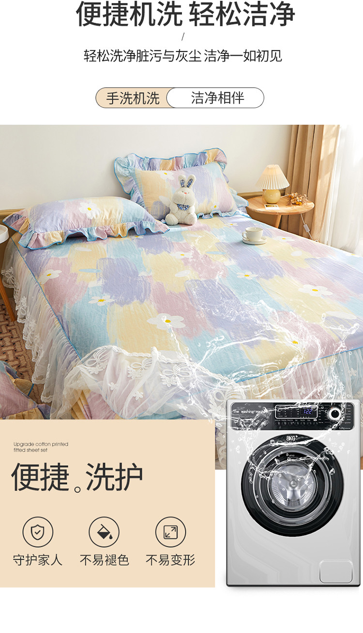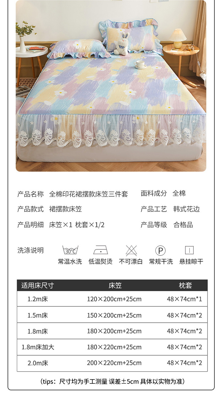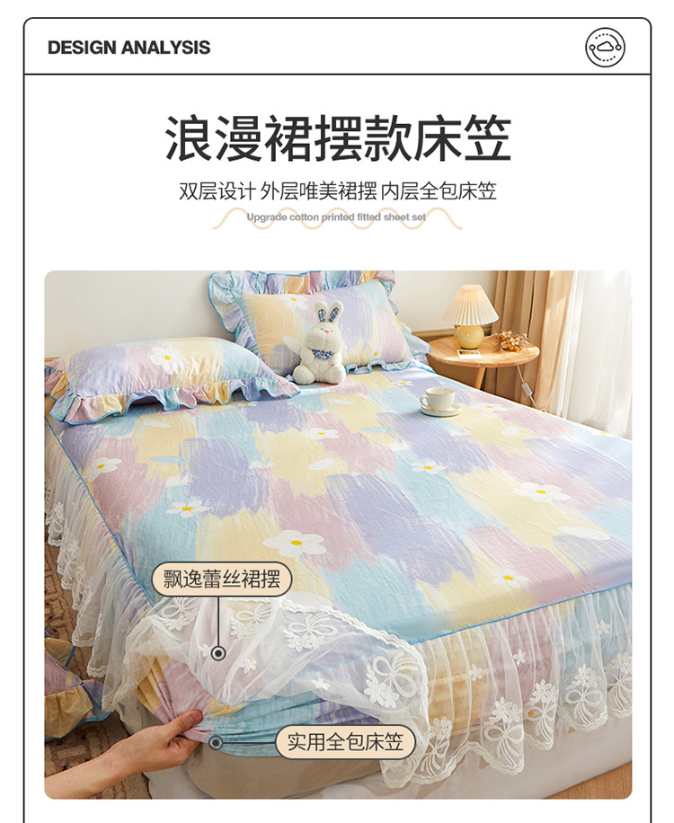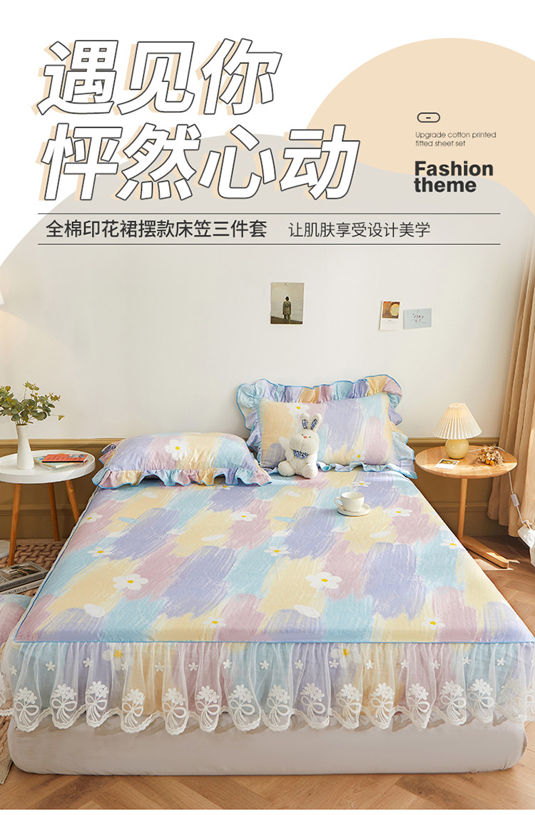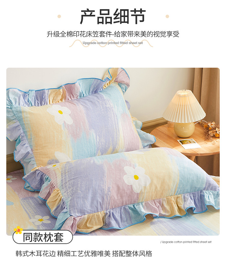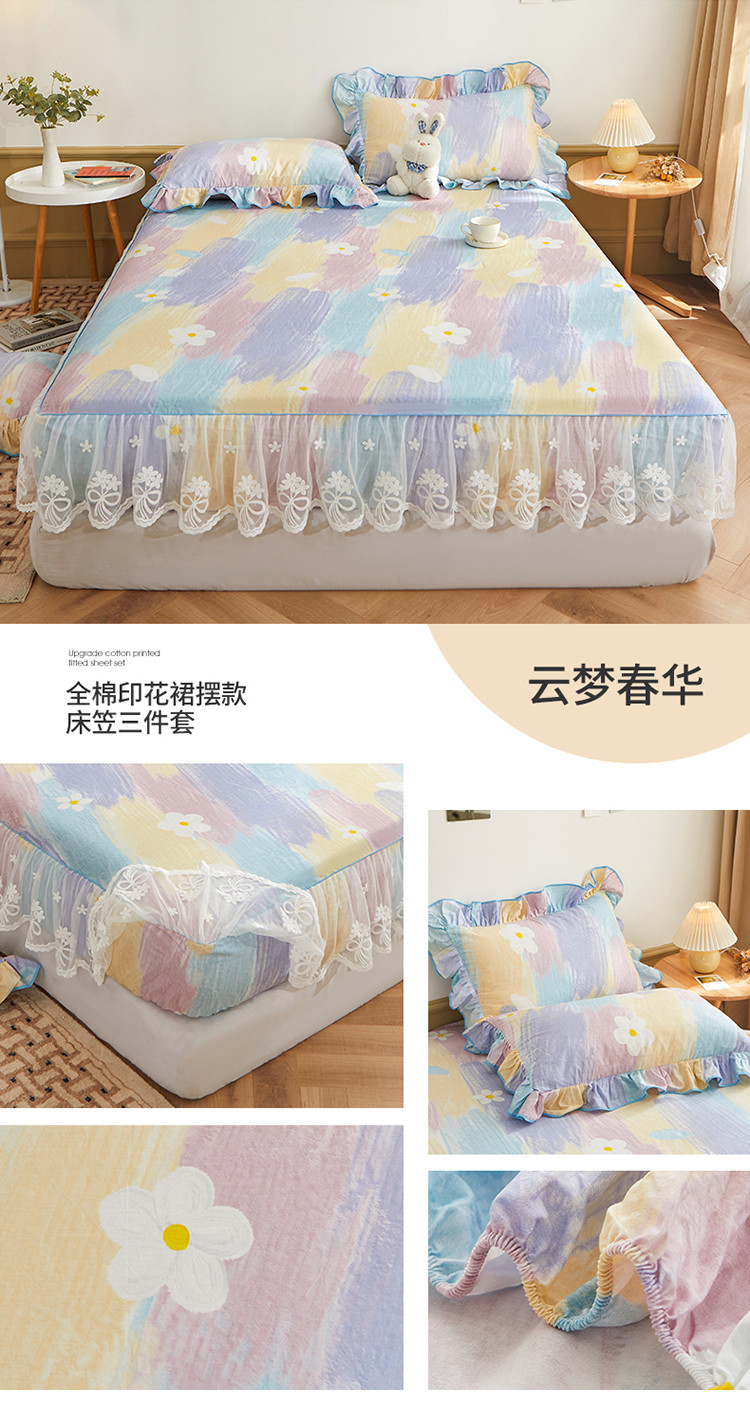 当前位置: 91家纺网 > 商品网购 > 床品套件 > 三件套 > 宜凡 2023新款全棉印花单层裙边系列-床笠三件套 云梦春华