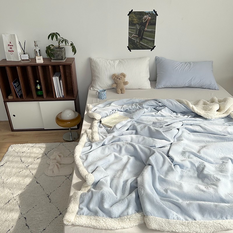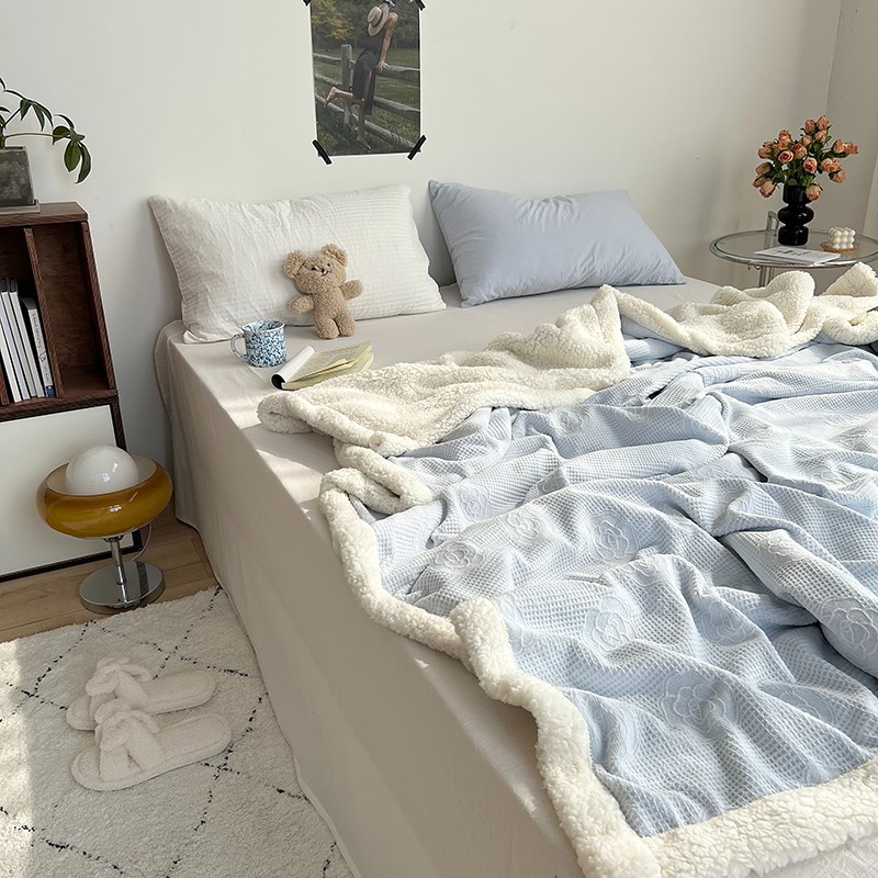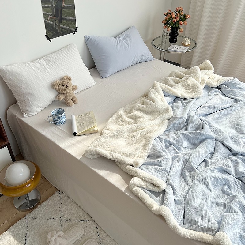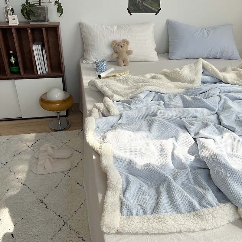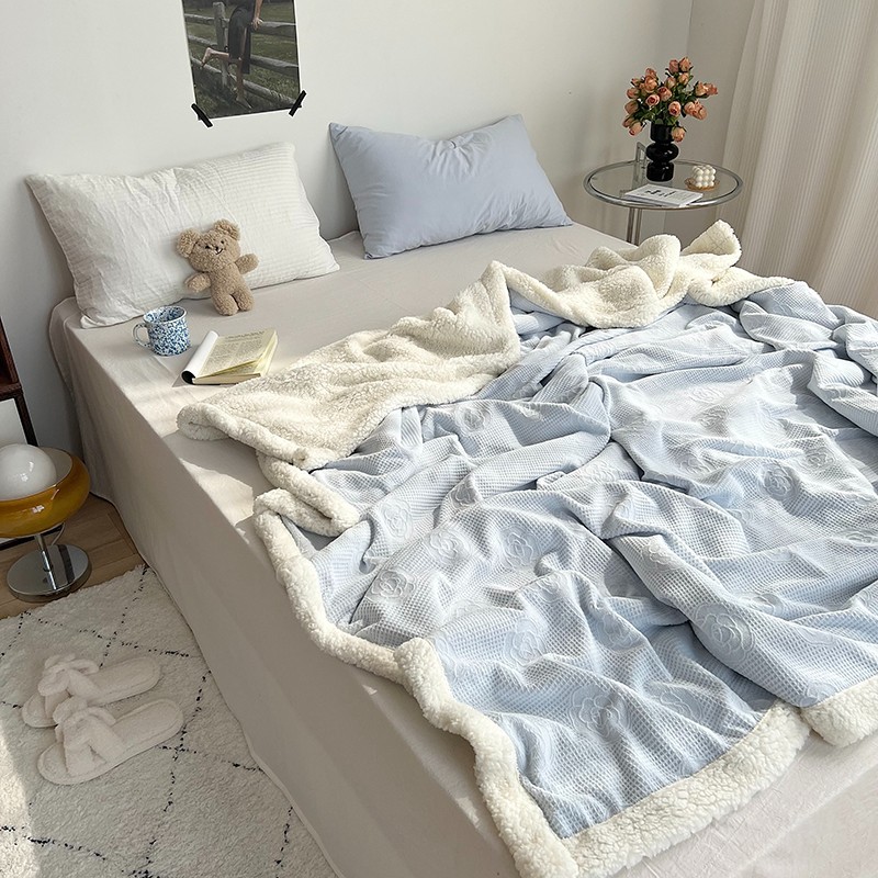 商品名称:六巷胡同 2022新款山茶花牛奶绒拼羊羔绒毯 浅蓝