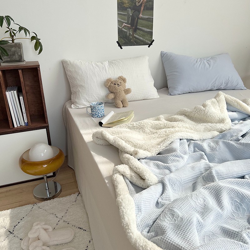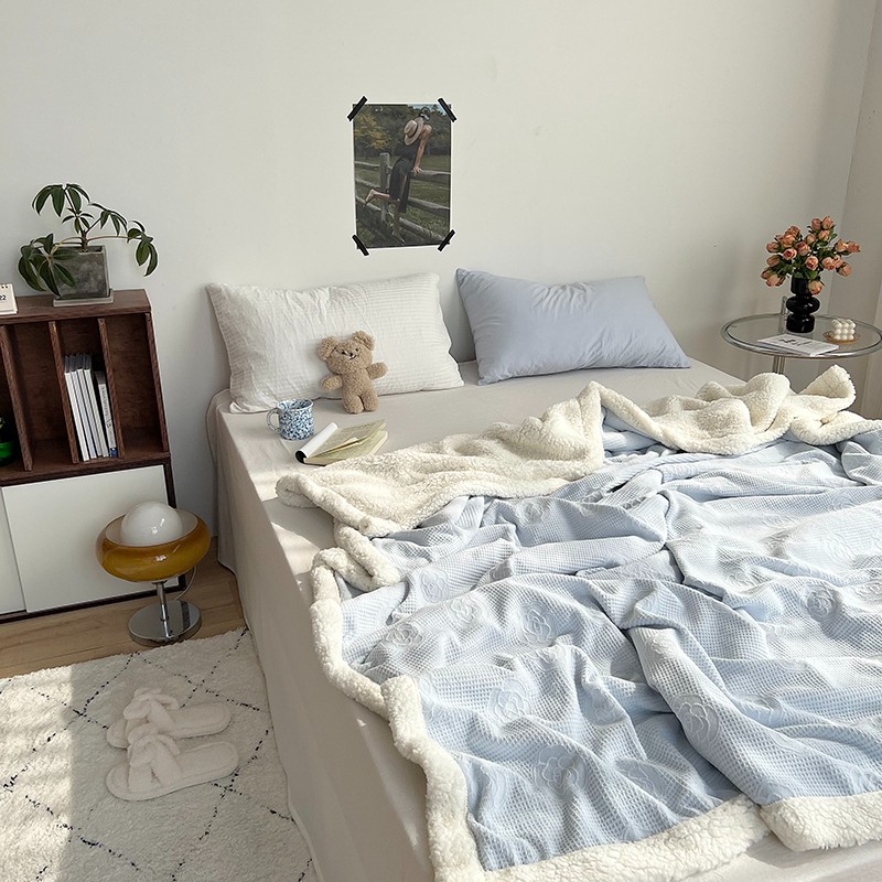 六巷胡同 2022新款山茶花牛奶绒拼羊羔绒毯 浅蓝