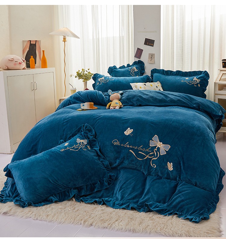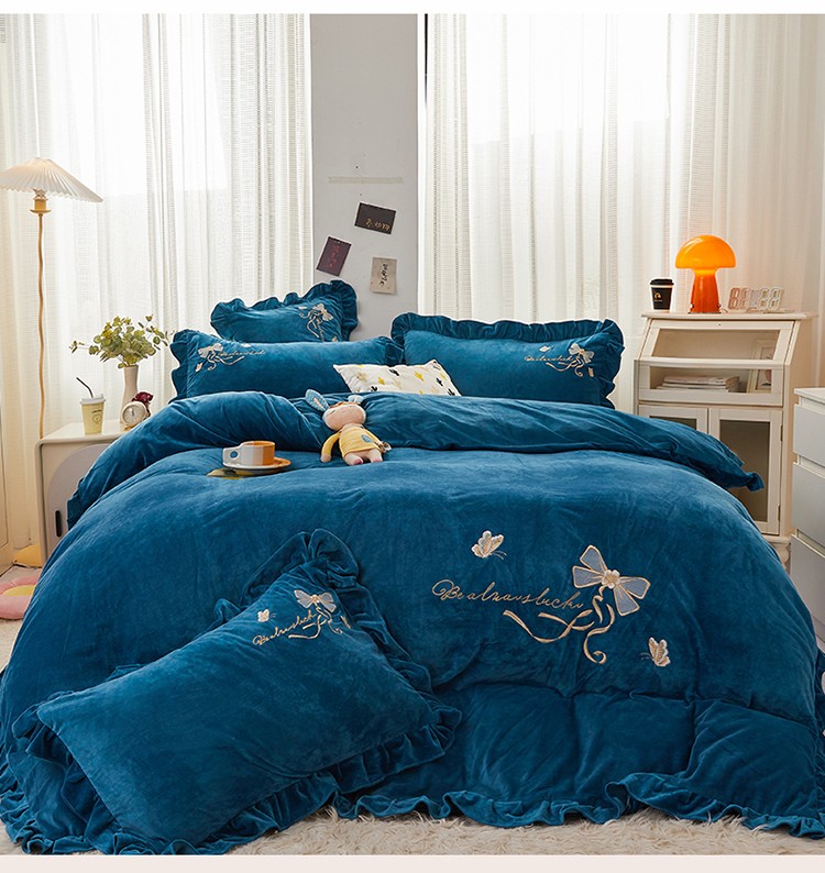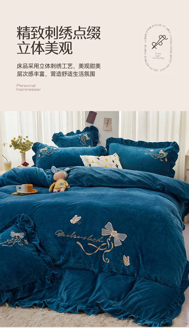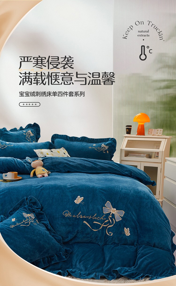 恒爱 2022秋冬新款A类宝宝绒蝴蝶结刺绣床单款四件套 宝蓝