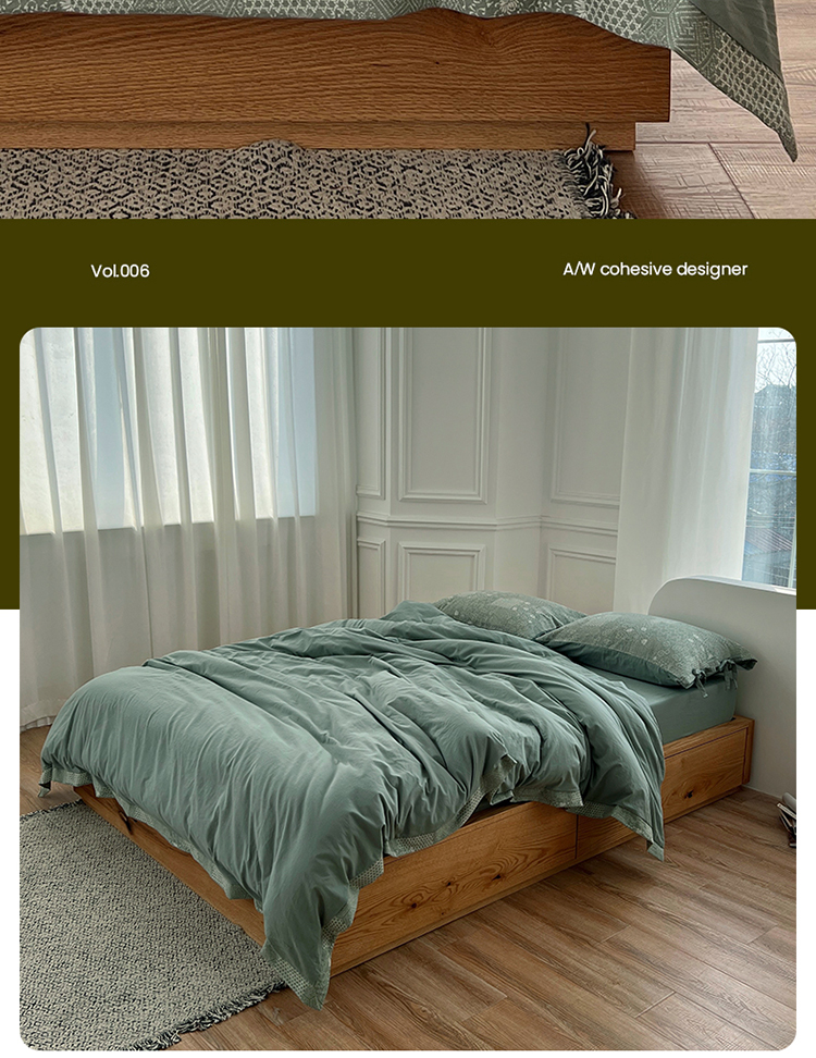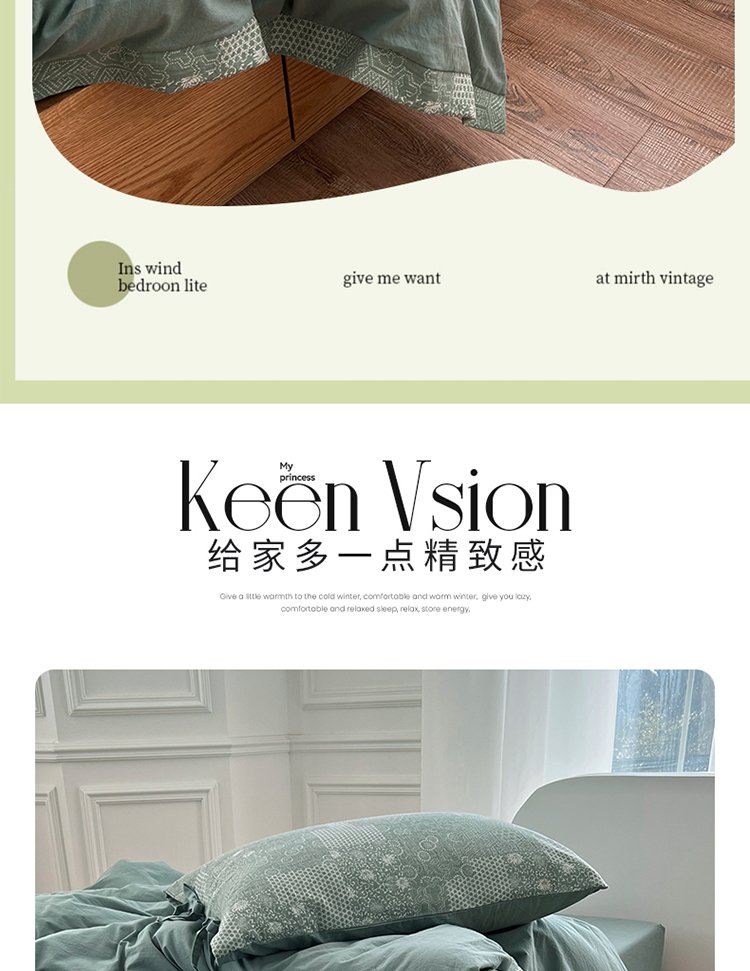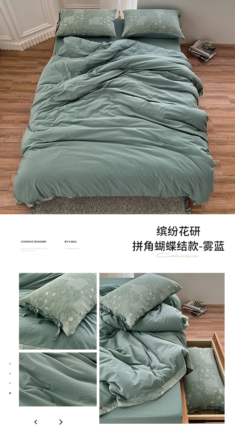 安莱生活 2023新款全棉色织水洗棉宽边拼角蝴蝶结款四件套-缤纷花研 缤纷华妍-灰绿